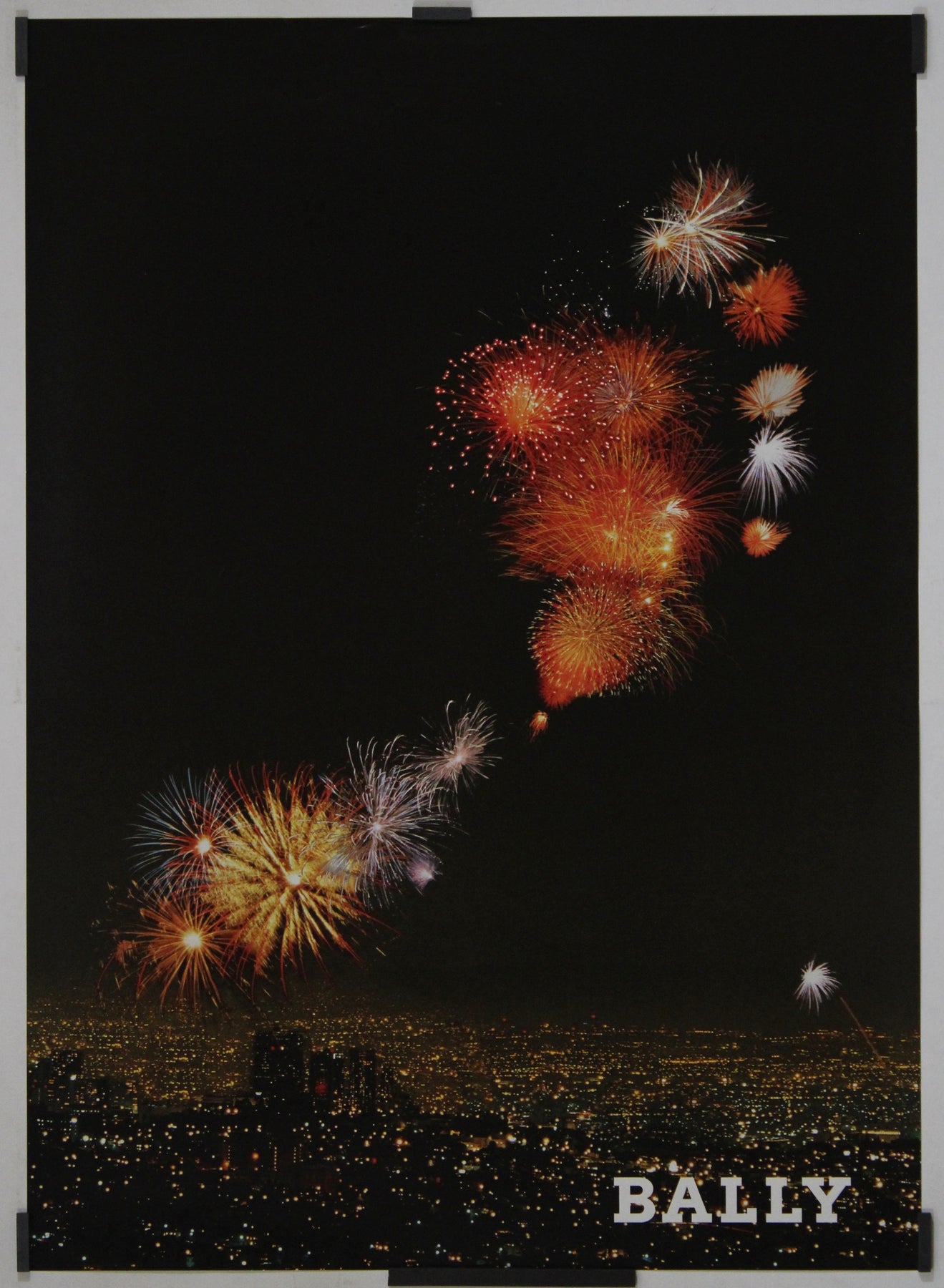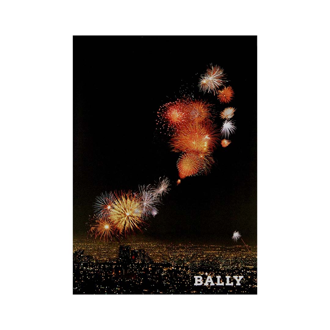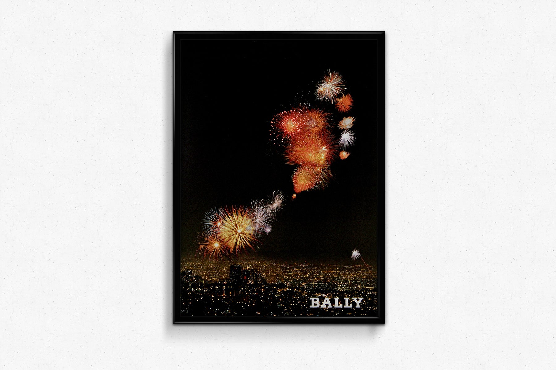 L'affiche présente un magnifique paysage urbain nocturne, illuminé par un feu d'artifice époustouflant qui dessine la silhouette d'un pied – une brillante représentation artistique de la chaussure emblématique de la marque. Le contraste entre le ciel sombre et les éclats de lumière vibrants captive le regard et symbolise le dynamisme, le prestige et l'esprit festif de l'héritage Bally.