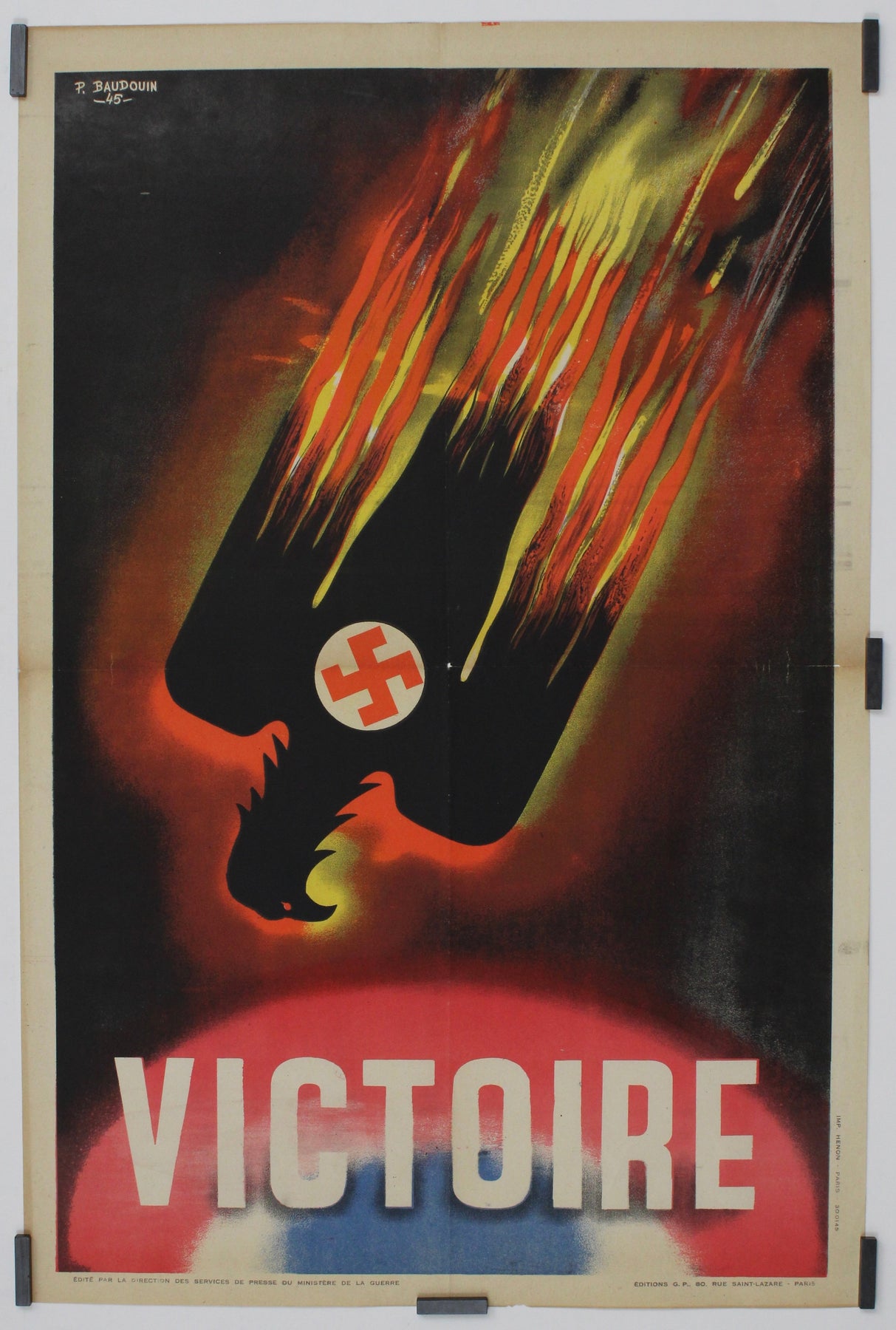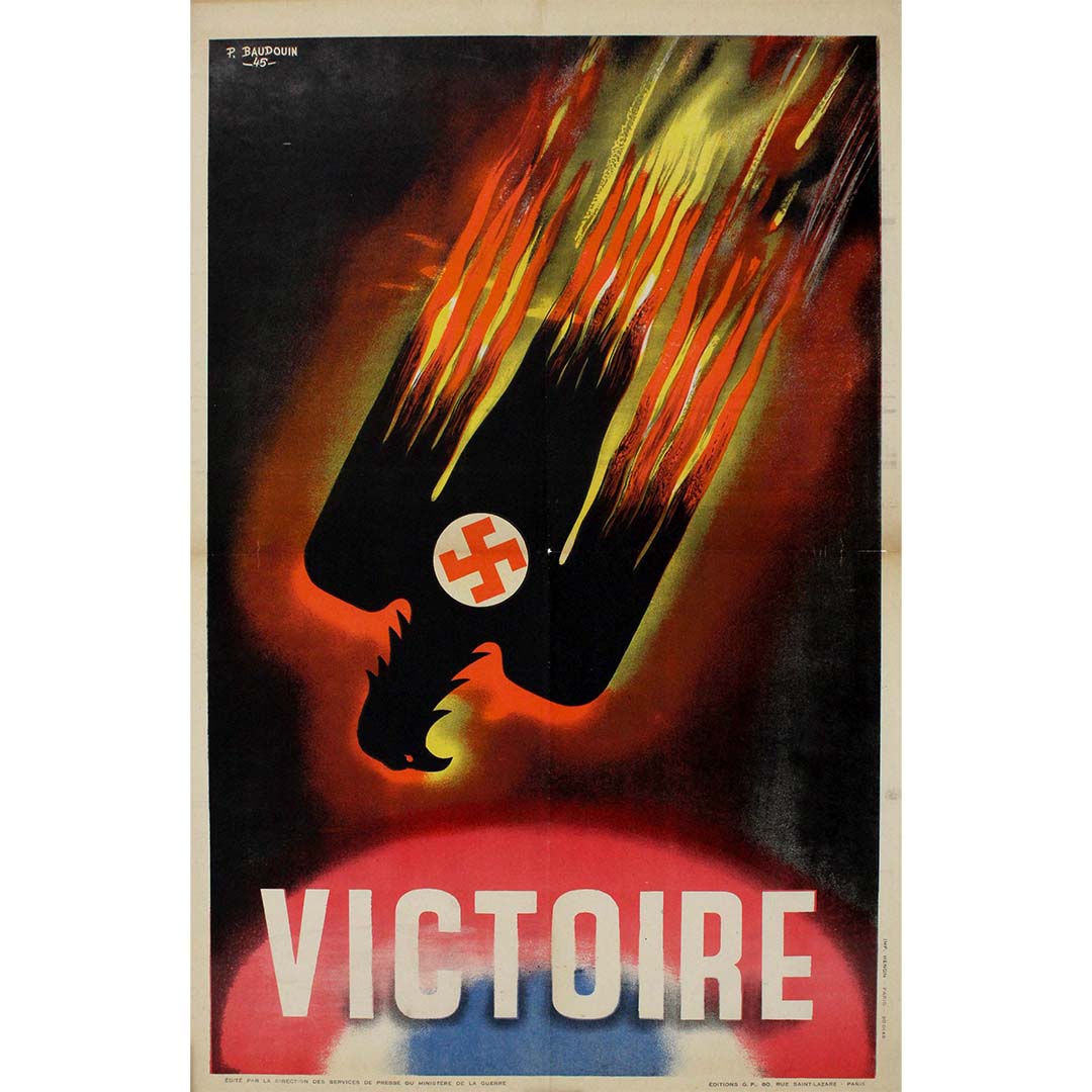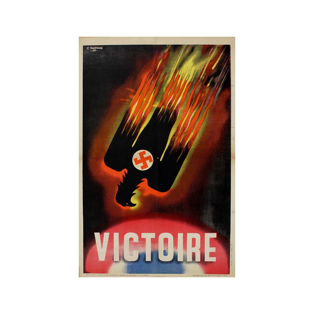 En 1945, au lendemain de la Seconde Guerre mondiale, l'artiste français Pierre Baudouin créa une affiche de victoire poignante, symbole du triomphe sur les forces oppressives du nazisme. L'œuvre présente une image forte : un aigle, portant le poids de la croix gammée nazie, descendant en signe de défaite.