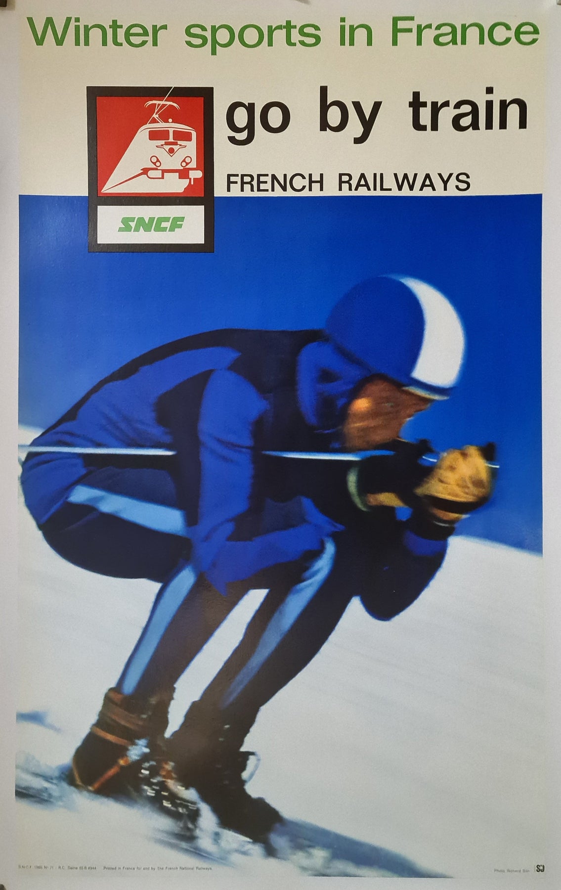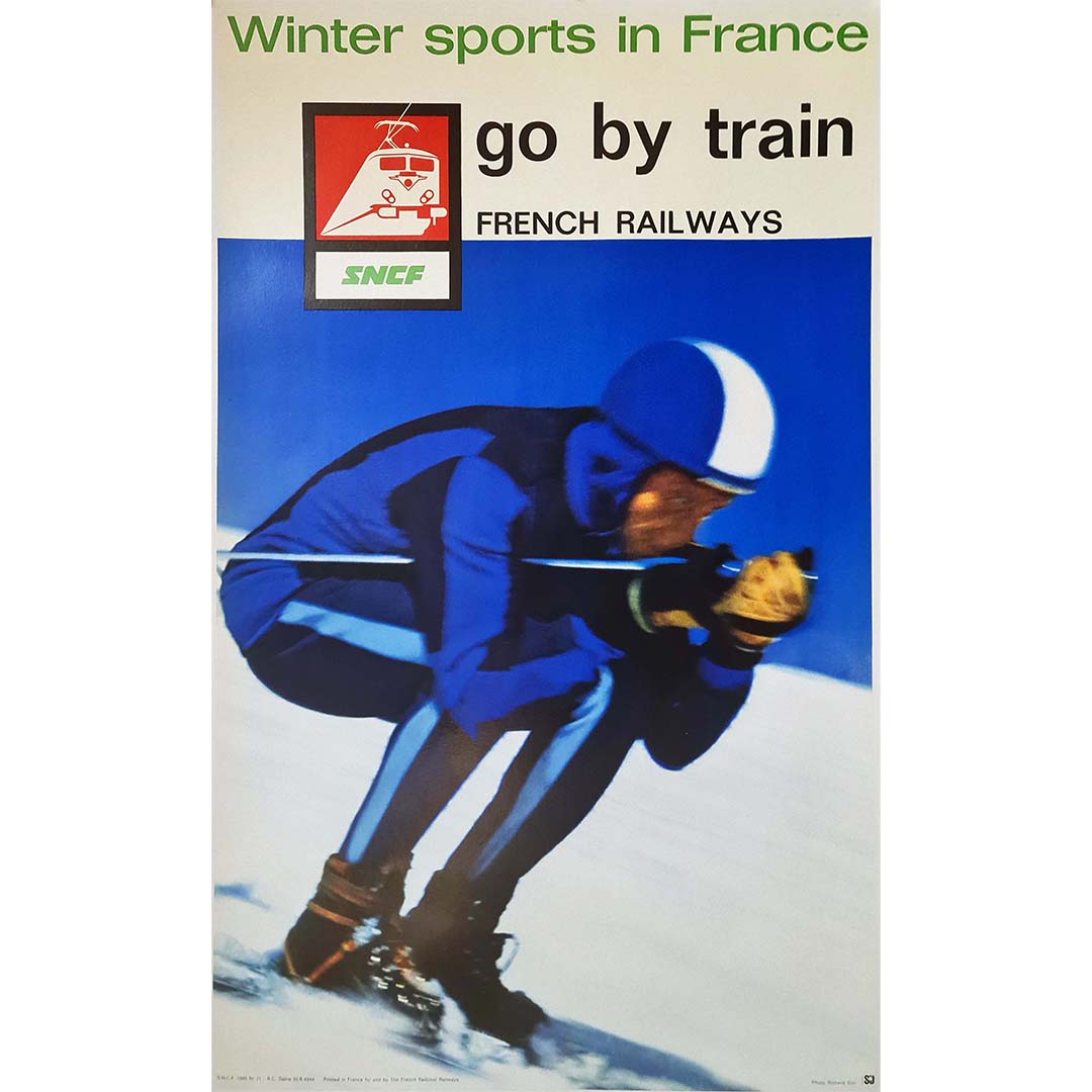 L'affiche originale de Richard Blin pour la SNCF (Compagnie nationale des chemins de fer français) capture l'attrait des sports d'hiver en France et encourage les voyages en train vers ces destinations pittoresques. Commandée par la SNCF, cette œuvre de Blin illustre l'esthétique du graphisme du milieu du XXe siècle tout en évoquant l'enthousiasme et l'aventure liés aux loisirs d'hiver.