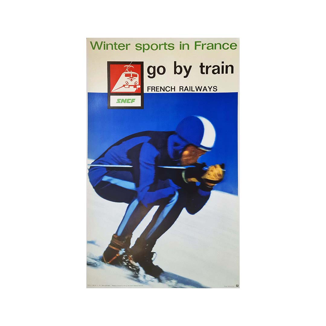 L'image est accompagnée du slogan « Voyagez en train », soulignant la praticité et l'accessibilité du transport ferroviaire pour les amateurs de sports d'hiver. Le logo de la SNCF, mis en évidence, renforce le message et rappelle le rôle de la compagnie ferroviaire dans la facilitation des déplacements à travers la France.