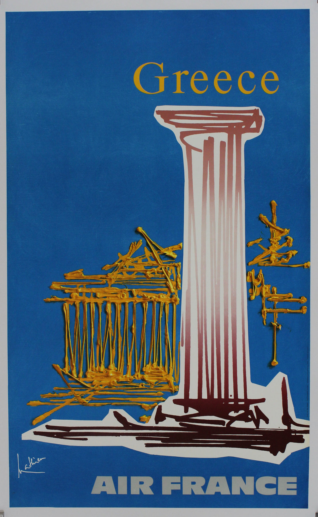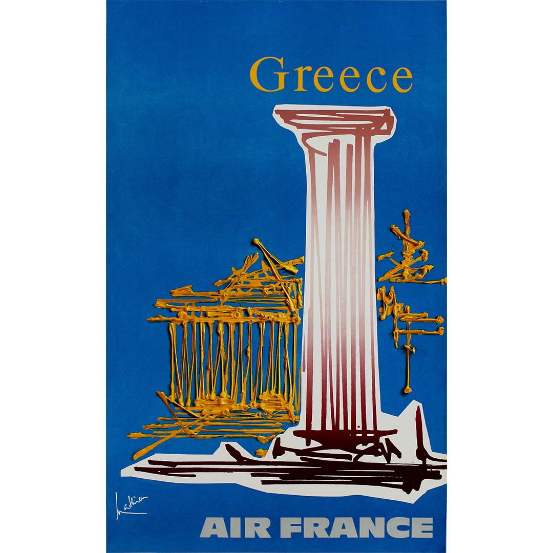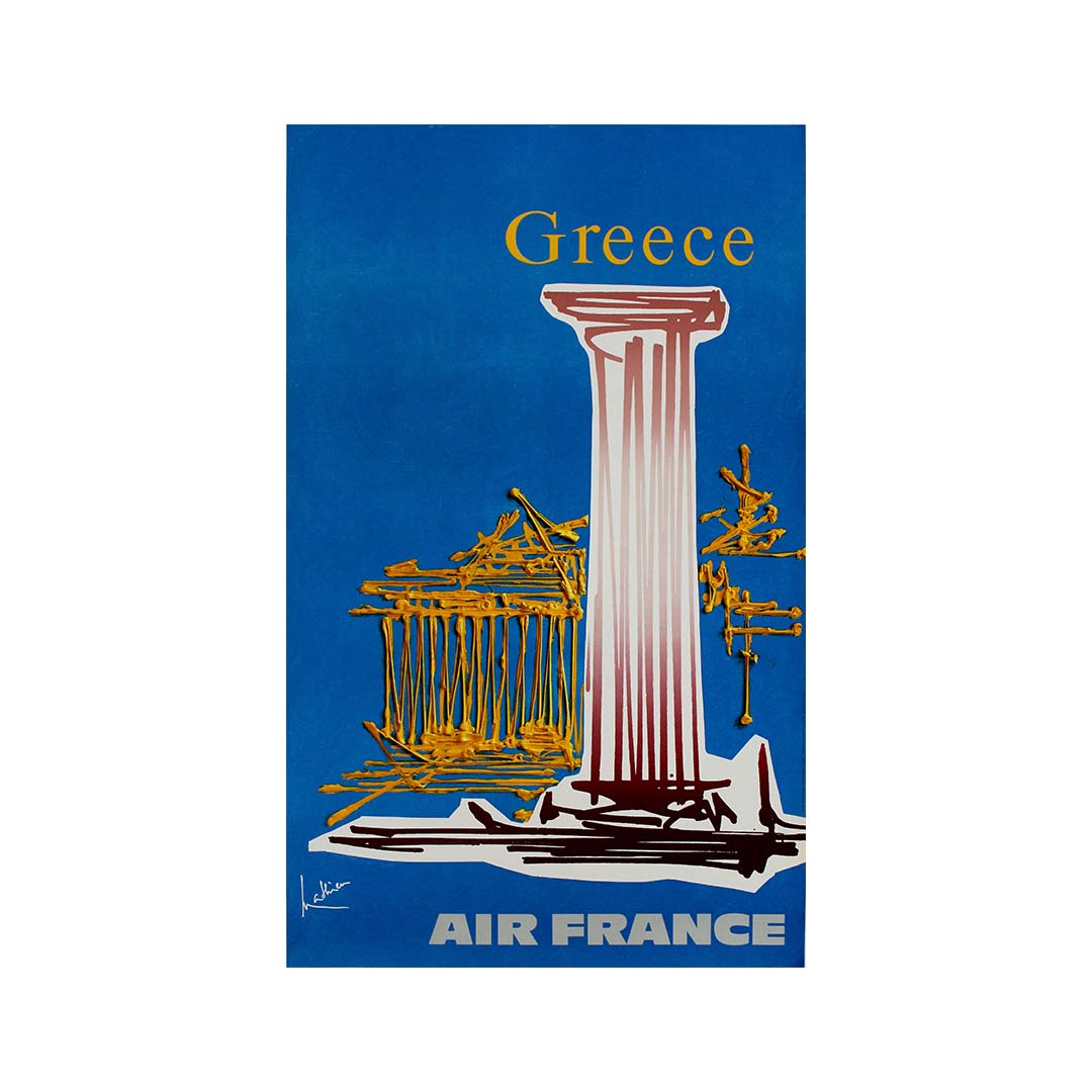 L'affiche Air France Grèce de 1967, conçue par Mathieu, est un chef-d'œuvre visuel qui nous invite à un voyage au cœur de la Grèce, terre magnifique et chargée d'histoire. Cette affiche iconique célèbre non seulement le transport aérien, mais capture aussi l'essence même de la richesse culturelle et de l'élégance intemporelle de la Grèce. Sa création s'inscrivait dans une série plus vaste, initiée par Pierre Sautet, directeur commercial adjoint d'Air France. Mathieu avait commencé à travailler sur ces affiches un an auparavant et les acheva en 1967. Cette collaboration entre art et publicité aboutit à la présentation de ces affiches le 26 octobre 1967 au Musée d'Art Moderne de la Ville de Paris.
