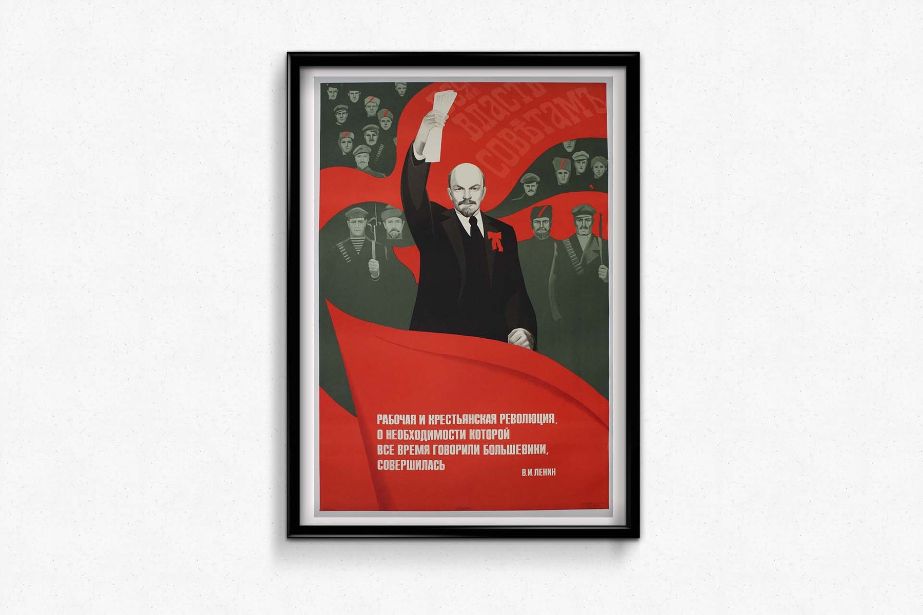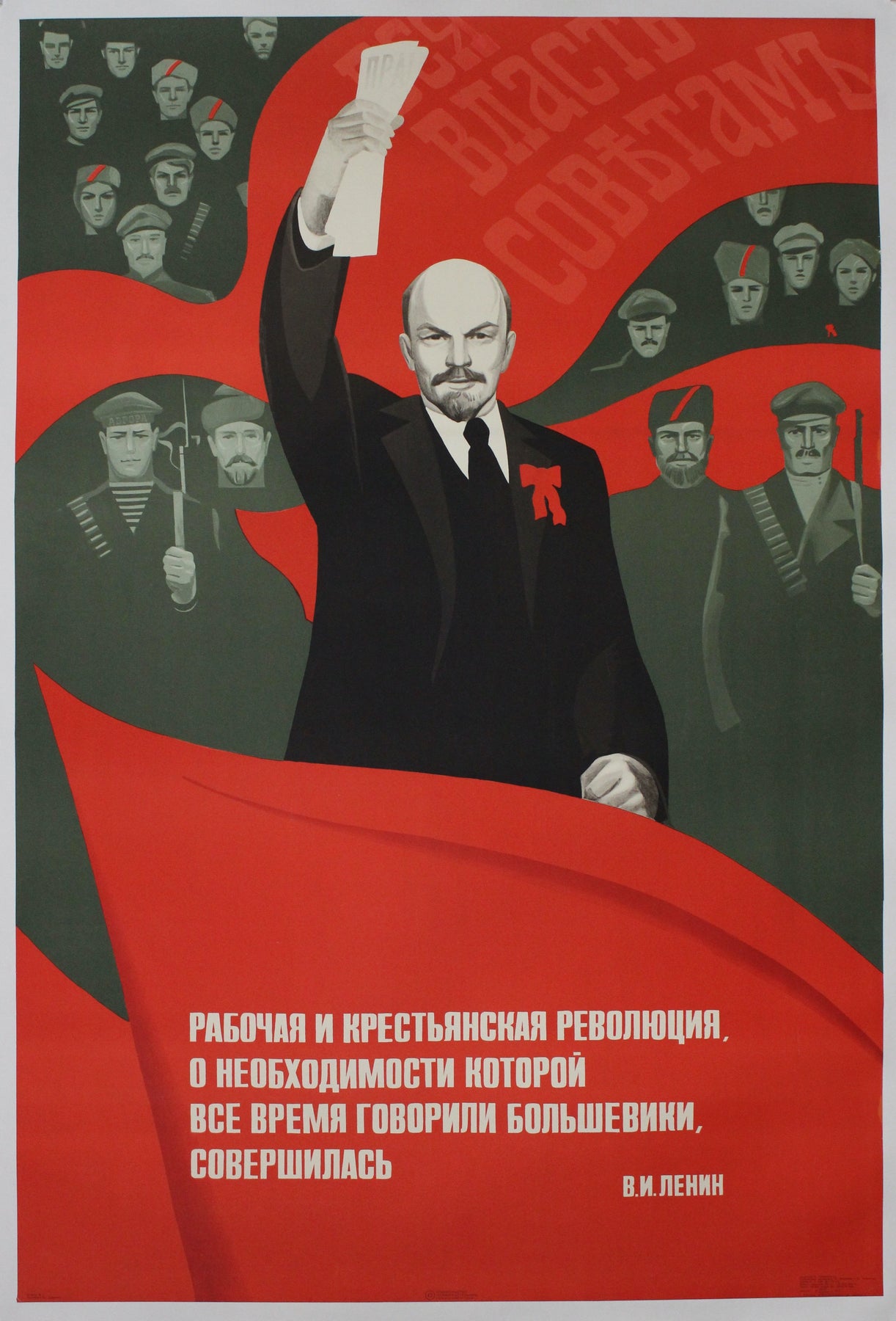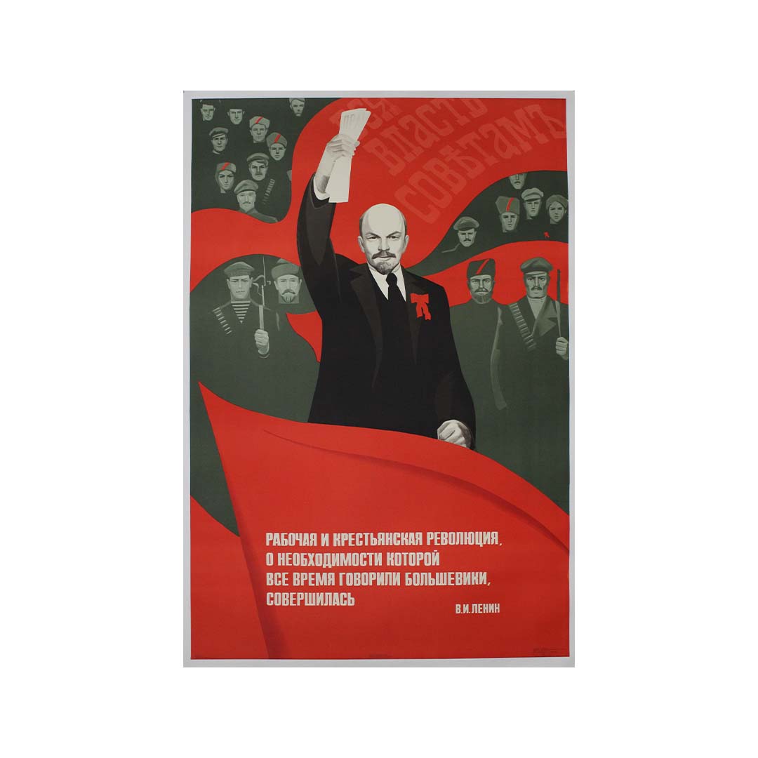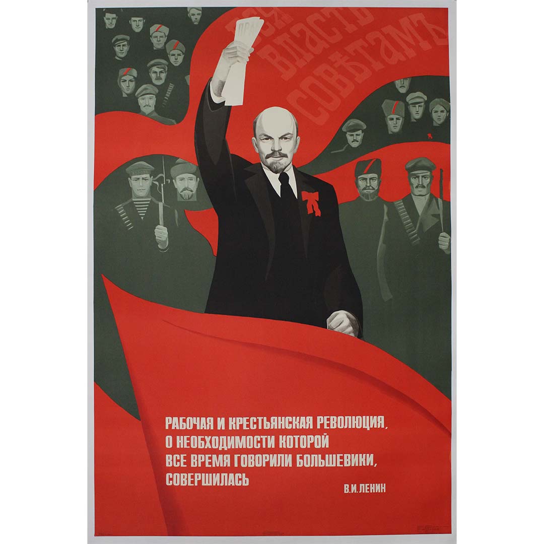 Le texte de l'affiche, une citation de Lénine, proclame : « La révolution ouvrière et paysanne, dont les bolcheviks n'ont cessé de parler de la nécessité, est accomplie. » Cette déclaration souligne la réalisation des objectifs révolutionnaires longtemps défendus par les bolcheviks, et affirme la légitimité et le succès de l'État soviétique.