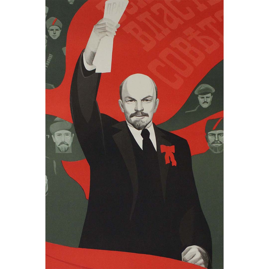 L'arrière-plan représente un groupe de personnages déterminés, incarnant les ouvriers et les soldats qui ont soutenu la cause bolchevique. Leurs expressions, graves et résolues, reflètent la force collective et la solidarité, thèmes centraux de la propagande soviétique. Le rouge, couleur dominante de l'affiche, symbolise à la fois le sang versé durant la révolution et l'espoir d'un avenir communiste.