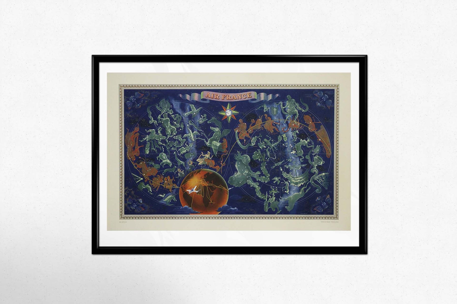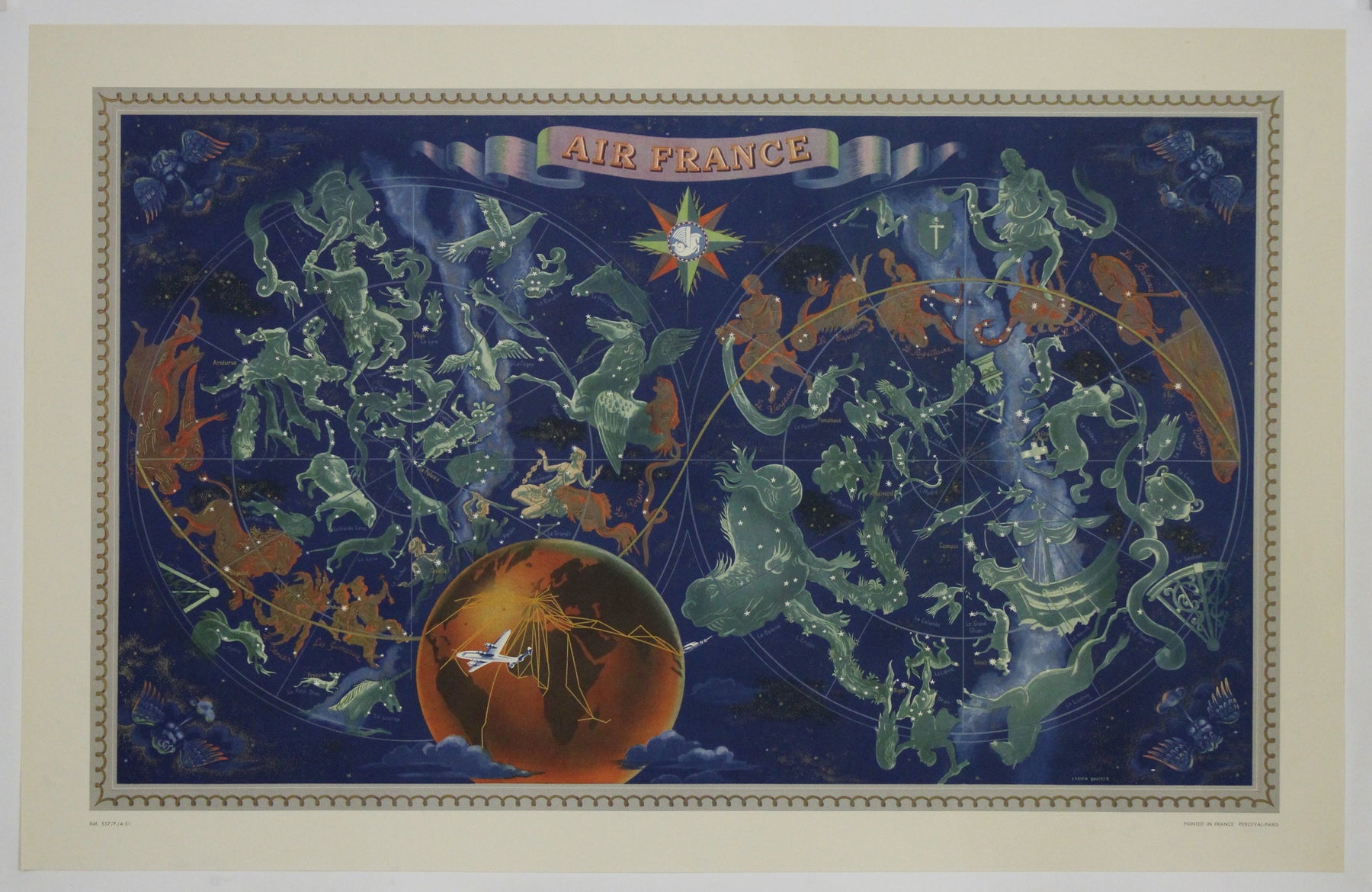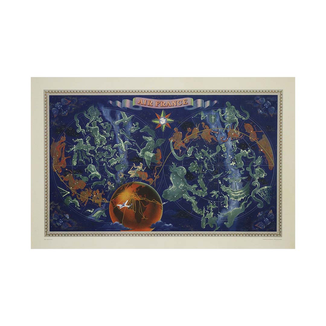 Le planisphère original de 1951, conçu par Lucien Boucher pour Air France, est une œuvre cartographique captivante qui mêle avec finesse thèmes astrologiques et rayonnement international de la compagnie. Réputé pour ses illustrations vivantes et imaginatives, Boucher a imaginé ce planisphère pour mettre en valeur les lignes aériennes d'Air France à travers le monde, en les superposant aux signes du zodiaque. La carte est ornée de représentations détaillées de constellations, de figures mythiques et de symboles célestes, créant un fascinant mélange d'astronomie et de géographie. Cette pièce unique a non seulement servi d'outil promotionnel pour Air France, mais a également reflété la fascination de l'époque pour l'exploration et le cosmos. Réalisé après la Seconde Guerre mondiale, il capture l'esprit d'optimisme et l'essor de l'aviation commerciale, soulignant le rôle d'Air France dans la connexion des différentes régions du monde. L'œuvre de Lucien Boucher est reconnue pour son élégance artistique et sa richesse symbolique, faisant de ce planisphère un objet précieux qui offre un aperçu des progrès culturels et technologiques du milieu du XXe siècle.