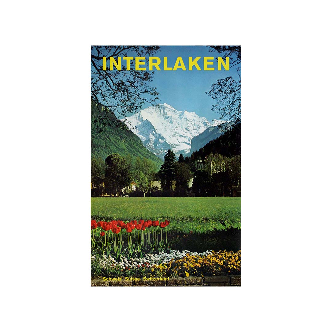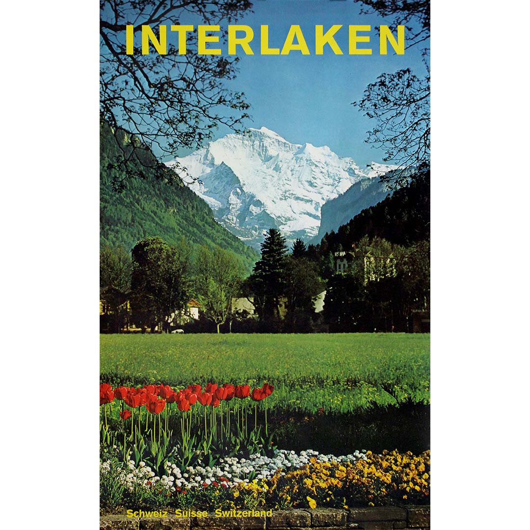 La typographie est simple et audacieuse, avec « INTERLAKEN » imprimé en lettres majuscules jaune vif en haut et « Schweiz Suisse Switzerland » en dessous, inscrivant ce design dans l'ère du style suisse moderniste, et évoquant la clarté, la précision et une communication visuelle directe pour un public international.