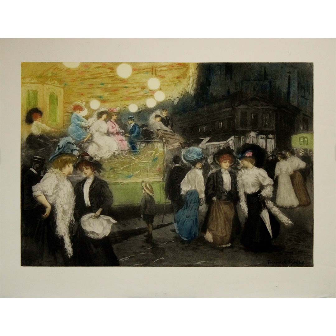 Pour les collectionneurs et les amateurs d'art français du début du XXe siècle, cette aquatinte originale de Manuel Robbe est une pièce de grande valeur. Son importance historique, alliée au talent exceptionnel de Robbe, en fait un ajout précieux à toute collection. L'œuvre témoigne non seulement de la maîtrise technique de Robbe, mais aussi de sa profonde appréciation du dynamisme et du charme de la vie parisienne.