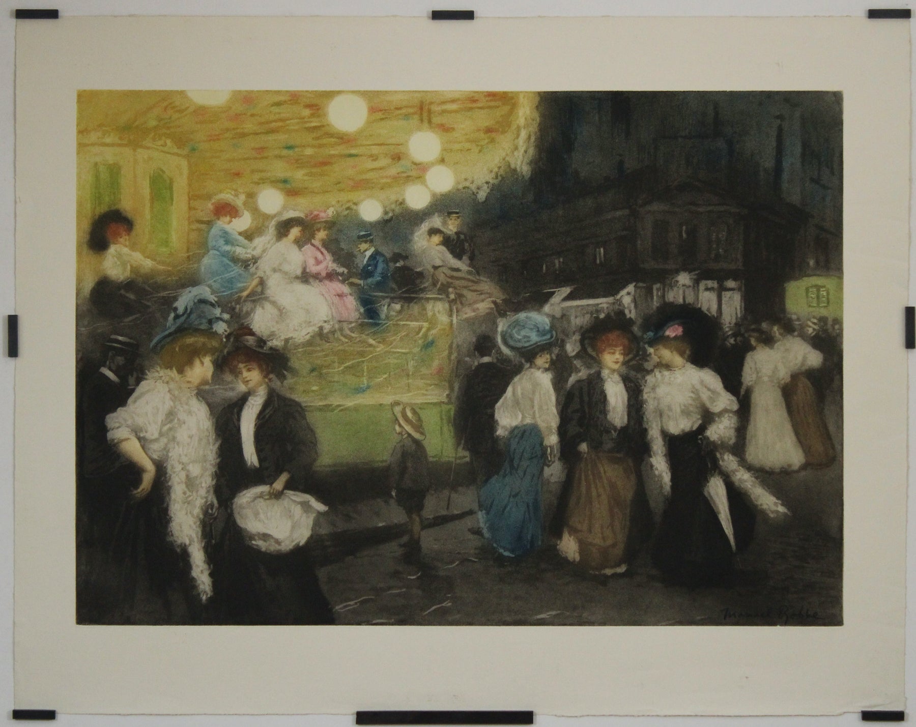 En résumé, « Le manège ou la Place Blanche à Paris » de Manuel Robbe est une aquatinte magistrale qui capture l'essence même de la Place Blanche au début du XXe siècle à Paris. Par sa technique exquise et son sens aigu de l'observation, Robbe immortalise un instant de joie et de mouvement, invitant le spectateur à ressentir la magie du Paris d'une autre époque.