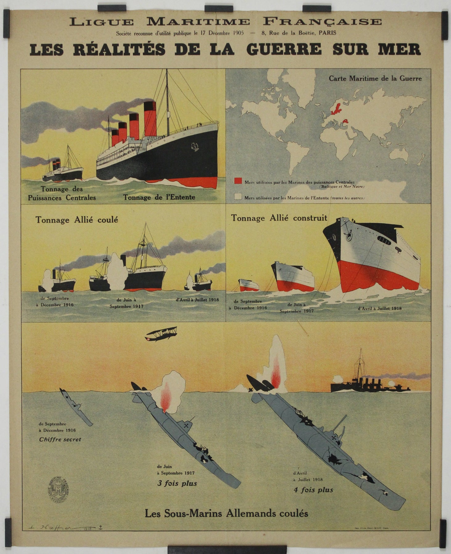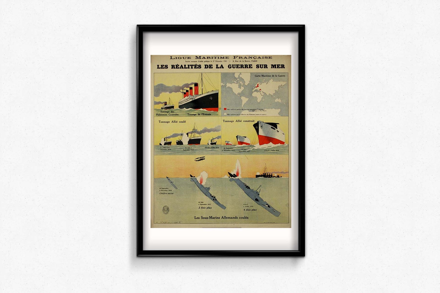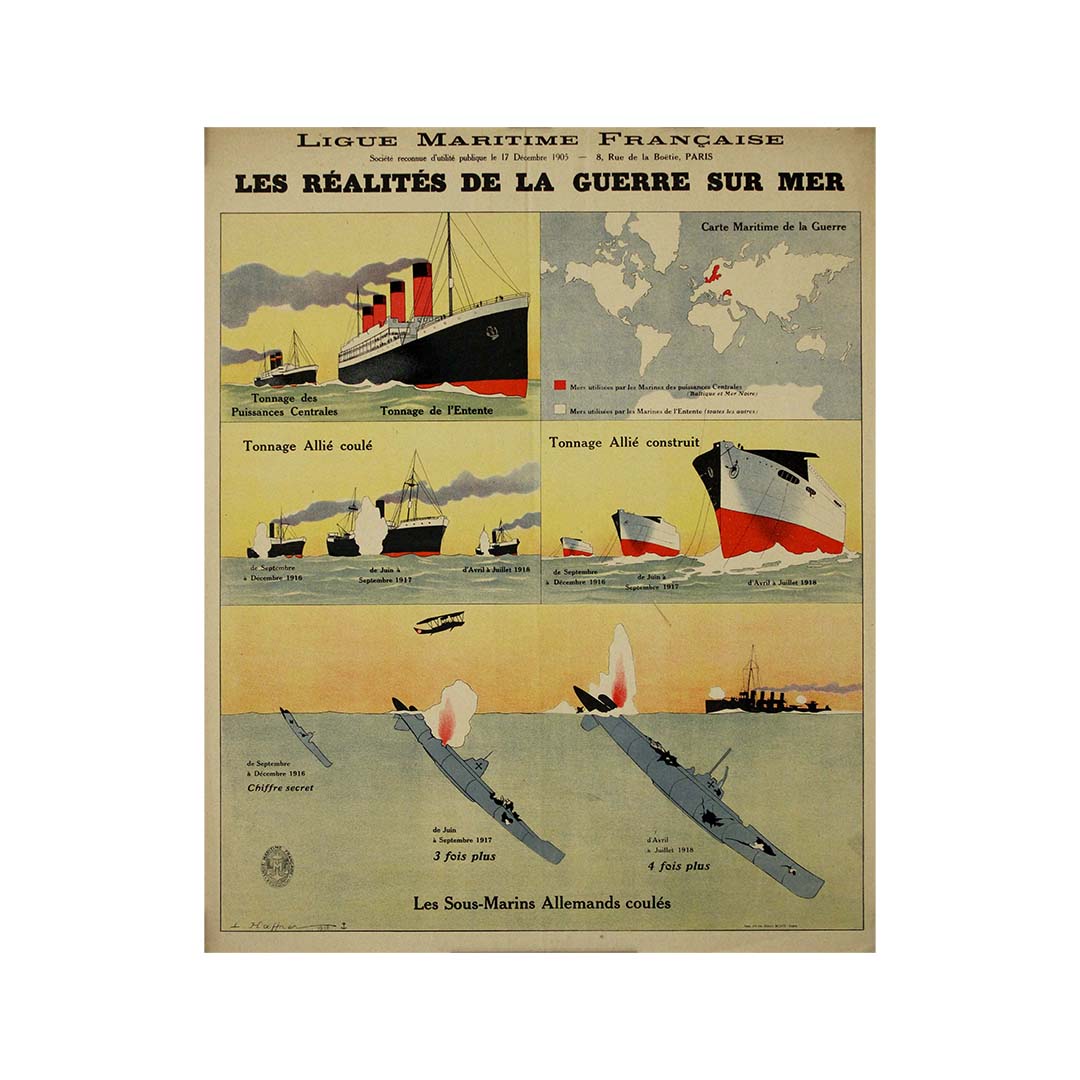Cette affiche s'inscrivait dans une campagne plus vaste de la Ligue Maritime Française visant à sensibiliser le public aux défis et aux succès de la marine française pendant la guerre. Elle mettait l'accent sur les dures réalités auxquelles la Marine nationale était confrontée pour défendre les eaux françaises face à la menace des sous-marins allemands. En soulignant les victoires importantes de la Marine nationale, notamment la destruction de nombreux sous-marins allemands, cette affiche avait pour but d'informer le public sur l'importance de la défense maritime française pendant le conflit.