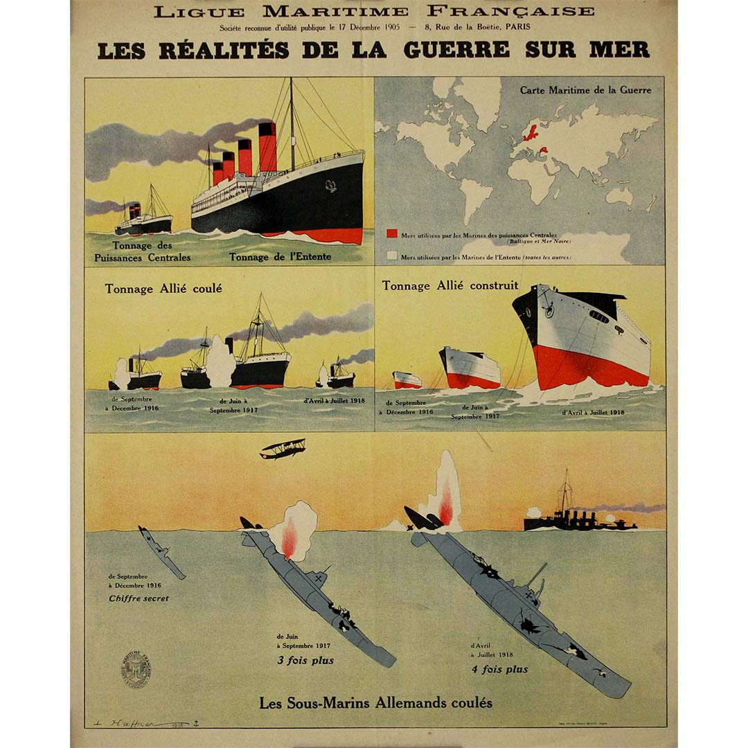 L'affiche de 1918, « Les Réalités de la Guerre sur Mer », est bien plus qu'un simple document de propagande de guerre ; elle constitue un témoignage historique précieux, reflétant les efforts déployés par la France pour mobiliser l'opinion publique et obtenir le soutien à l'effort de guerre. Elle demeure un artefact important de la Première Guerre mondiale, illustrant un aspect crucial du conflit et le rôle de Léon Haffner dans la représentation des réalités maritimes de l'époque.