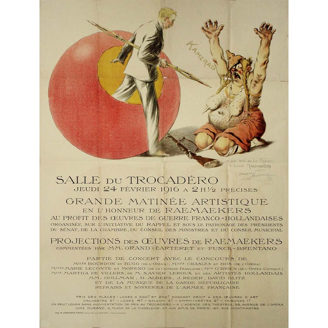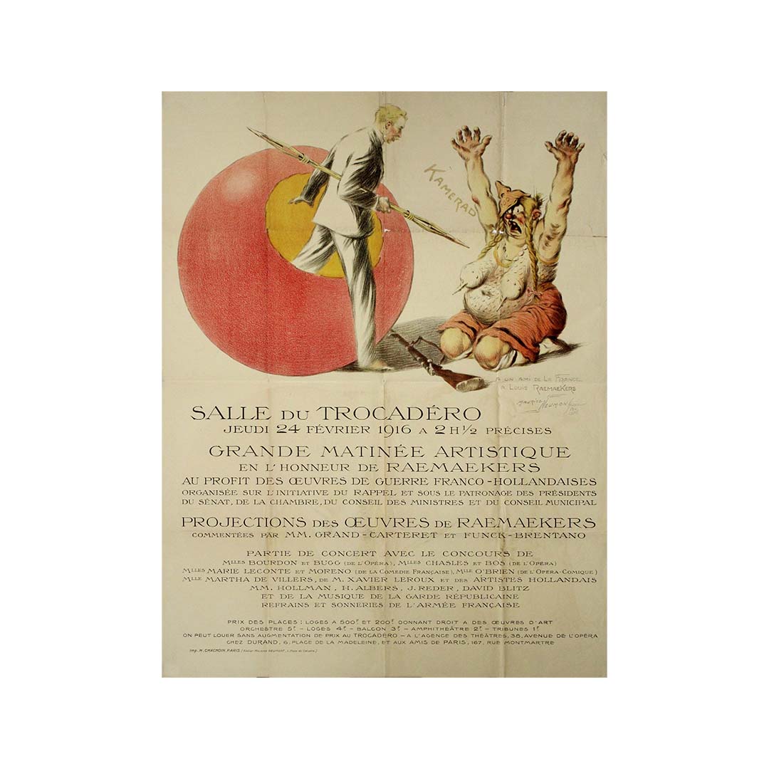 L'affiche, créée par Maurice Neumont et imprimée par H. Chachoin à Paris, illustre la fusion entre engagement artistique et solidarité en temps de guerre. Elle fut conçue pour promouvoir une matinée spéciale qui, outre l'hommage rendu à Raemaekers, visait également à collecter des fonds pour les actions humanitaires. Les caricatures de Raemaekers avaient acquis une renommée internationale pour leur regard critique sur la guerre, et cette matinée constituait à la fois un hommage à son œuvre et une levée de fonds pour les victimes du conflit.
