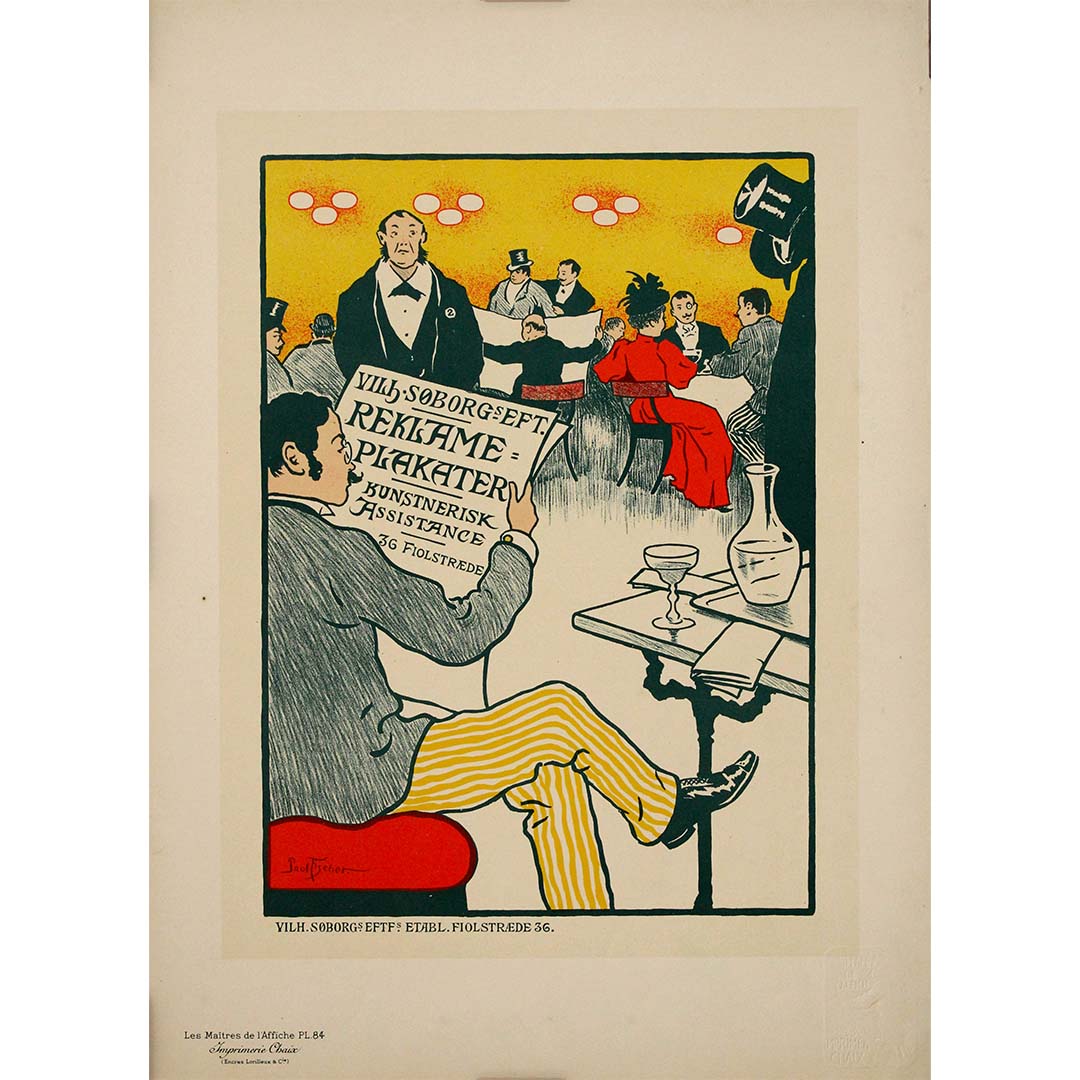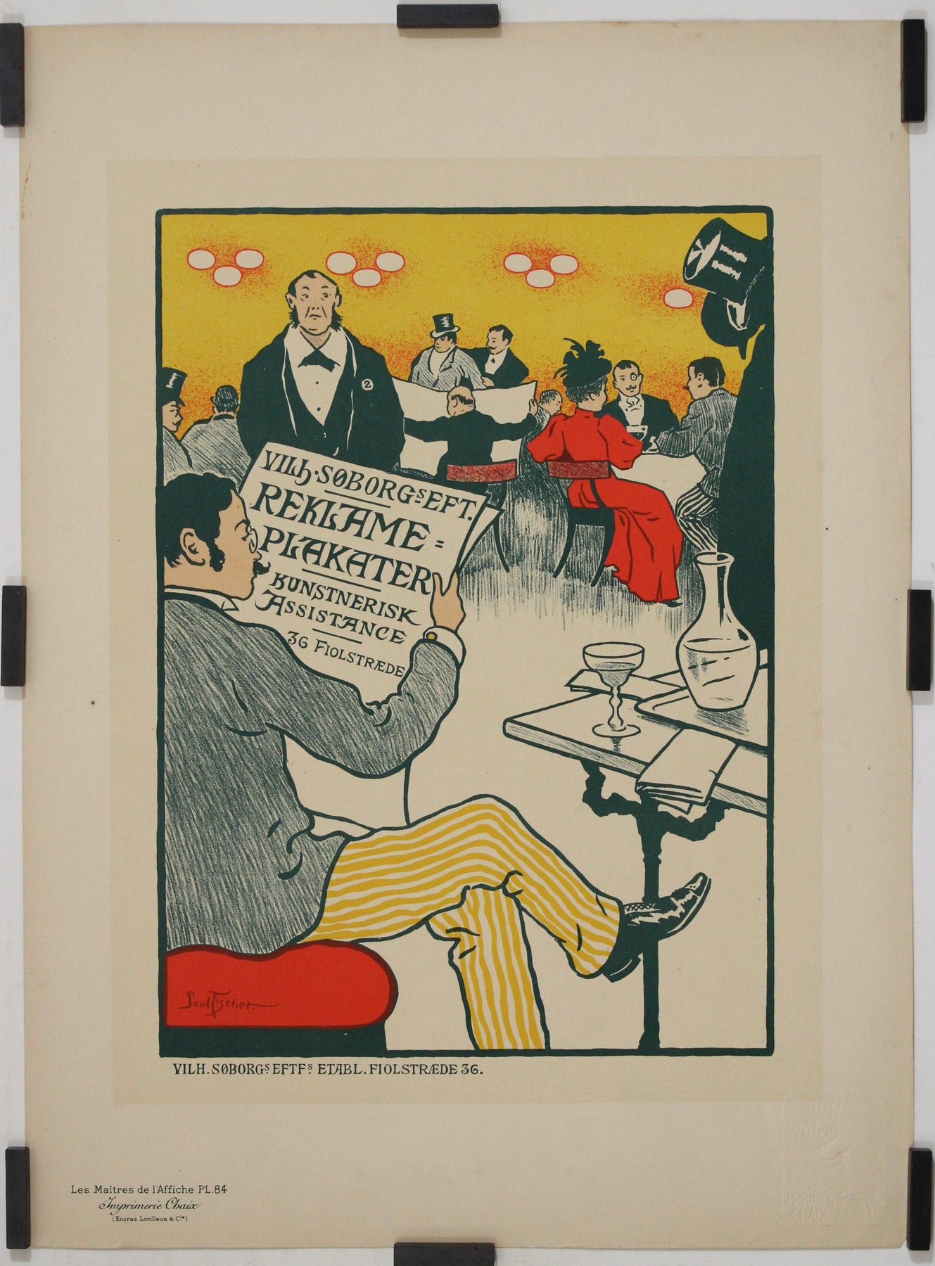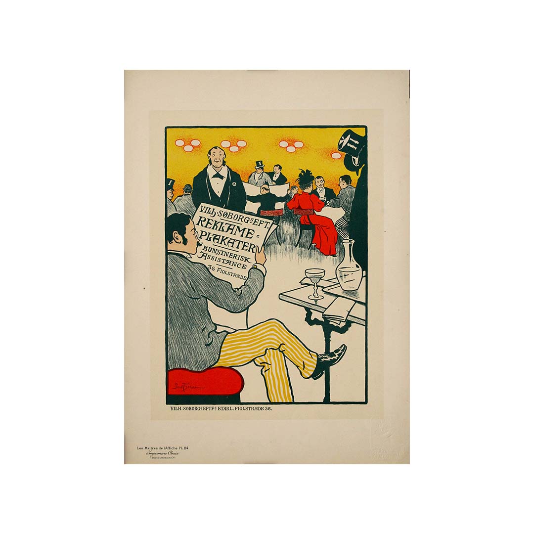 Cette affiche lithographique originale, créée en 1896 par l'artiste danois Paul Fischer, a été publiée sous le numéro 84 dans la célèbre série « Les Maîtres de l'Affiche » . L'œuvre fait la promotion des services d'affichage publicitaire de Vilh. Søborg à Copenhague, avec le slogan humoristique « Reklame Plakater Kunstnerisk Assistance » (Affichage publicitaire : assistance artistique).