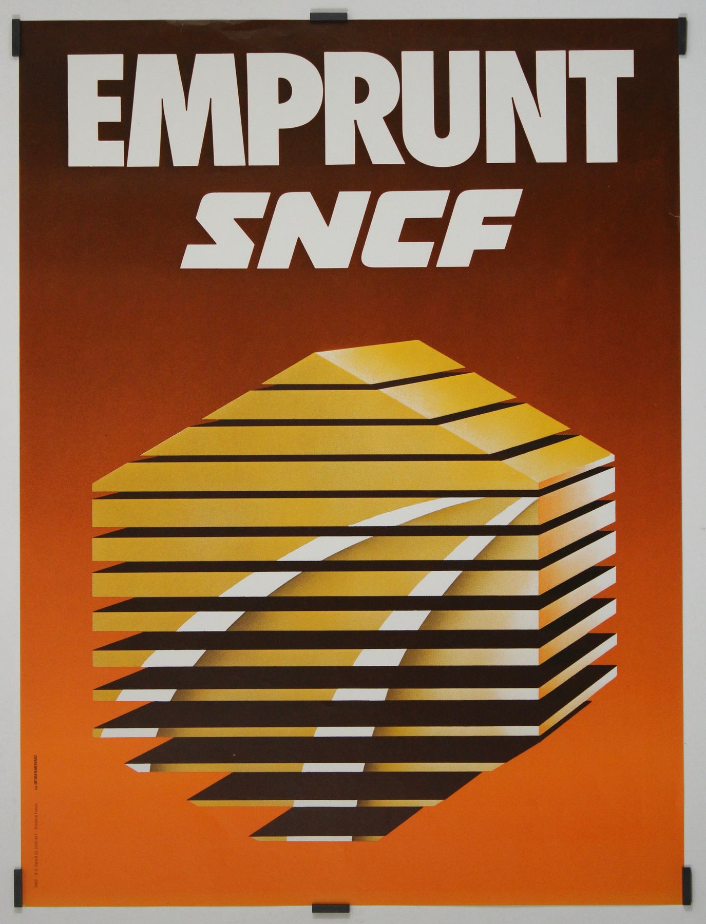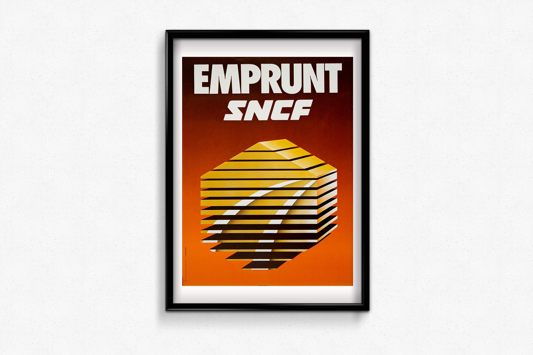 Cette affiche Emprunt SNCF des années 1970 constitue un exemple remarquable du design institutionnel français d'après-guerre. Publiée par la Société Nationale des Chemins de fer Français (SNCF), elle encourageait l'investissement public dans le développement du réseau ferroviaire national. Bien que l'artiste demeure anonyme, le style graphique reflète la typographie épurée et audacieuse de l'époque, privilégiant la clarté, l'ordre et un sentiment d'optimisme national.
