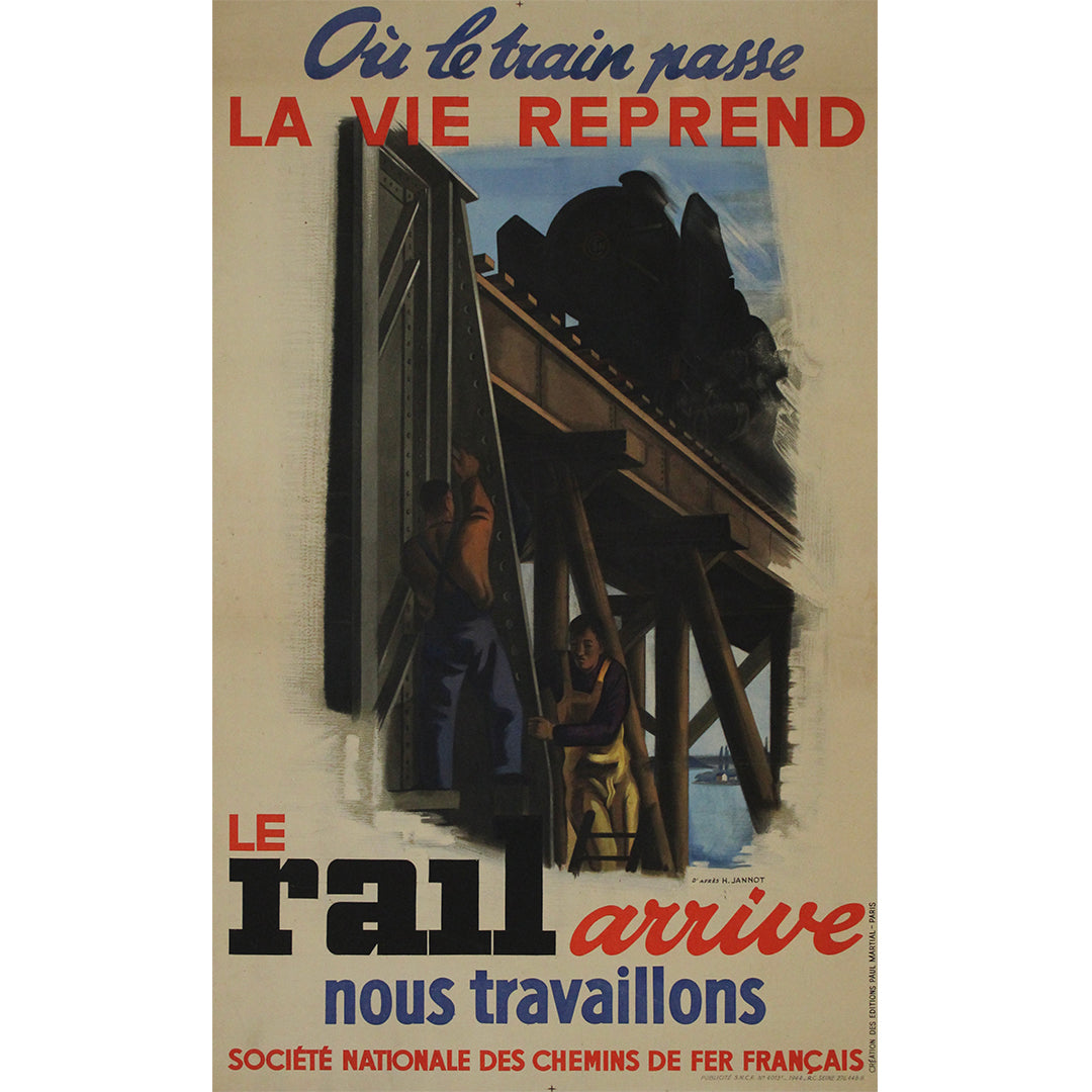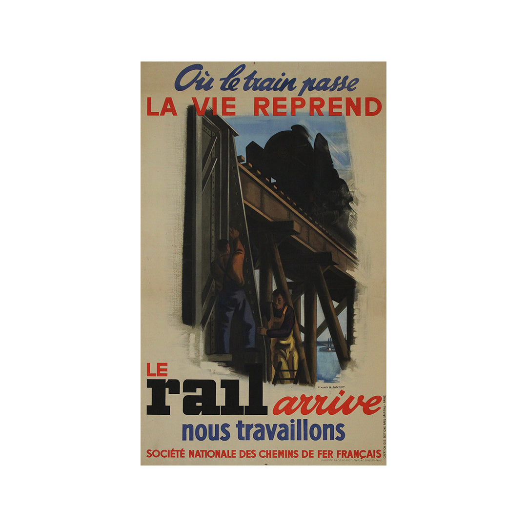 Au fond, l'affiche véhicule un message optimiste : « Où le train passe, la vie reprend », soulignant le rôle vital des chemins de fer qui reconnectent les communautés, dynamisent les économies et permettent à la vie quotidienne de reprendre son cours. L'image montre des cheminots courageux et appliqués à la reconstruction d'un pont, avec la silhouette imposante d'une locomotive avançant avec puissance au-dessus, symbole fort de la puissance industrielle, du progrès et du renouveau.