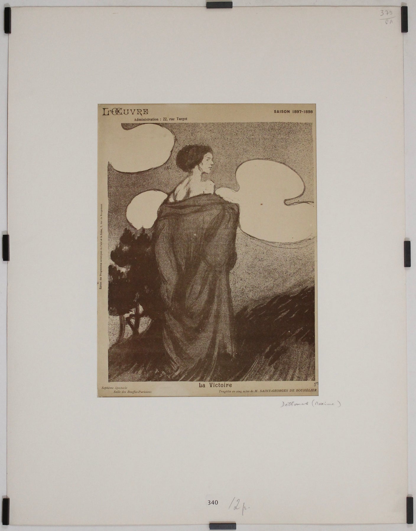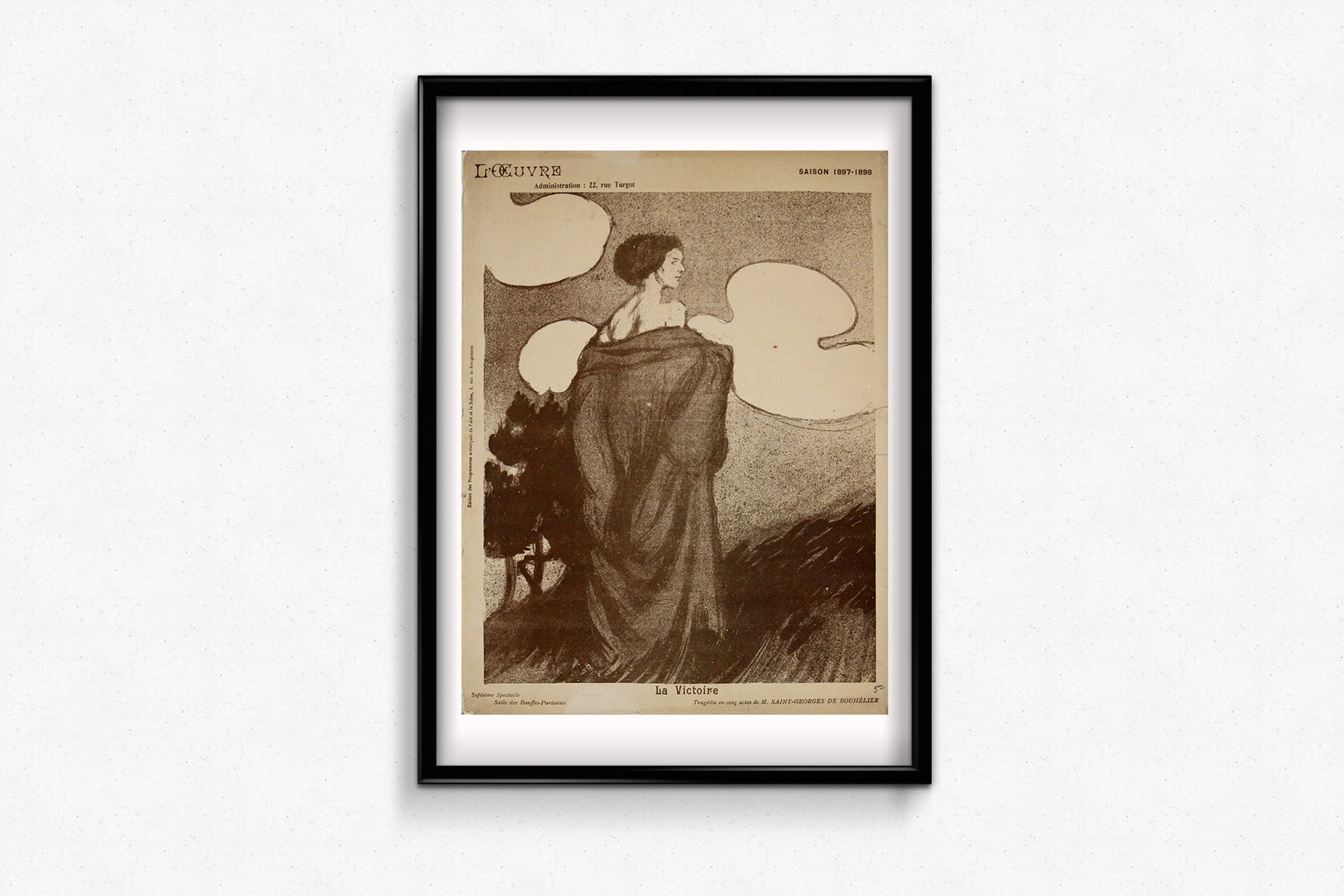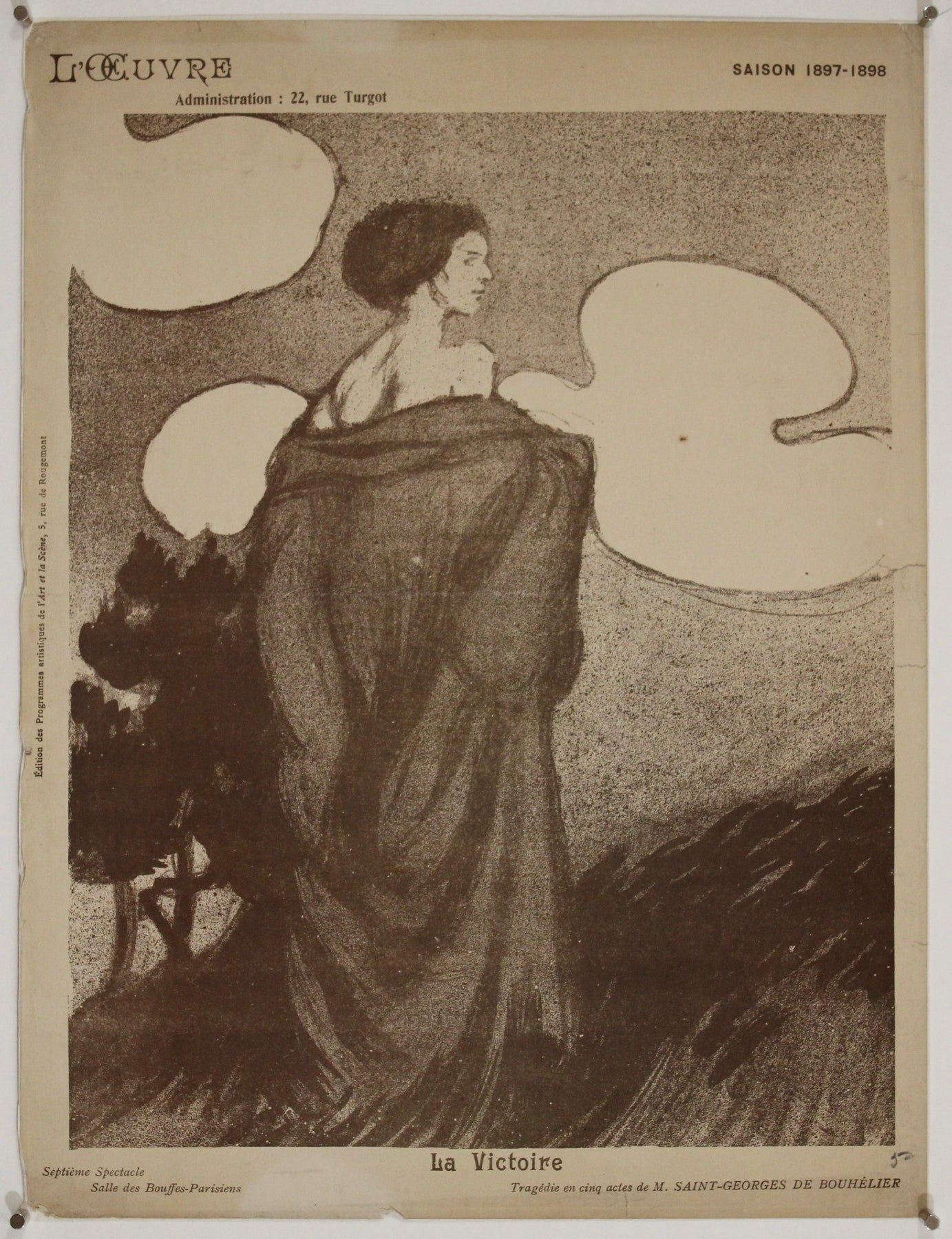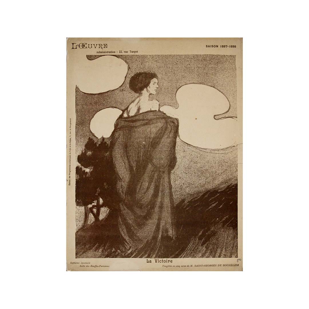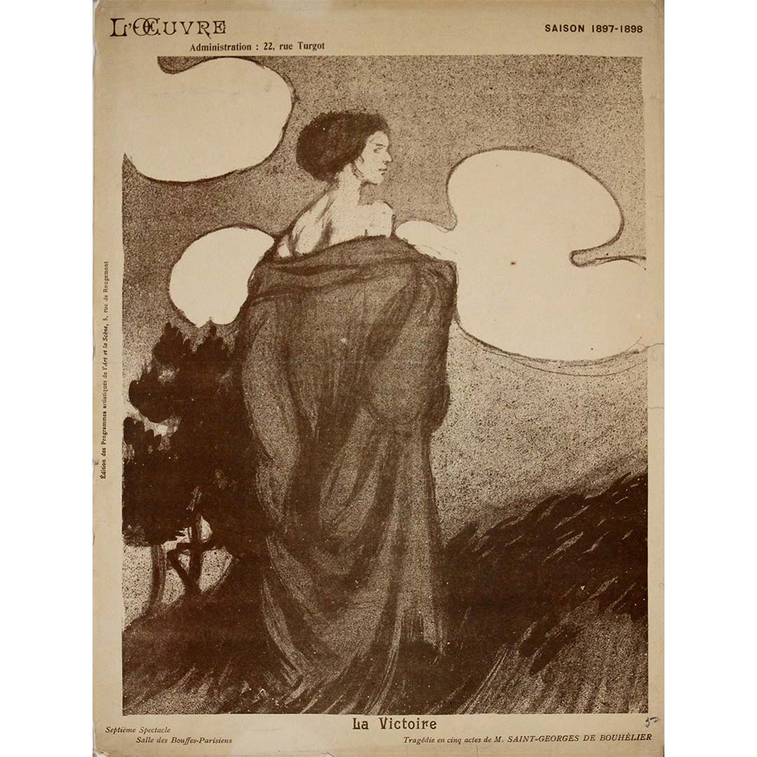 Ce programme illustré exceptionnel de 1898, signé Maxime Dethomas, fut créé pour La Victoire , tragédie en cinq actes de Saint-Georges de Bouhélier, présentée au légendaire Théâtre de l'Œuvre lors de sa saison 1897-1898. Il constitue un exemple frappant du mélange unique d'expérimentation dramatique et visuelle propre à l'époque symboliste, caractéristique de la scène parisienne d'avant-garde à la fin du XIXe siècle.