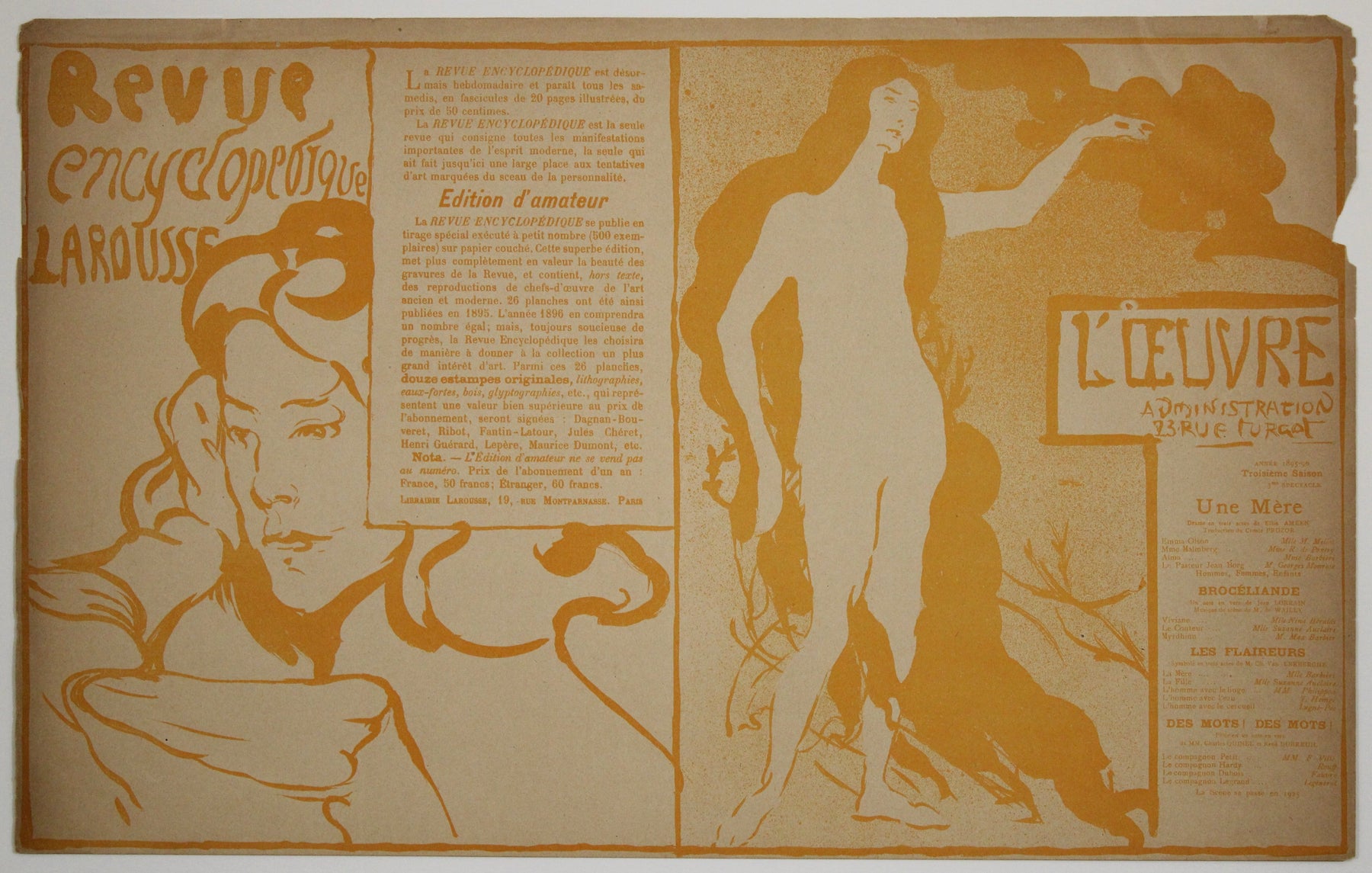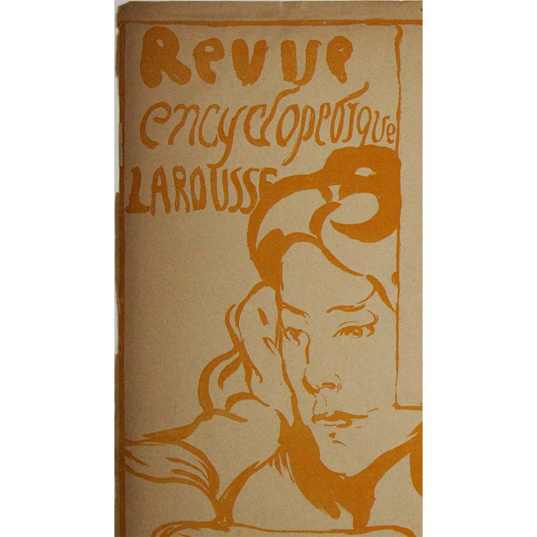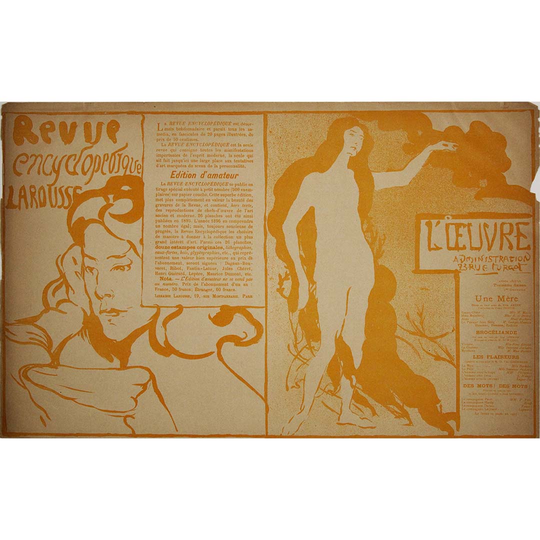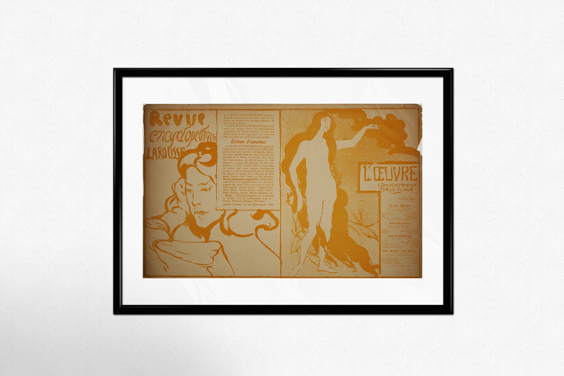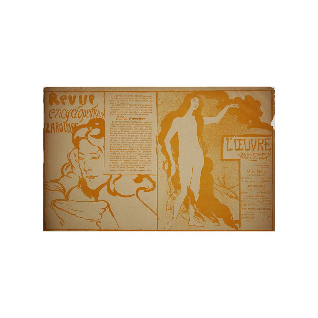 La composition de Dethomas se divise ici en deux panneaux saisissants. À gauche, une figure féminine stylisée et langoureuse contemple introspectivement sous une typographie en boucle faisant la promotion de la Revue encyclopédique Larousse , évoquant la rencontre entre intellectualisme et esthétisme. À droite, un nu mythologique audacieux est drapé d'un tourbillon organique de fumée ou de cheveux, motif par excellence de l'allégorie symboliste. Le trait, à la fois spontané et précis, saisit avec justesse la sensualité théâtrale et l'élévation spirituelle.