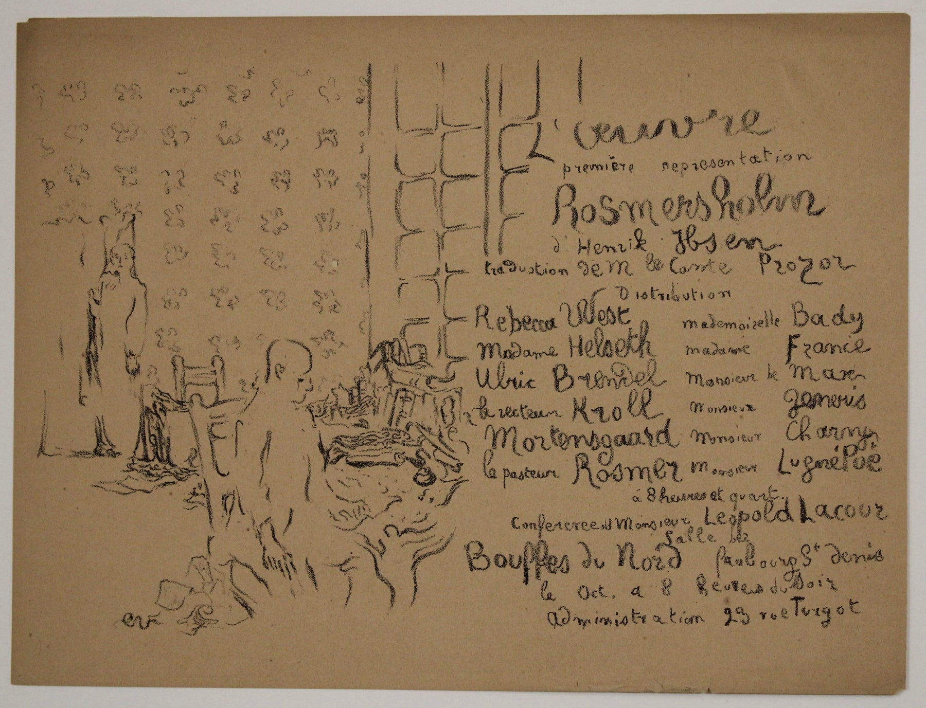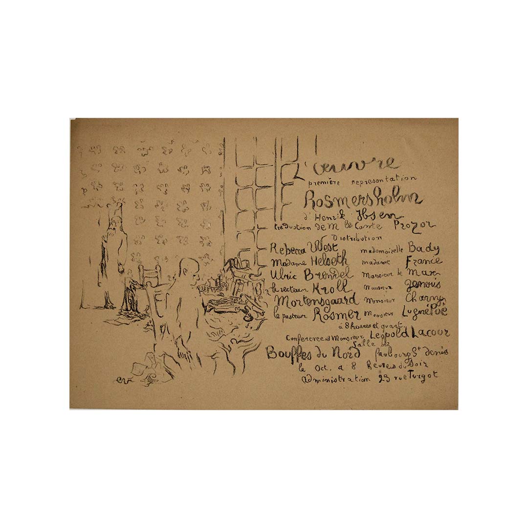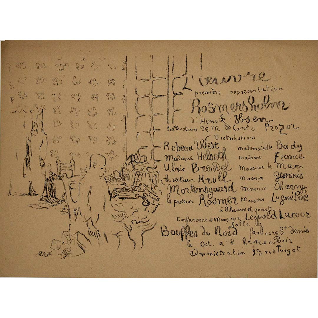 Dans cette lithographie délicate et onirique, Édouard Vuillard prête sa sensibilité poétique au programme imprimé de la première française de Rosmersholm d'Henrik Ibsen, présentée par le Théâtre de l'Œuvre de Lugné-Poe, bastion parisien d'avant-garde du théâtre symboliste.
