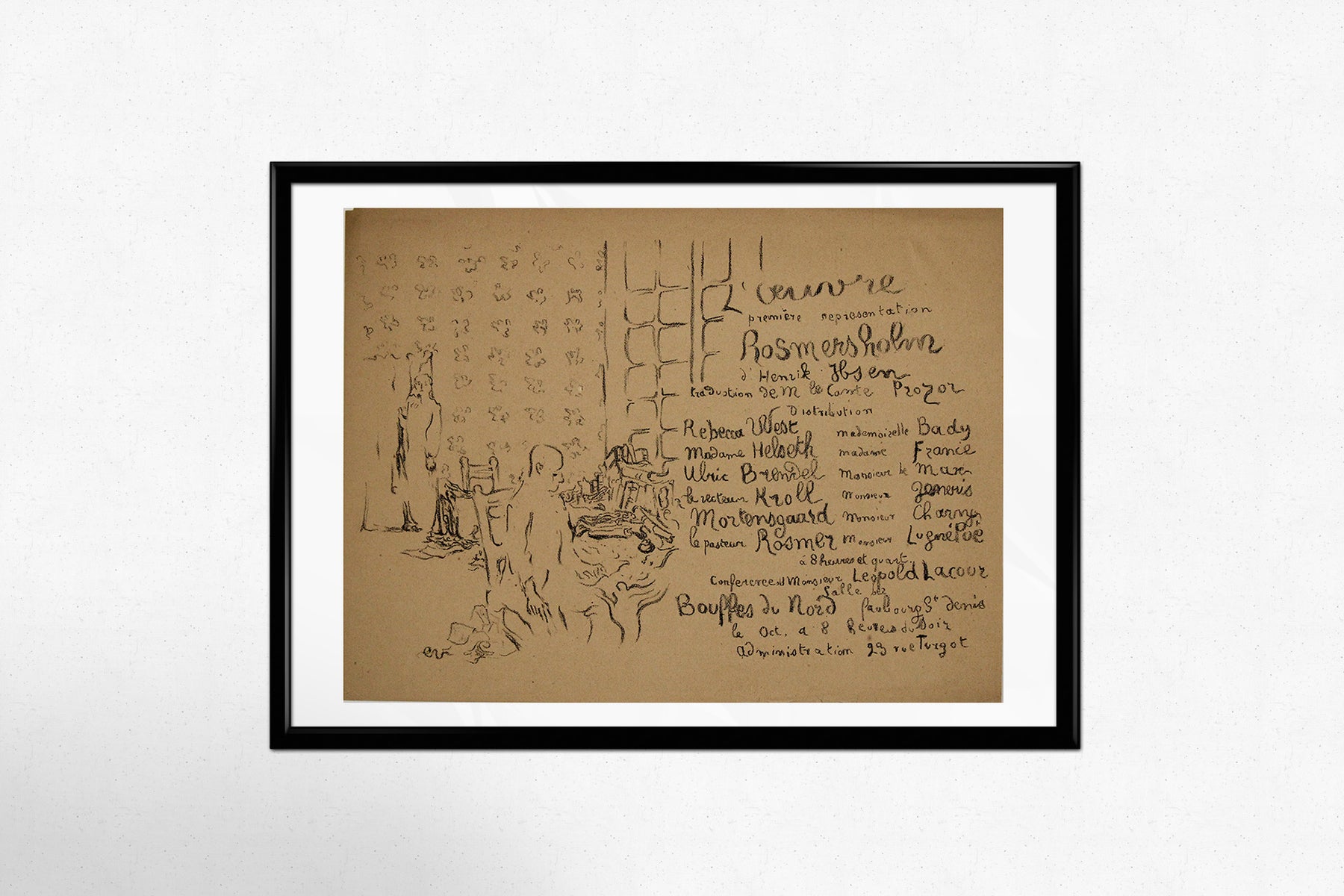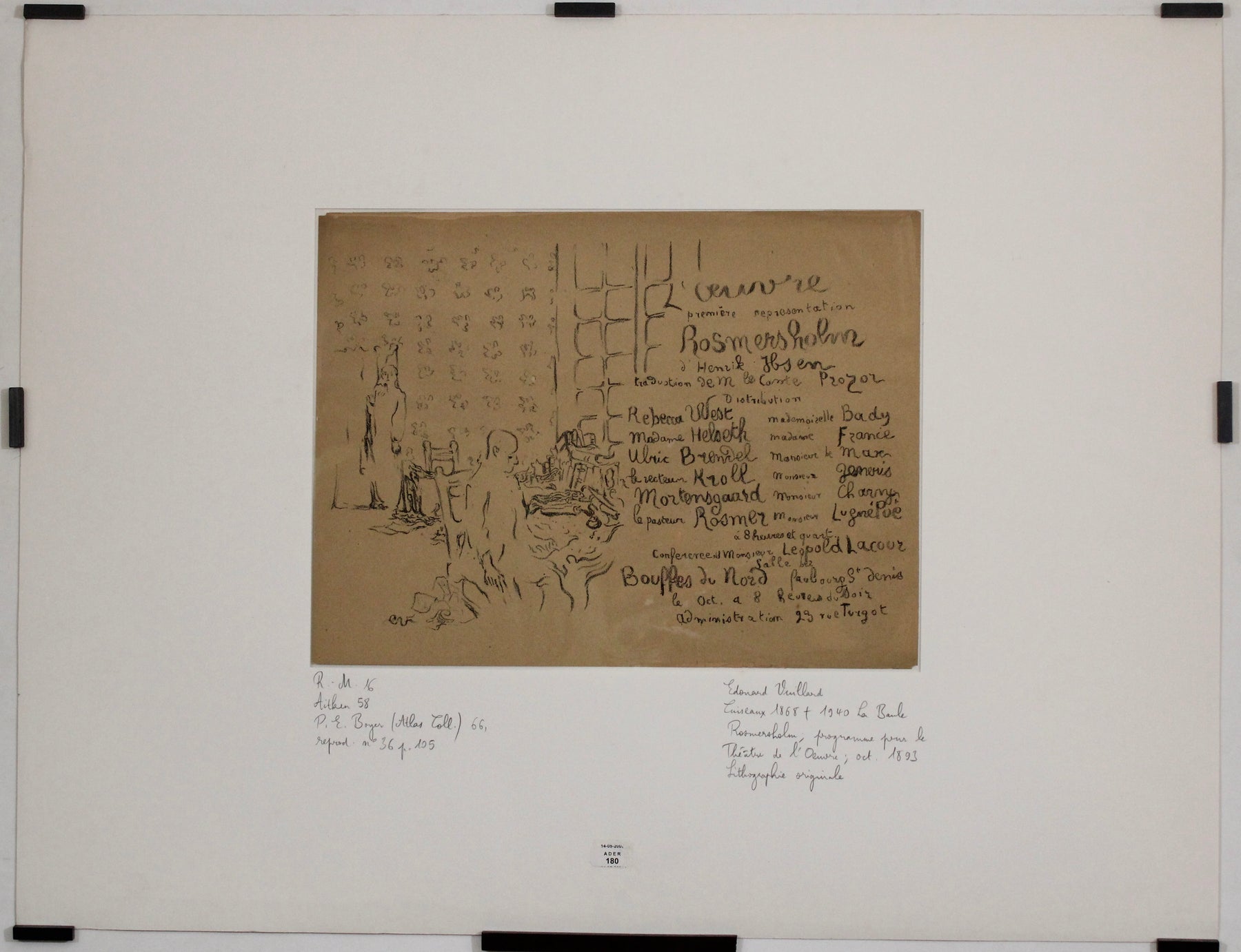 La lithographie, réalisée dans des tons graphite doux sur papier chamois, fusionne texte et dessin en une composition atmosphérique unique. L'intérieur domestique intimiste de Vuillard, peuplé de figures fantomatiques et de meubles clairsemés, évoque subtilement la tension psychologique et le passé oppressant qui hantent la pièce d'Ibsen. Le mur de fenêtres à carreaux et le papier peint à motifs suggèrent un environnement cloîtré – une métaphore visuelle des contraintes émotionnelles de la morale bourgeoise, au cœur de Rosmersholm .