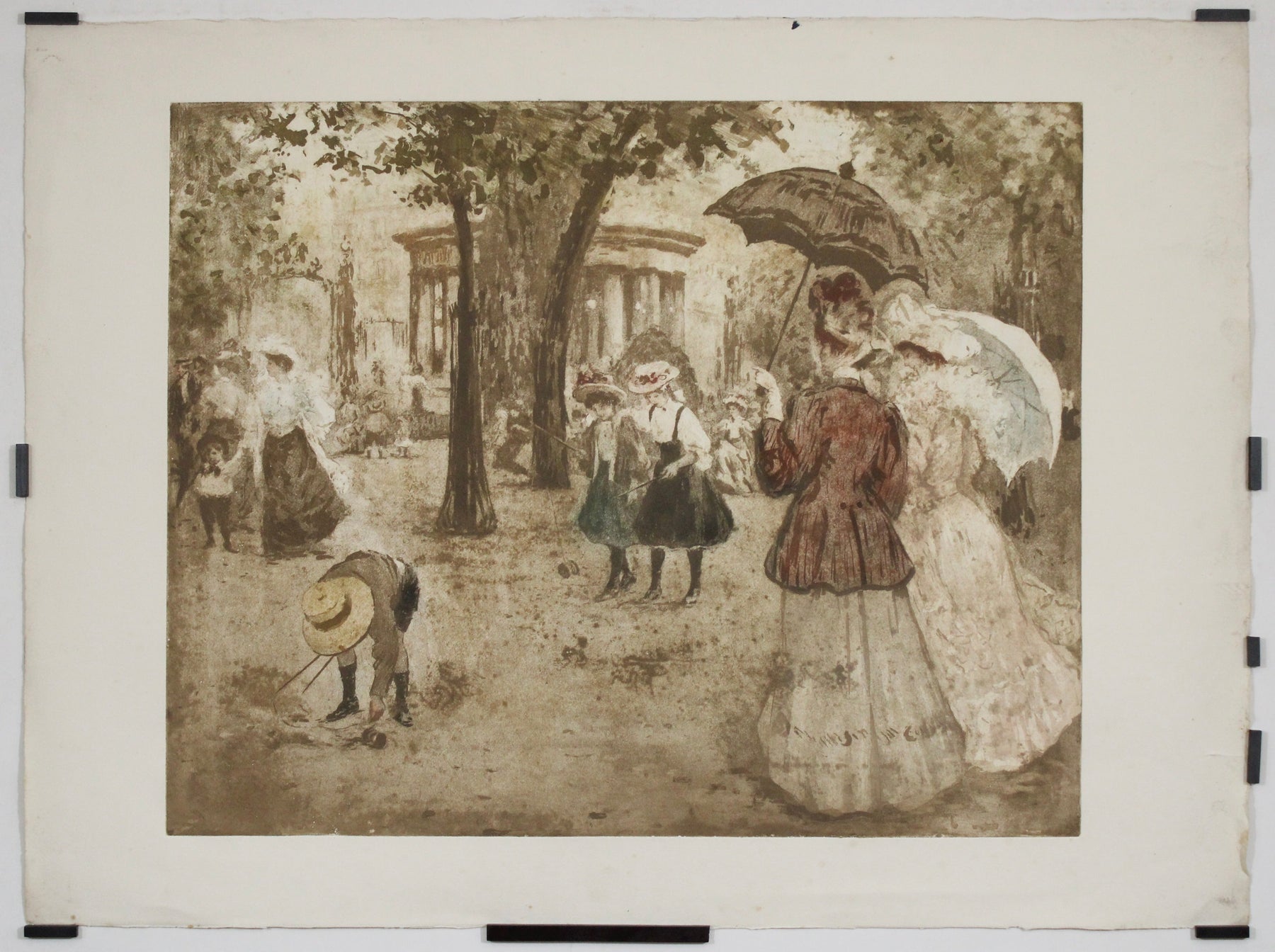 Baignée dans la douce lumière d'un après-midi parisien, cette charmante aquatinte originale de Manuel Robbe capture un moment idyllique de loisirs bourgeois dans le parc Monceau, l'un des espaces verts les plus élégants de la capitale.