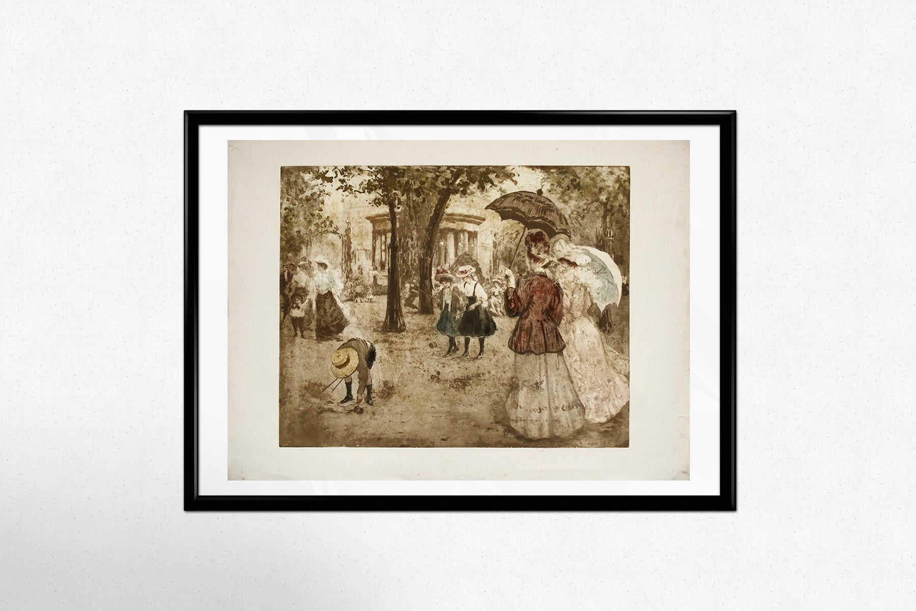 Datant d'environ 1910, cette composition est un tendre hommage à la vie parisienne à l'aube du crépuscule de la Belle Époque. Des femmes élégamment vêtues, ombrelles à la main, des enfants en costumes de marin et chapeaux de paille, et la douce lueur d'une lumière tachetée filtrant à travers les arbres évoquent un monde urbain raffiné, empreint de grâce et de distinction.