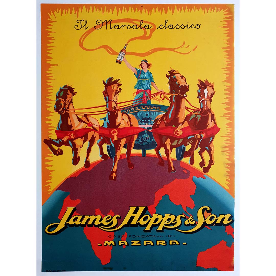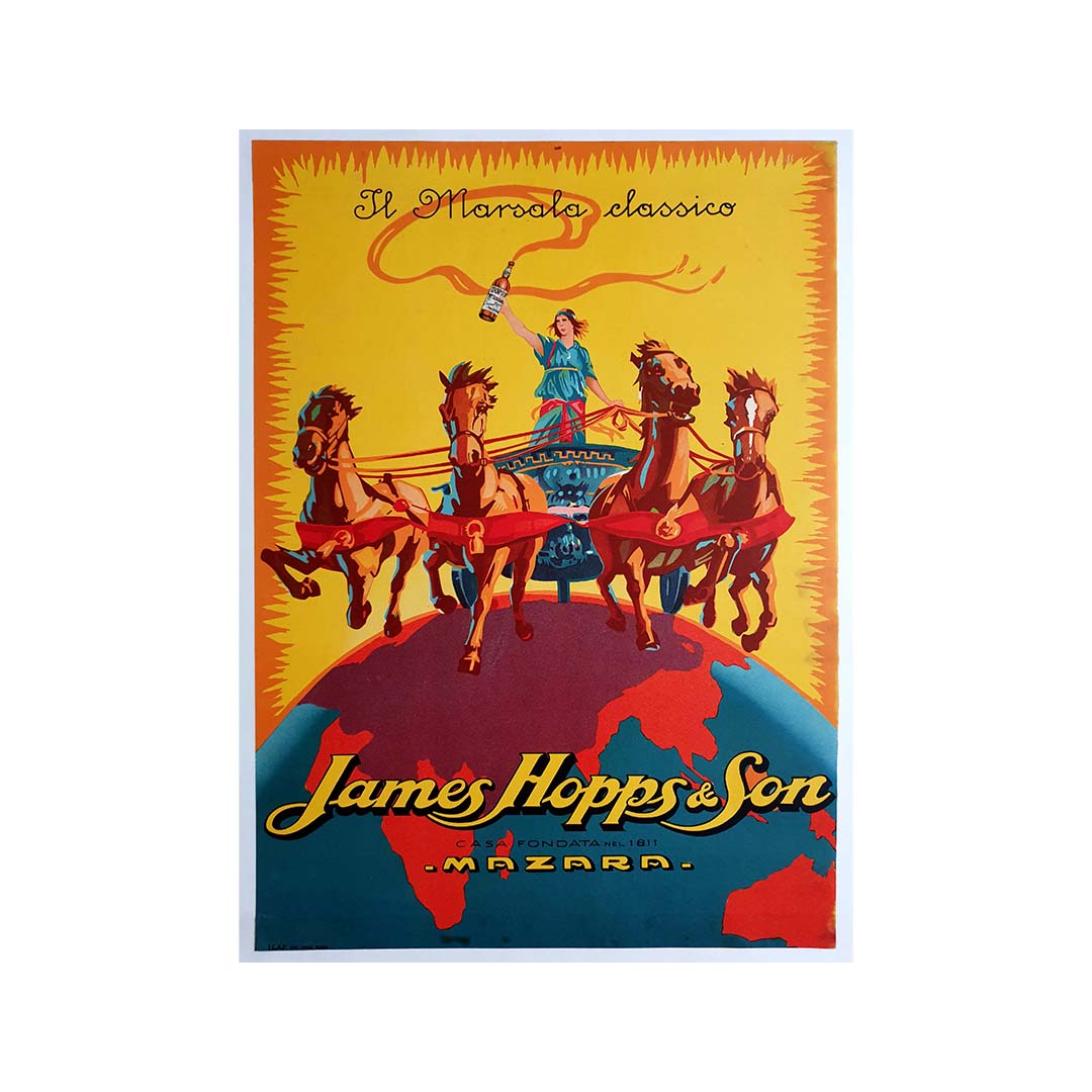L'affiche originale de 1930 environ pour « Il Marsala Classico » de James Hopps & Son est un chef-d'œuvre visuel saisissant qui nous transporte dans une époque d'élégance et de tradition. Mettant en scène quatre chevaux majestueux, cette affiche sert non seulement de support publicitaire, mais rend également hommage à l'héritage et au charme intemporel de la marque.