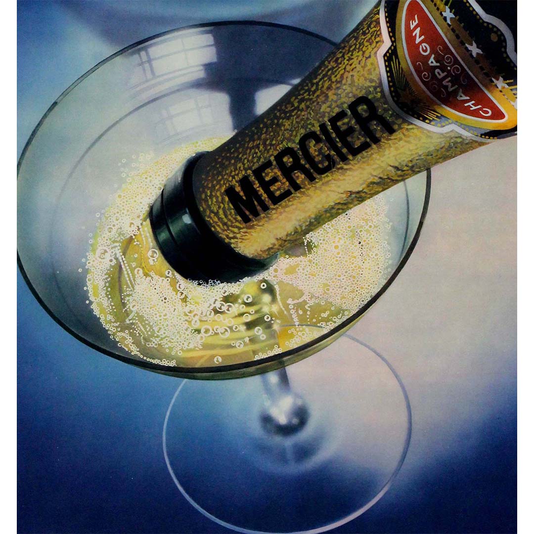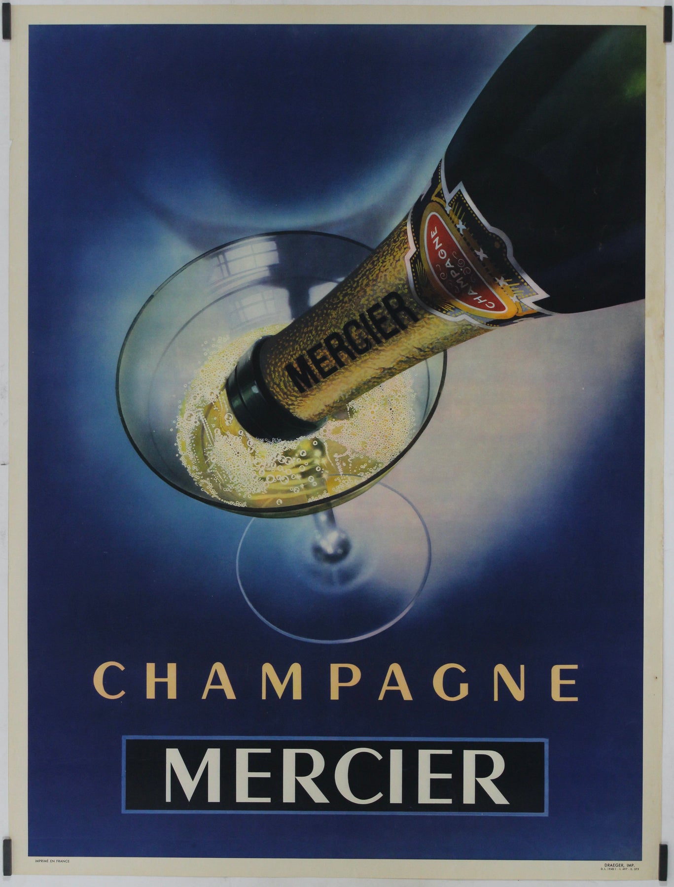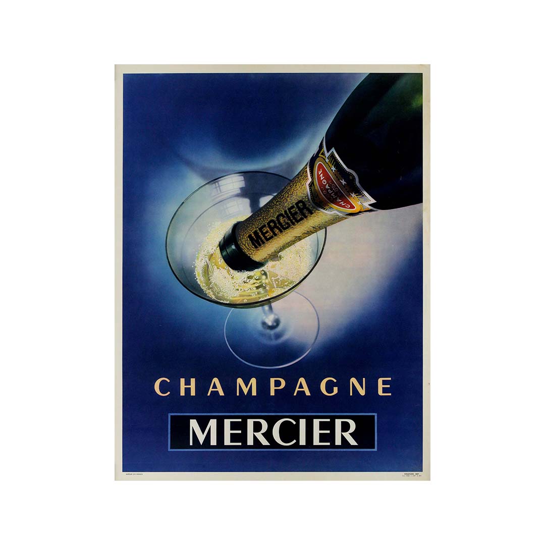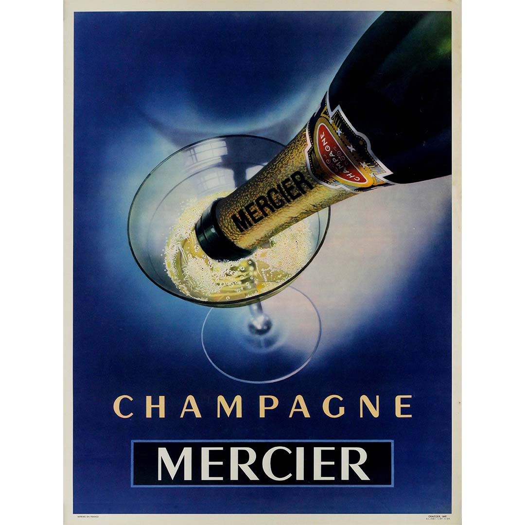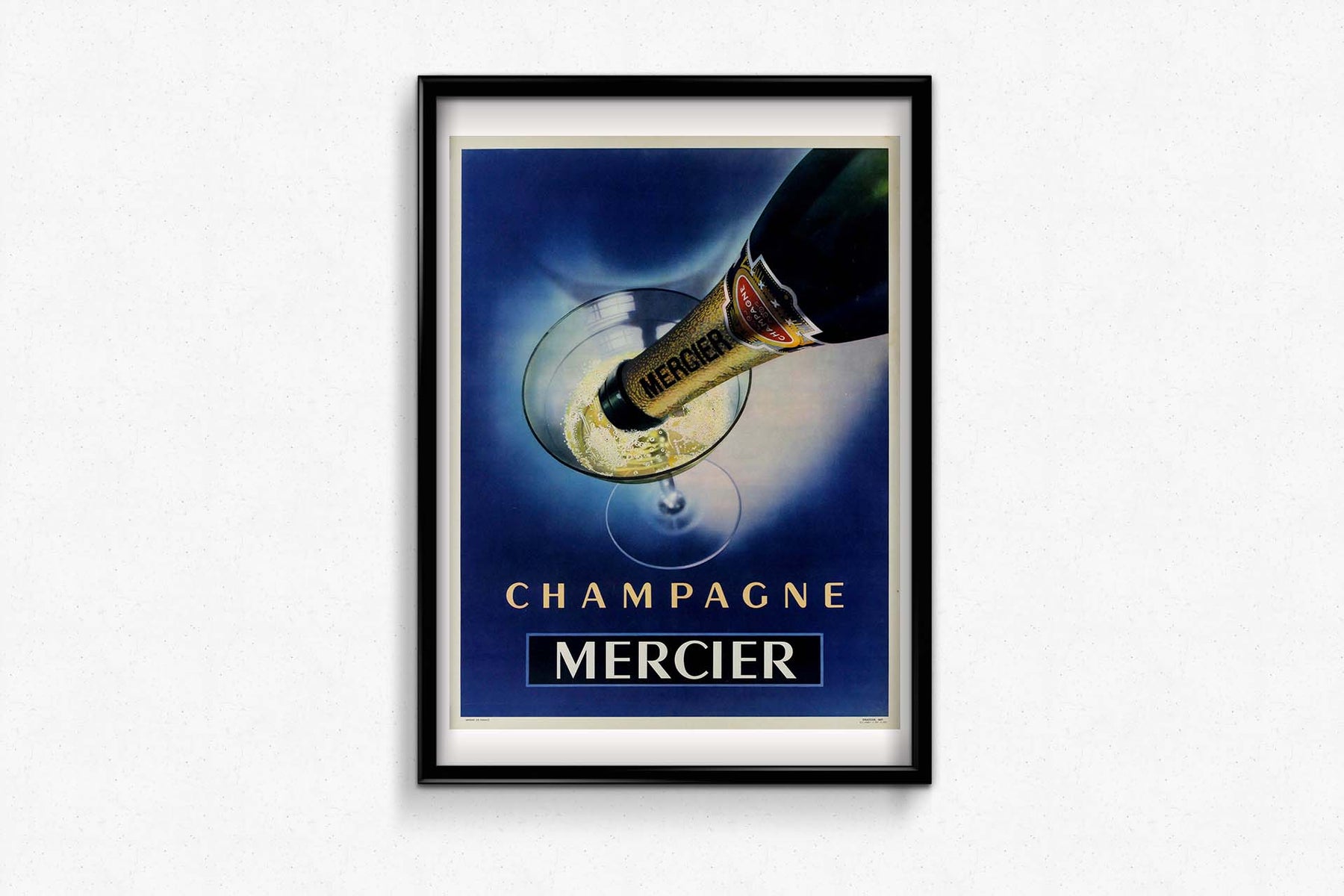 L'affiche publicitaire de Champagne Mercier de 1948 est un témoignage remarquable d'une période d'optimisme renouvelé après la Seconde Guerre mondiale. Cette époque, caractérisée par un regain de raffinement et d'élégance, est magnifiquement retranscrite dans les supports marketing de l'époque, dont l'affiche de Champagne Mercier est un parfait exemple.