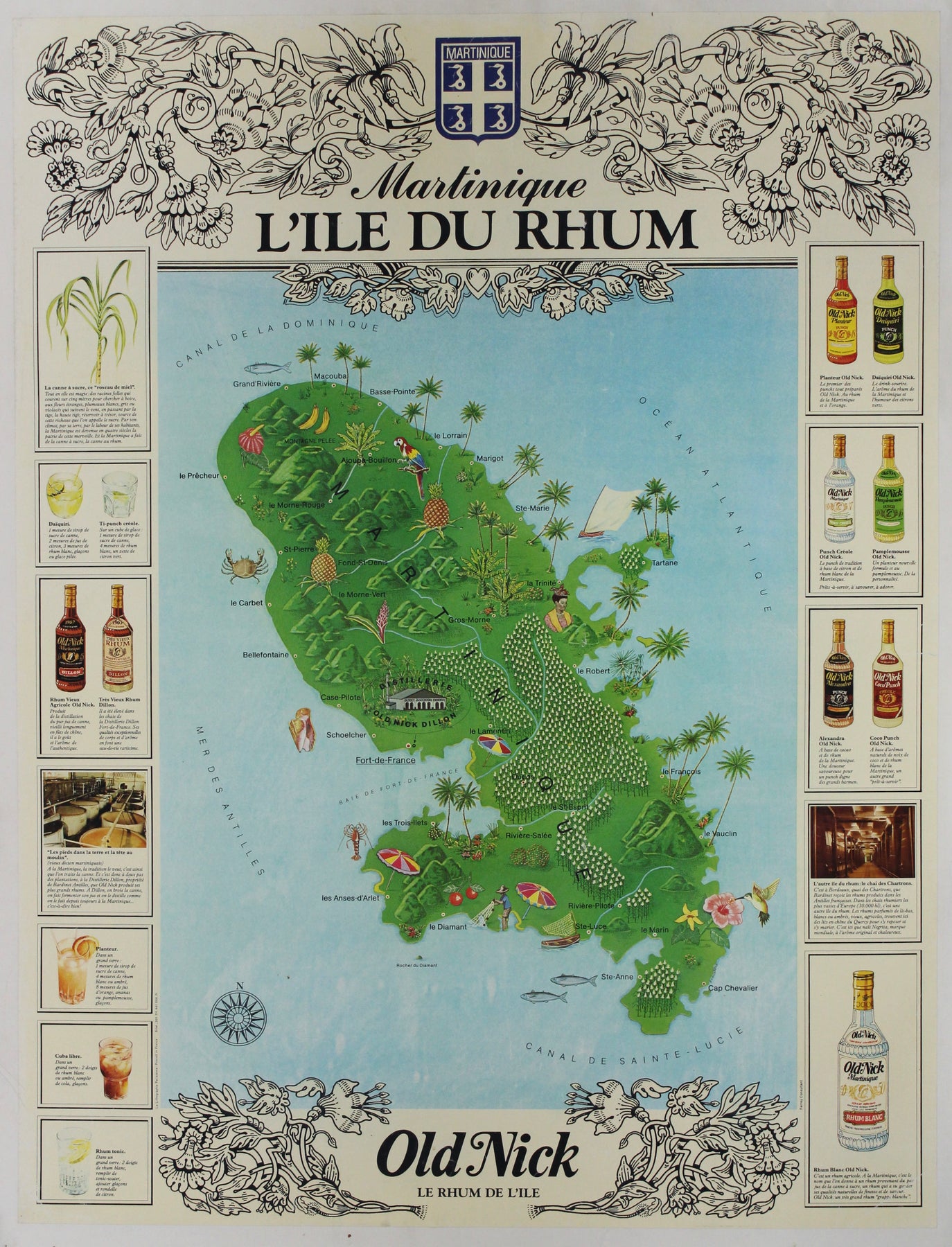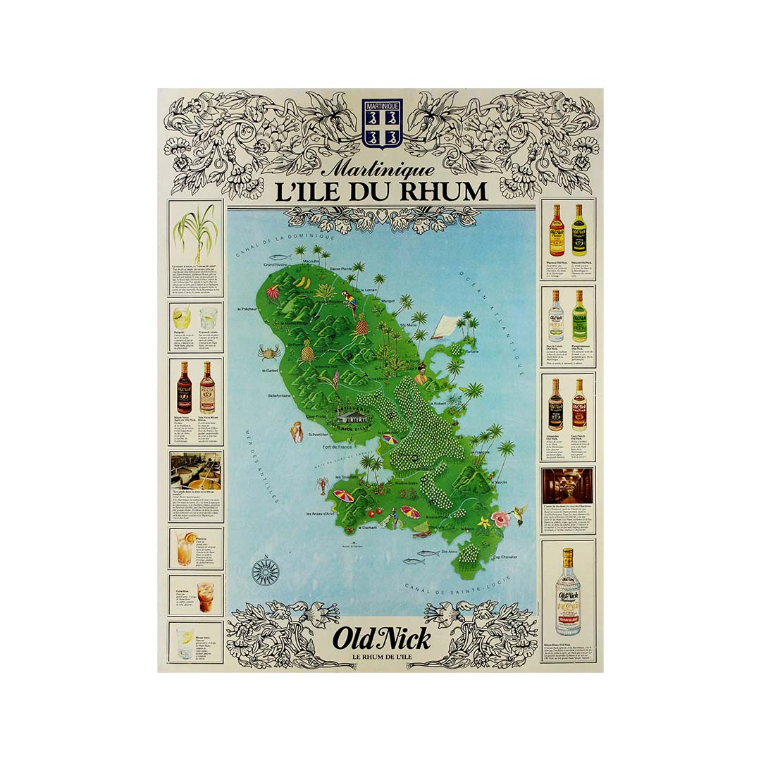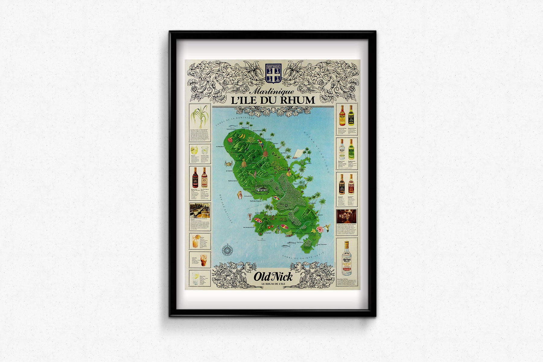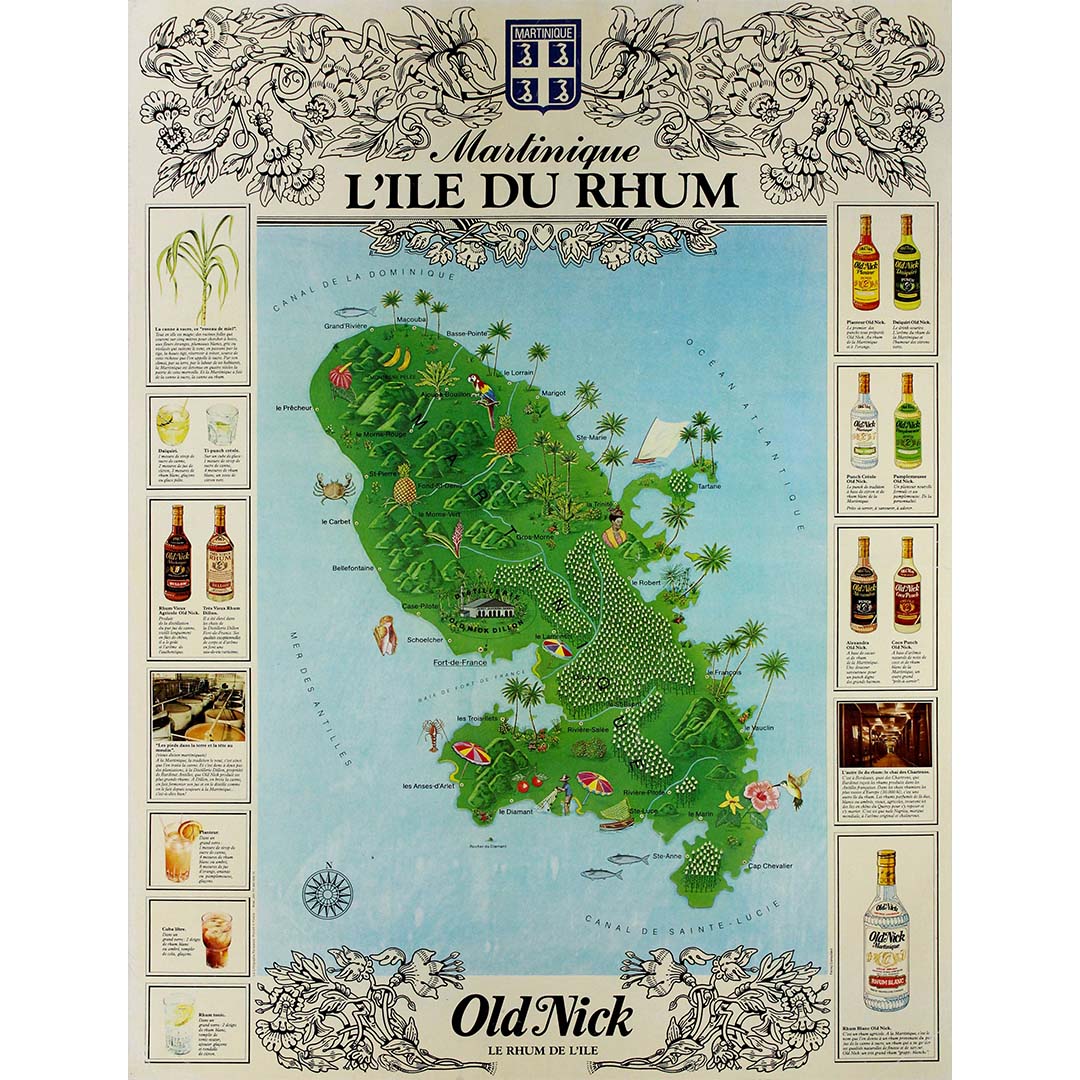 Cette affiche présente probablement des descriptions ou des illustrations détaillées des différentes variétés de rhum Old Nick , ainsi que des informations sur le processus de distillation, les notes de dégustation et l'histoire de la marque. Elle peut également inclure des images du paysage local, des distilleries et peut-être des scènes traditionnelles martiniquaises, évoquant ainsi un sentiment d'authenticité et de proximité avec le lieu.