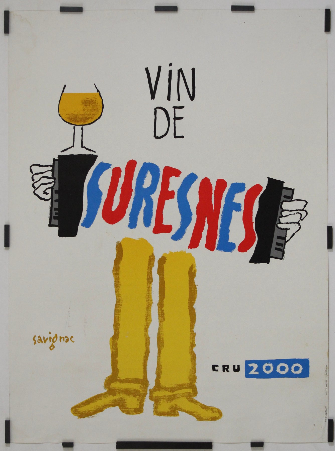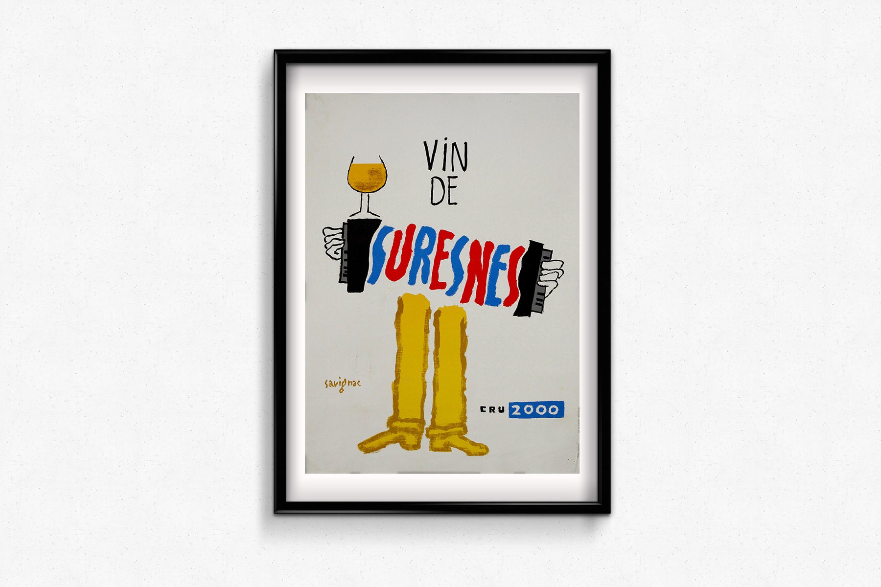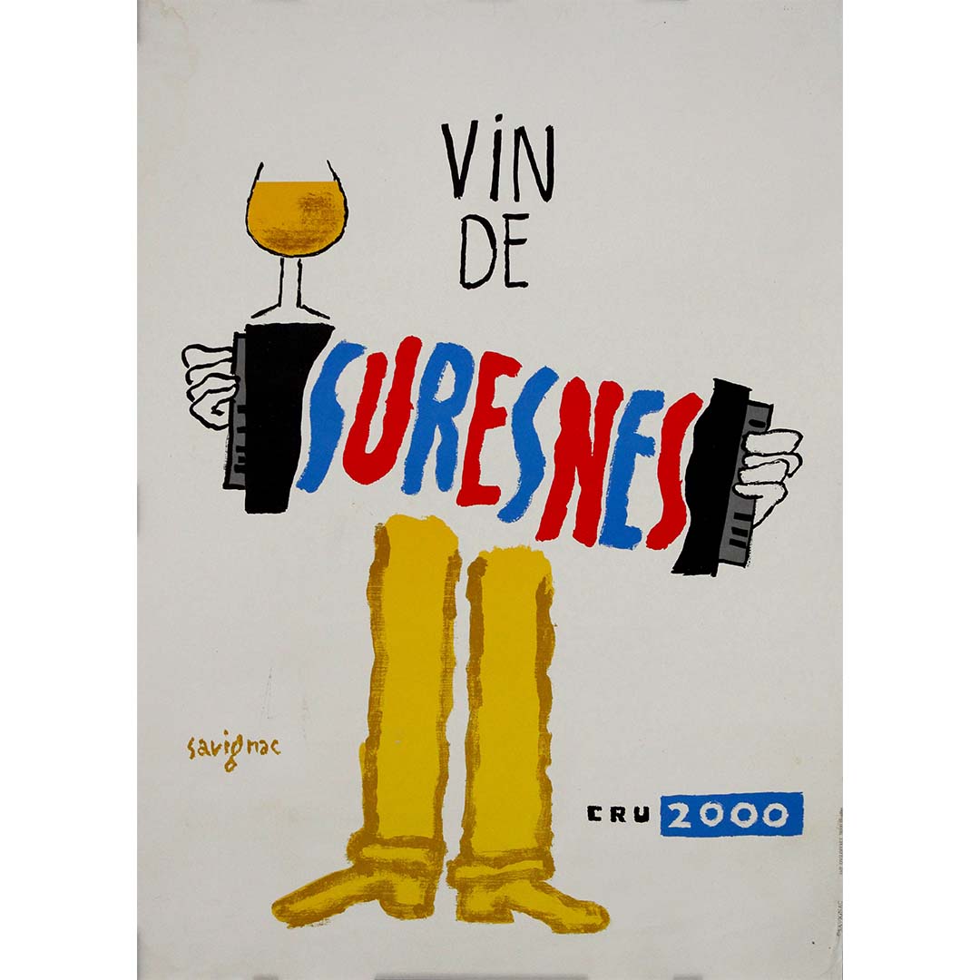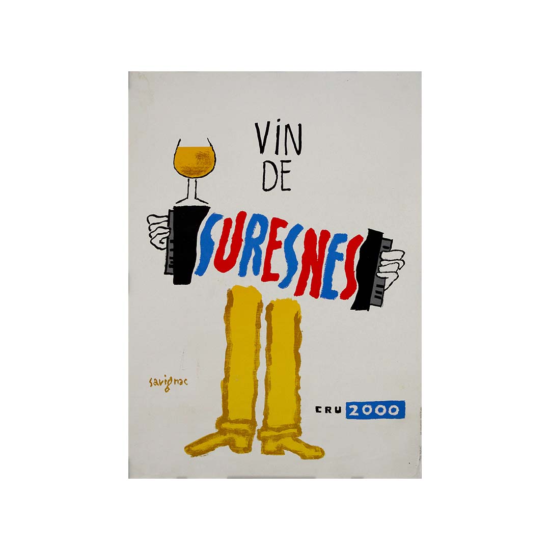 Cette affiche originale de 2000, signée Raymond Savignac, a été créée pour promouvoir le Vin de Suresnes, un vignoble urbain unique situé aux portes de Paris. Reconnu pour son style spirituel, coloré et immédiatement reconnaissable, Savignac a imaginé cette composition ludique mettant en scène un personnage dont le corps est remplacé par une typographie audacieuse, peinte à la main. Chaussé de bottes dorées, il tient un accordéon d'une main et un verre de vin de l'autre, évoquant l'esprit festif et dynamique de la culture viticole française.