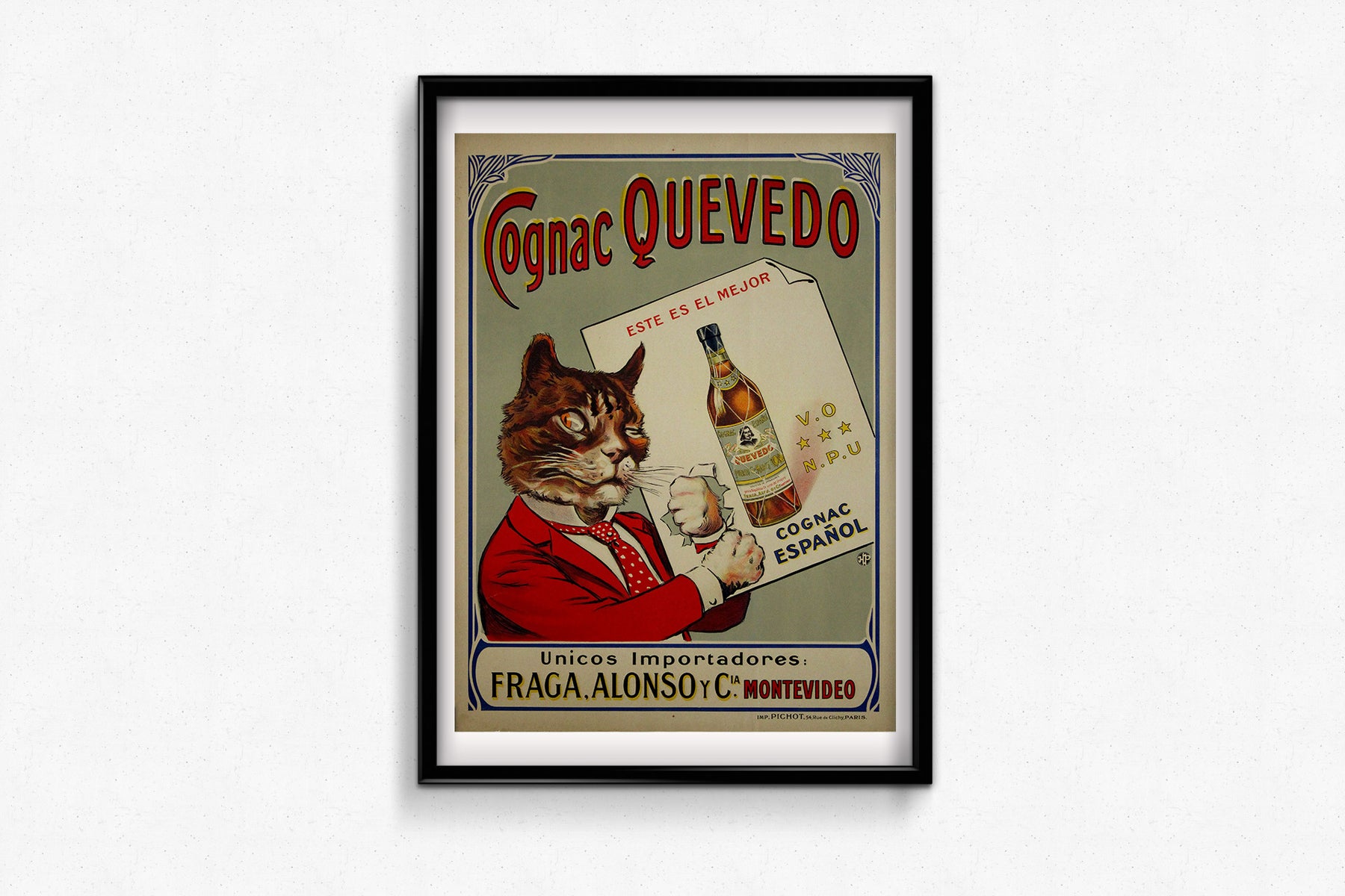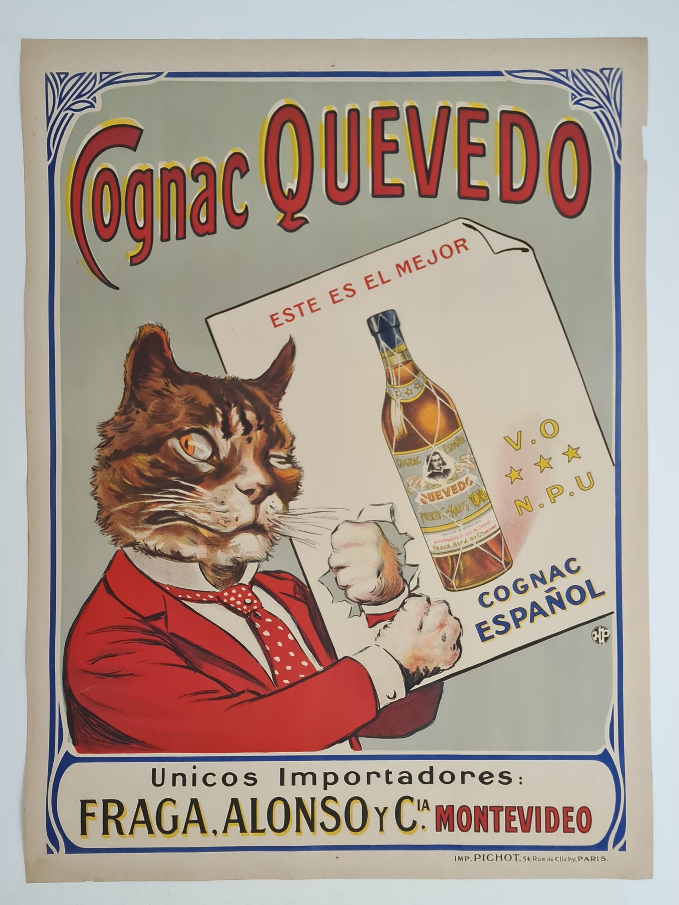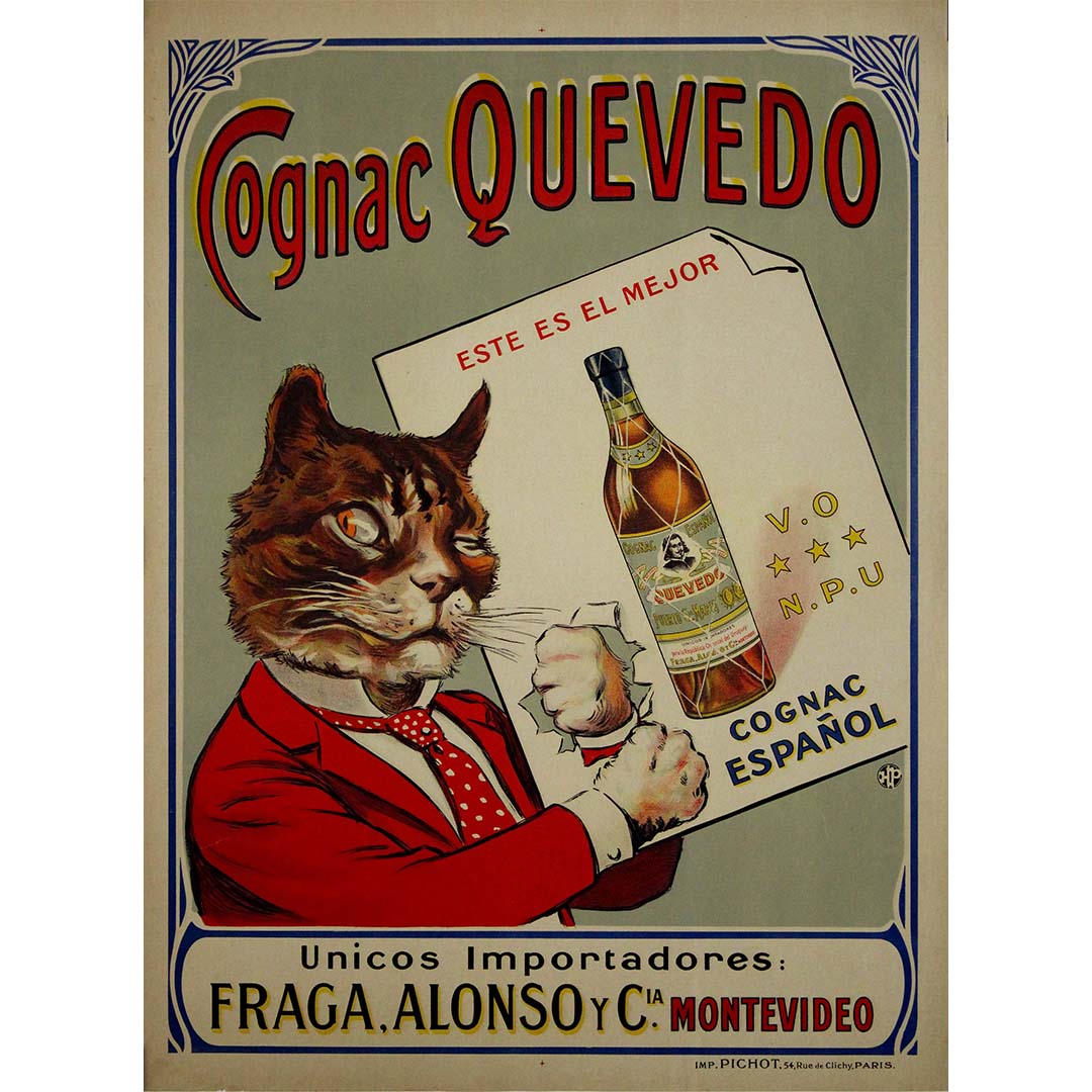 Cette affiche publicitaire vintage originale pour le Cognac Quevedo est un exemple remarquable de l'art commercial du début du XXe siècle. Elle allie humour, élégance et visuels saisissants pour promouvoir ce cognac espagnol. L'illustration met en scène un chat anthropomorphe, impeccablement vêtu d'un costume rouge et d'une cravate à pois, tenant avec assurance une carte présentant une bouteille de Cognac Quevedo . Le design, à la fois ludique et sophistiqué, capte l'attention et reflète le caractère raffiné et audacieux de la marque.