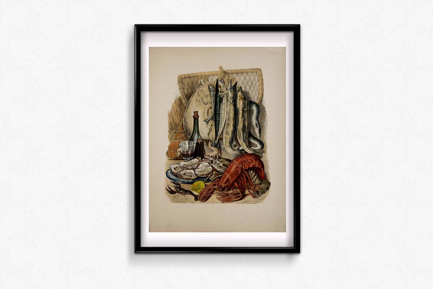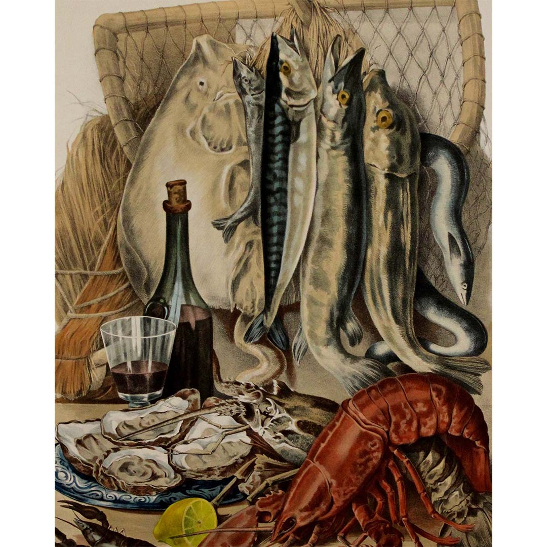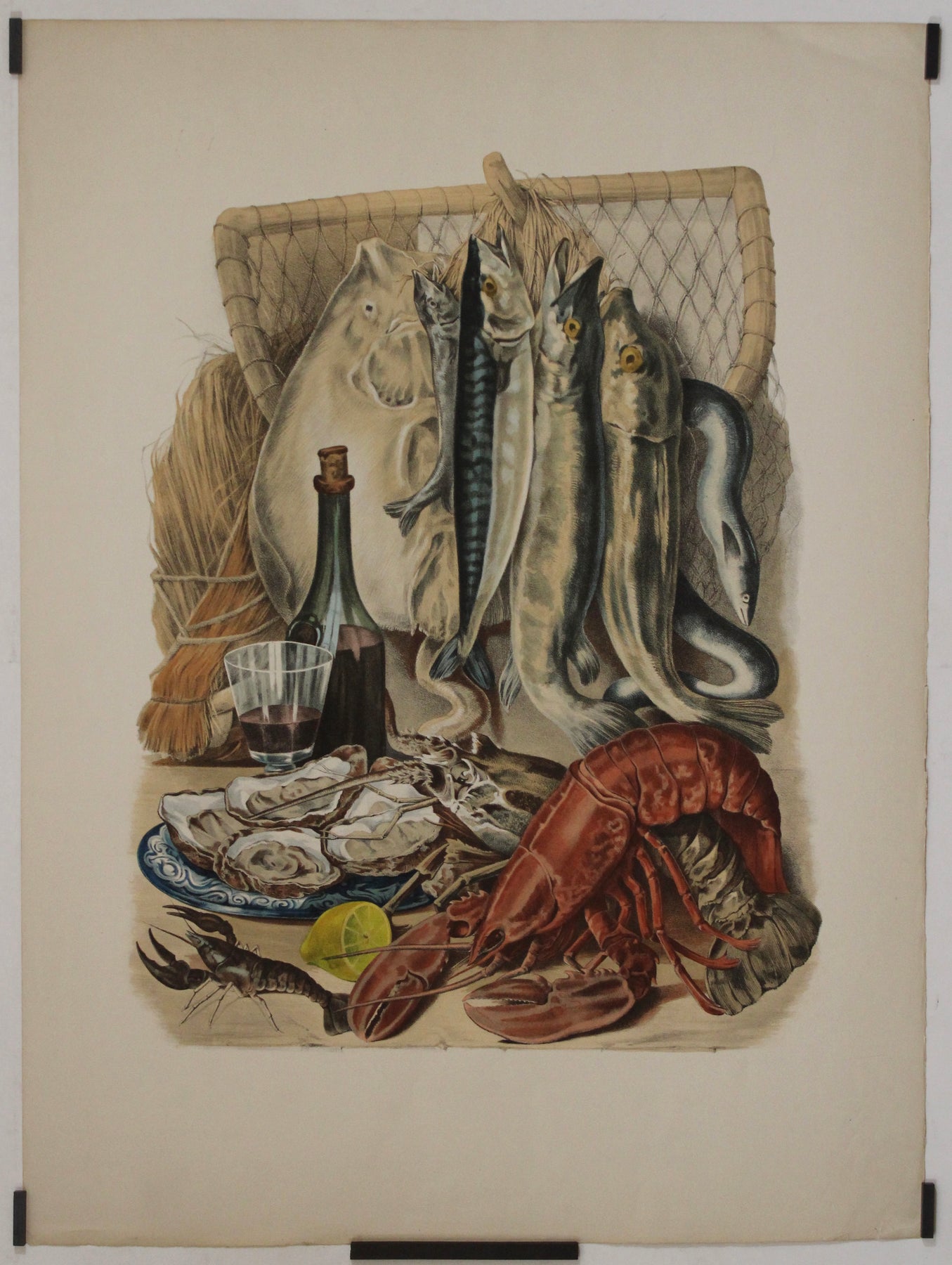 Des lithographies comme celle-ci étaient fréquemment utilisées dans les guides gastronomiques, les supports pédagogiques ou la décoration des restaurants, témoignant du lien culturel profond qui unissait les communautés côtières à leurs traditions culinaires liées aux fruits de mer. La finesse des détails représentant les poissons, les coquillages et les crustacés illustre la précision et le raffinement de la lithographie, une technique qui connut un essor considérable à cette époque.