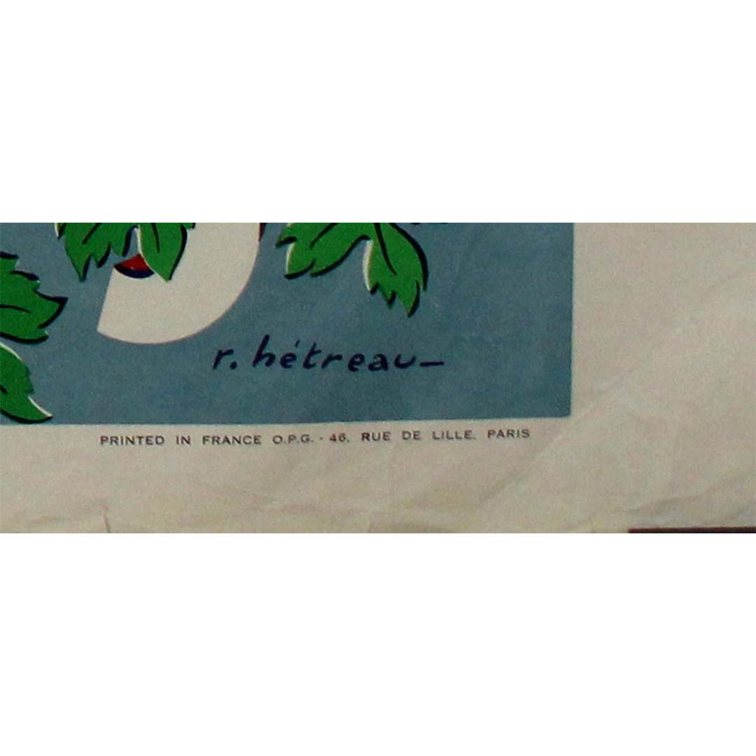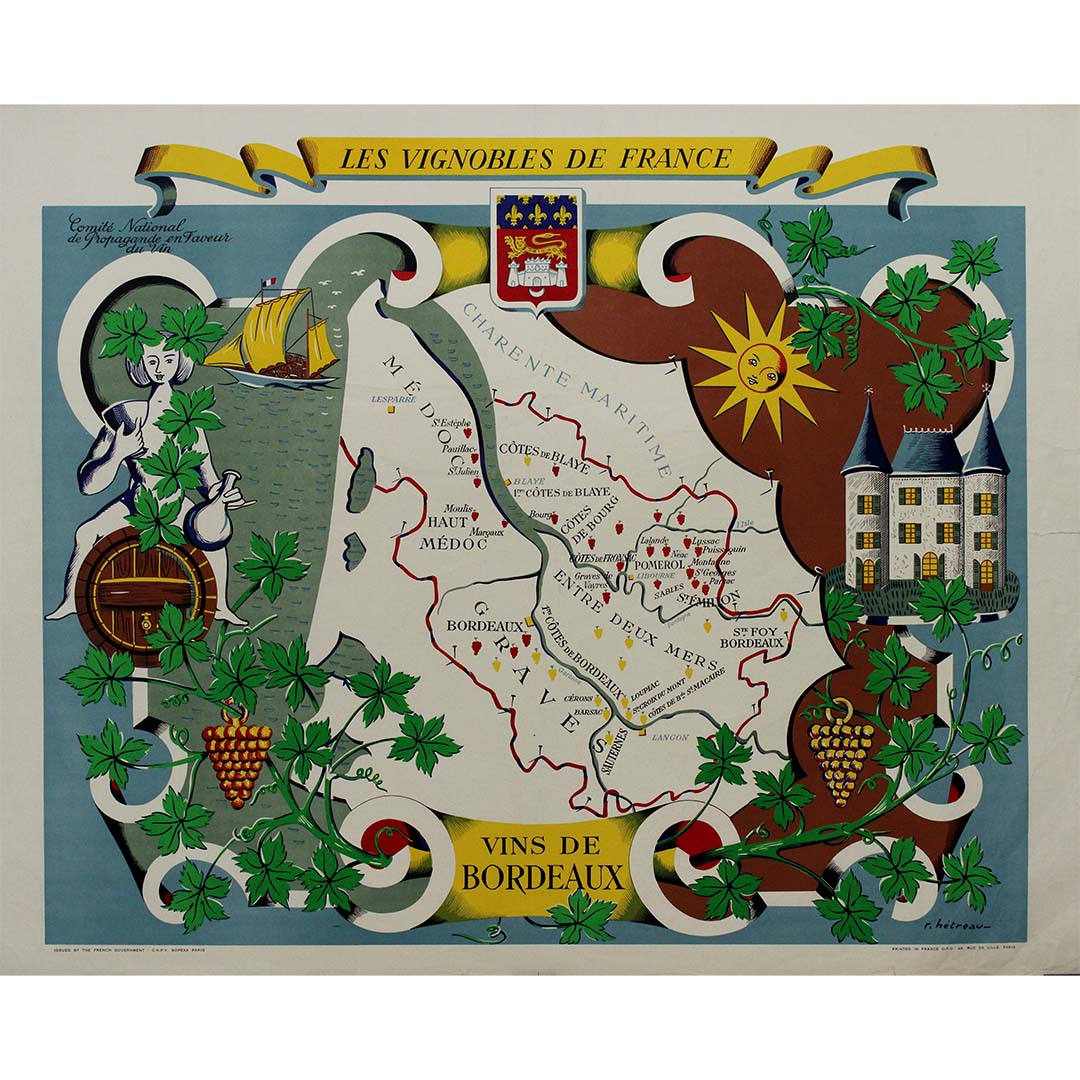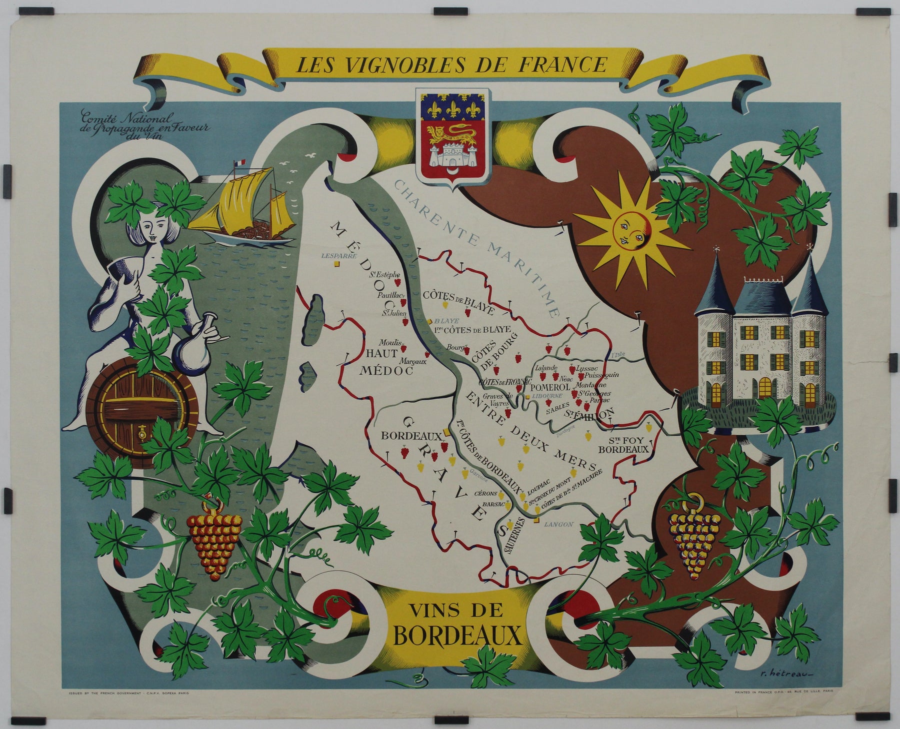 Rémy Hétreau (1913-2001), illustrateur et designer français de renom, était célèbre pour ses élégantes cartes dessinées à la main qui donnaient vie à l'identité culturelle et géographique de la France. Son travail sur cette affiche capture le romantisme, le savoir-faire et le prestige de l'industrie vinicole bordelaise dans un style intemporel du milieu du XXe siècle.