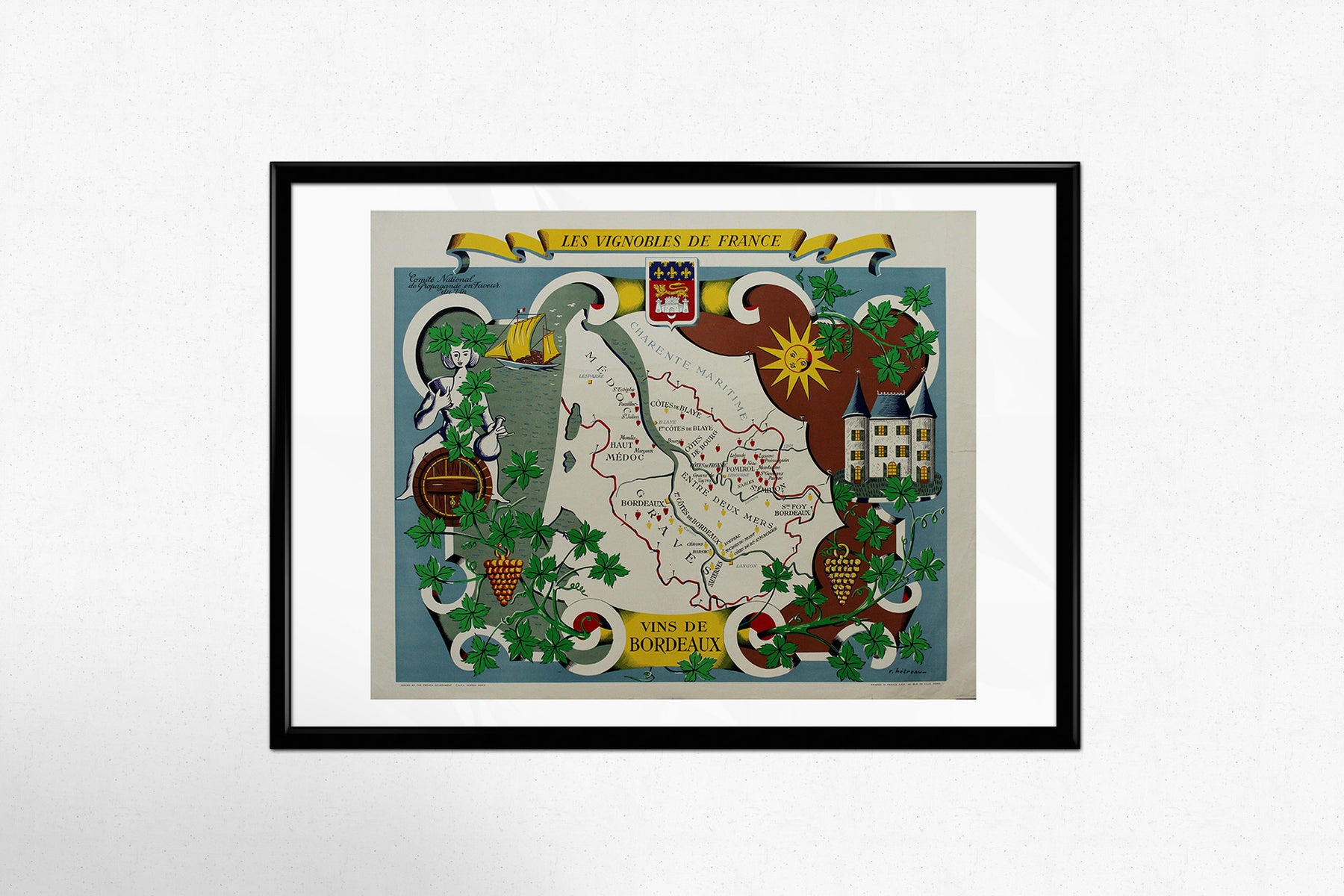 Aujourd'hui, cette carte des vins ancienne est très recherchée par les collectionneurs d'objets liés au vin français, d'affiches de voyage et d'art graphique du milieu du XXe siècle. Elle constitue à la fois un témoignage historique et un objet décoratif, idéal pour les amateurs de vin, les connaisseurs et les passionnés de Bordeaux.