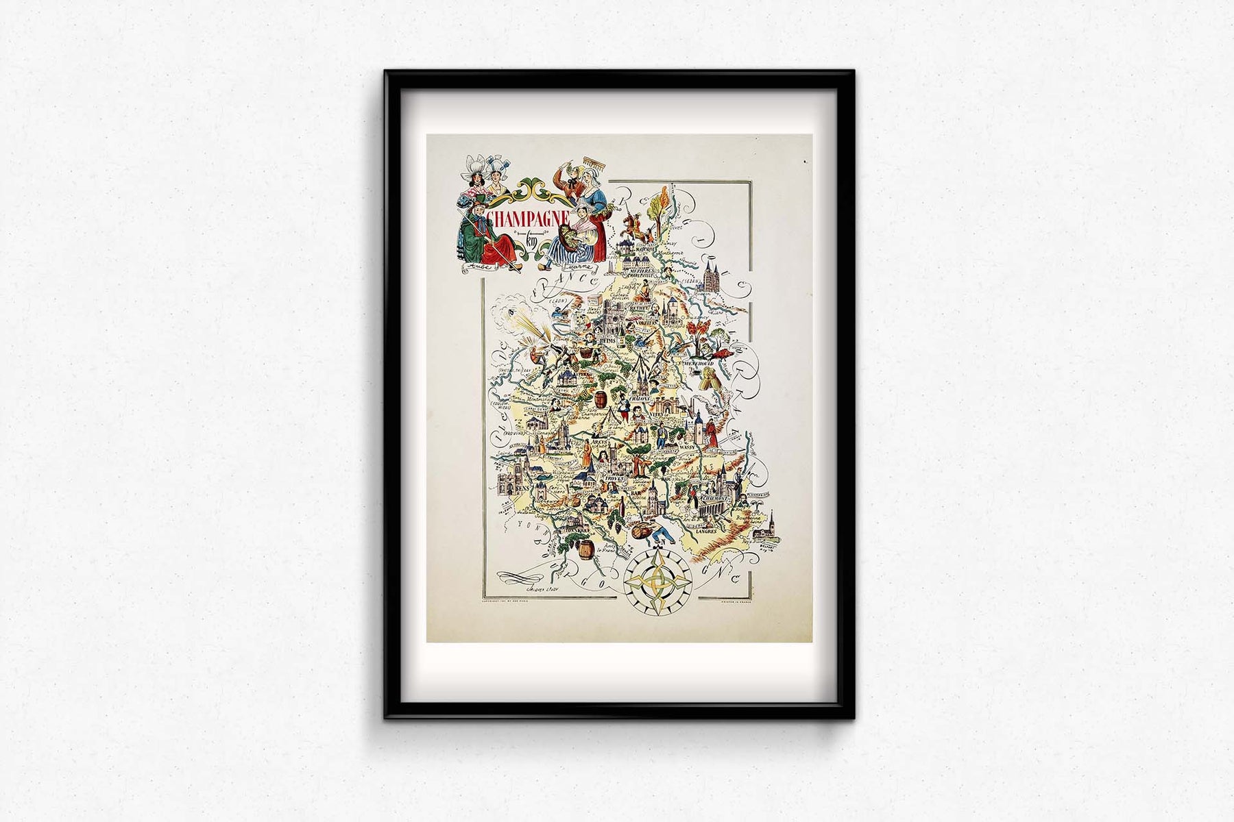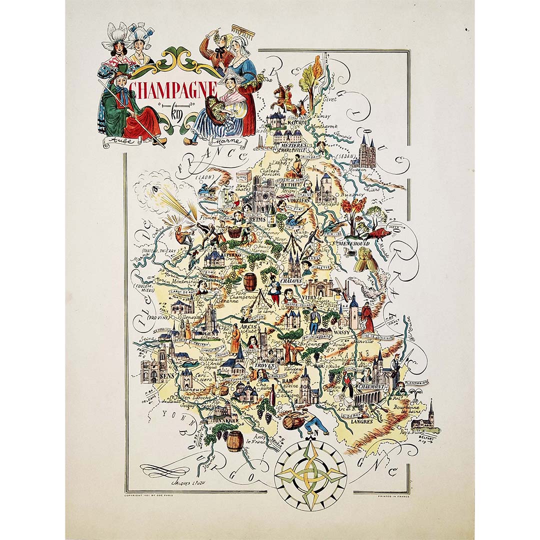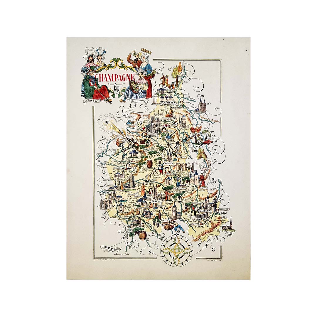 Magnifique carte illustrée de la région Champagne par Jacques Liozu. On sait peu de choses sur cet illustrateur, né à Albi en 1910 et décédé à Bourg-Madame en 1974. Il travailla principalement pour les maisons d'édition Odé, Chantal de Toulouse et Gründ. Célèbre pour ses cartes géographiques, il illustra également des cartes postales, des planches didactiques et des récits historiques pour la jeunesse.