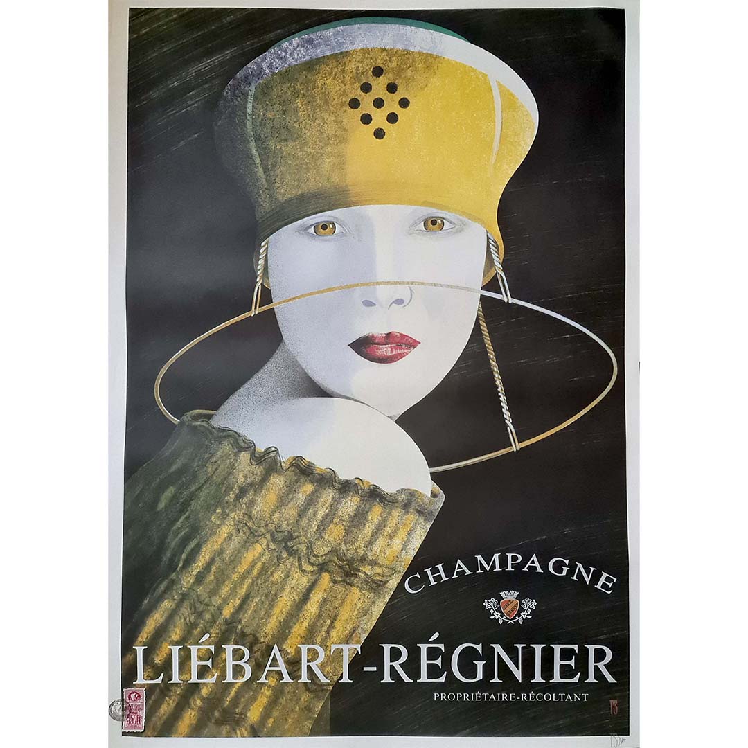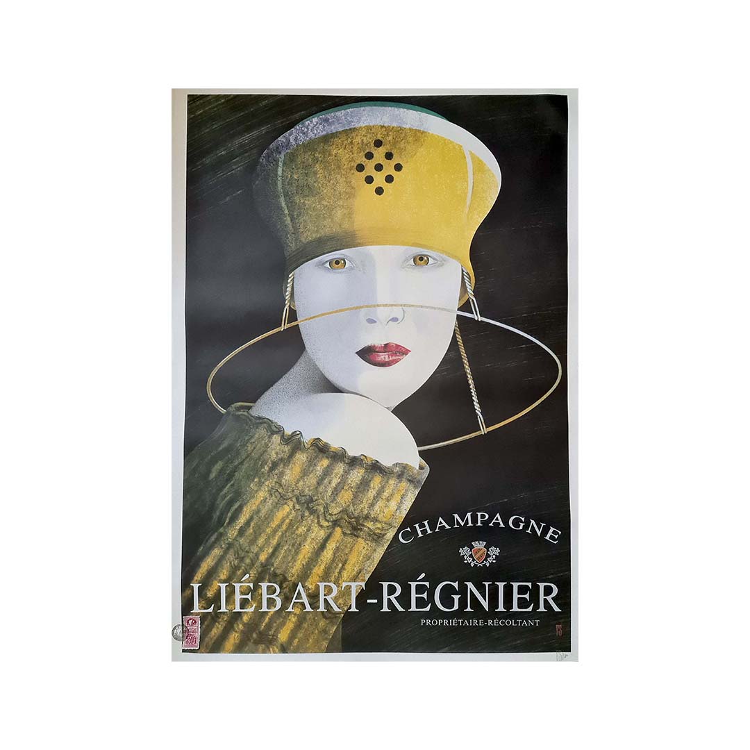 L'affiche publicitaire originale de Philippe Sommer pour le Champagne Liébart Régnier Propriétaire Récoltant capture l'essence du luxe et de la célébration associés au Champagne. Créée par Philippe Sommer, graphiste français de renom, reconnu pour son style élégant et raffiné, cette affiche invite visuellement à savourer le meilleur Champagne produit par Liébart Régnier.