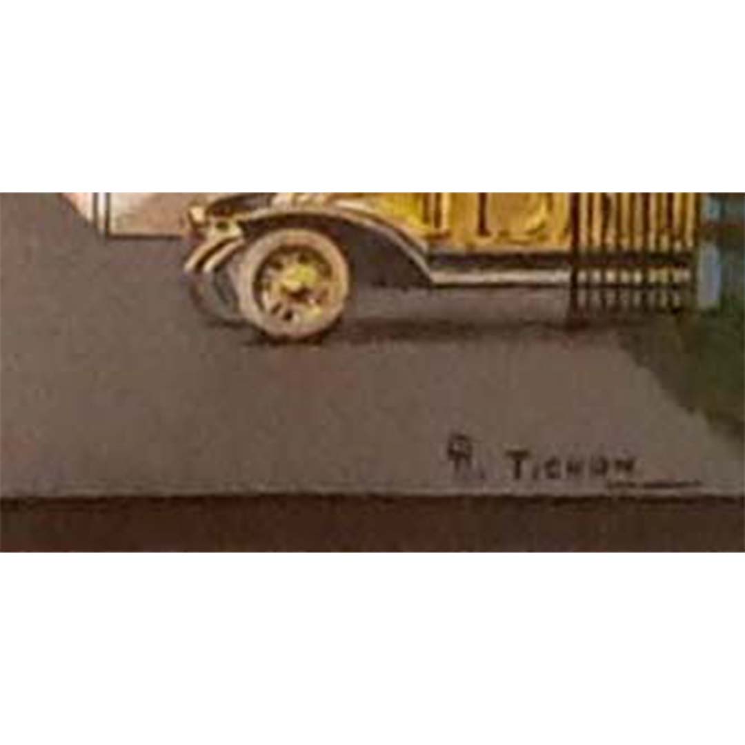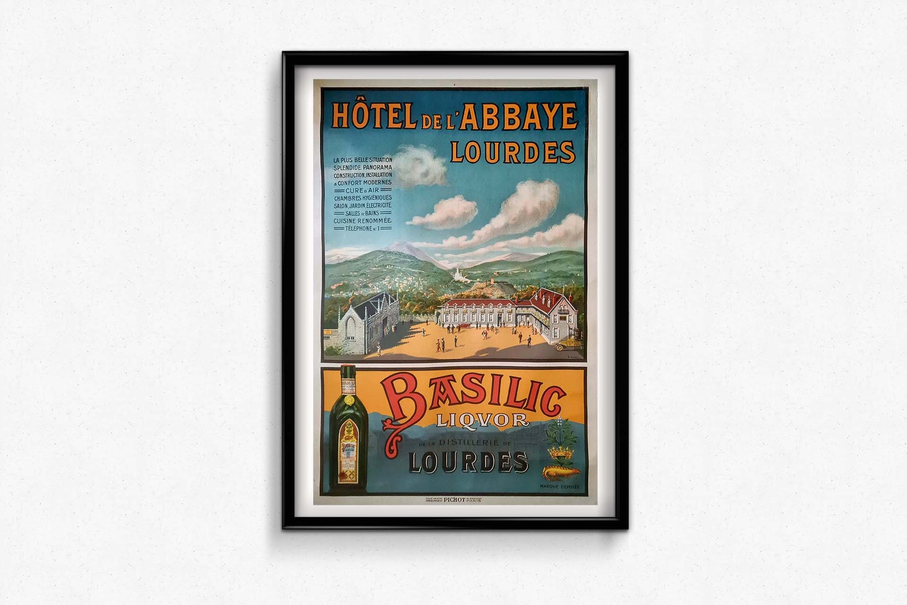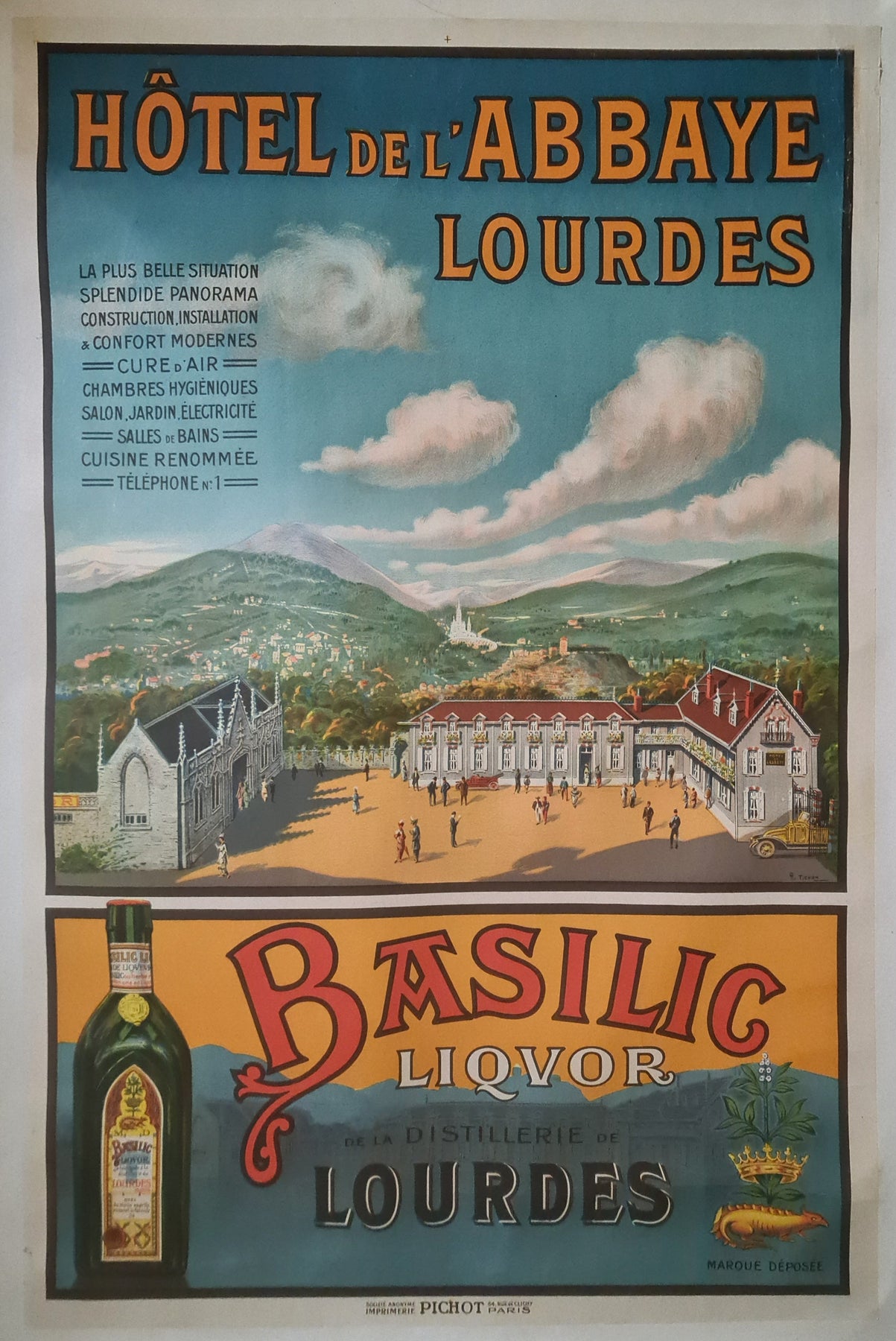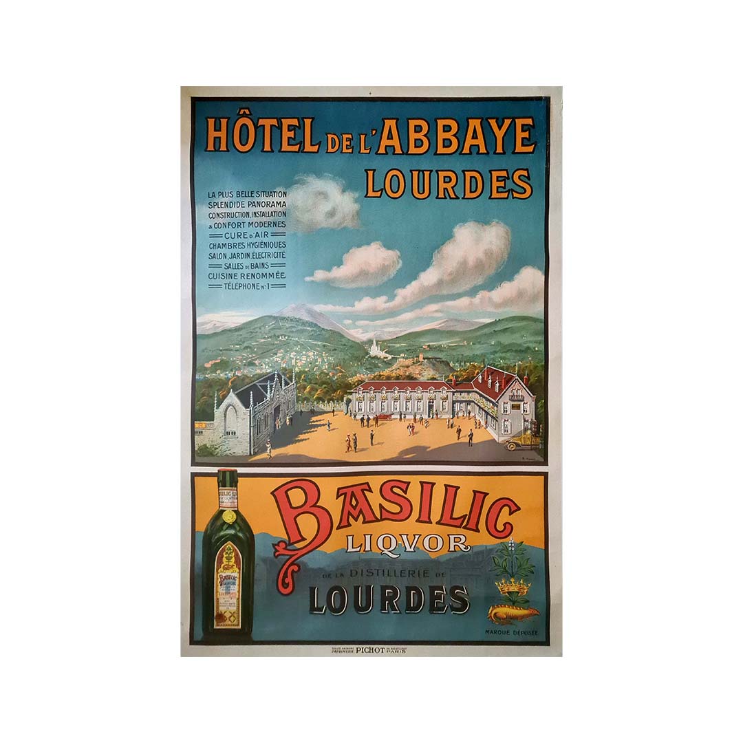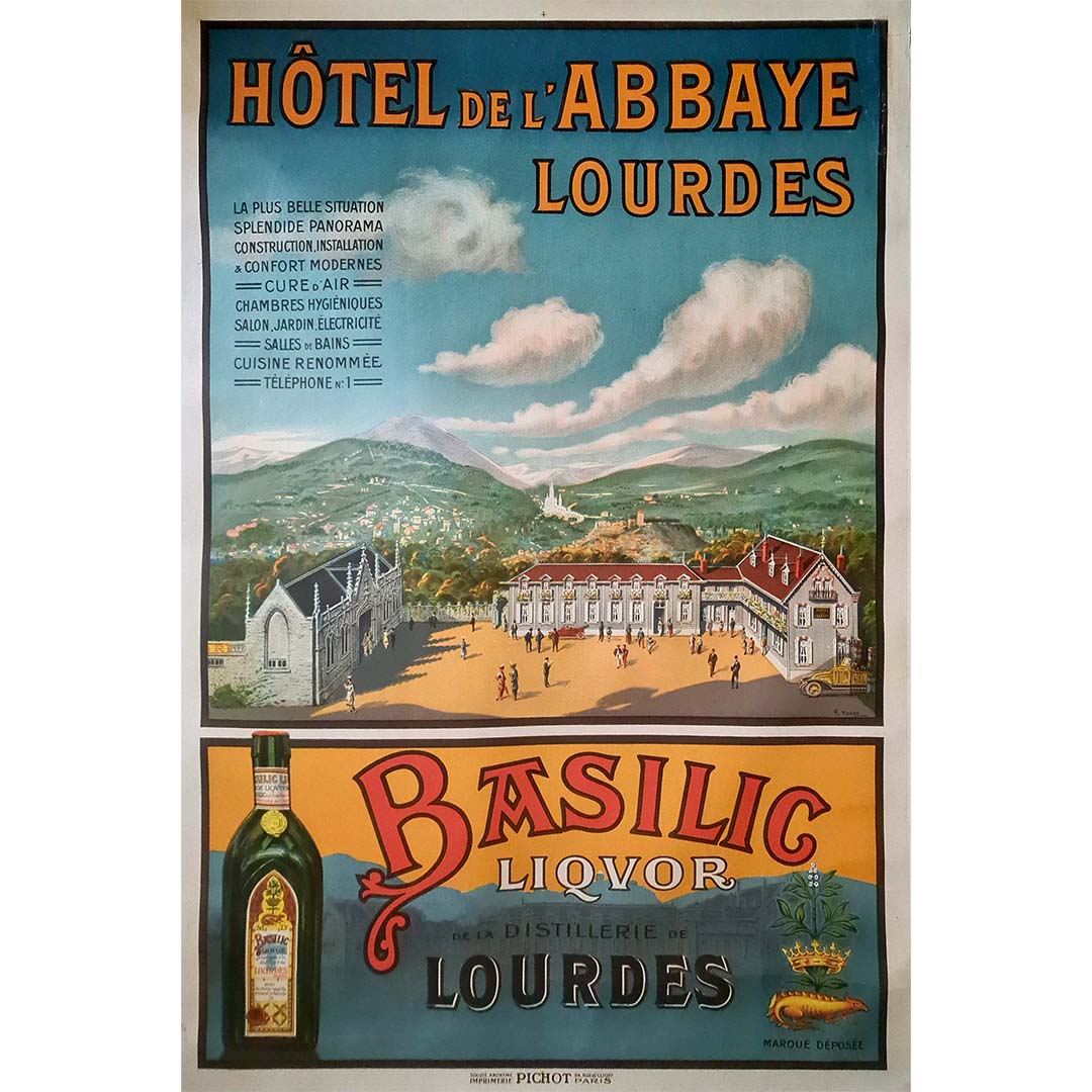 Magnifique affiche de Charles Tichon pour l'Hôtel de l'Abbaye à Lourdes. Lourdes est une ville du sud-ouest de la France, au pied des Pyrénées. Elle est célèbre pour ses sanctuaires dédiés à Notre-Dame de Lourdes, un important lieu de pèlerinage catholique. Chaque année, des millions de personnes visitent la grotte de Massabielle (grotte des Apparitions) où, en 1858, la Vierge Marie serait apparue à une habitante de la région.