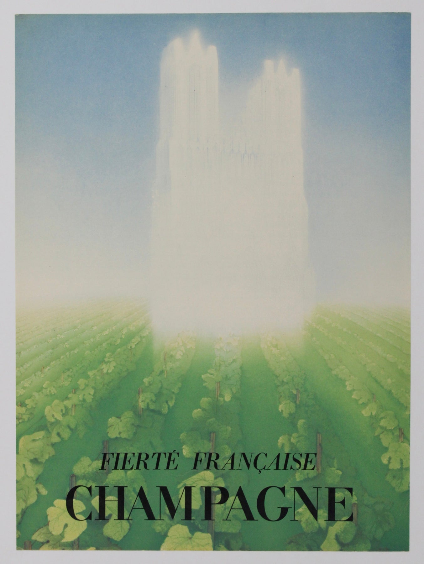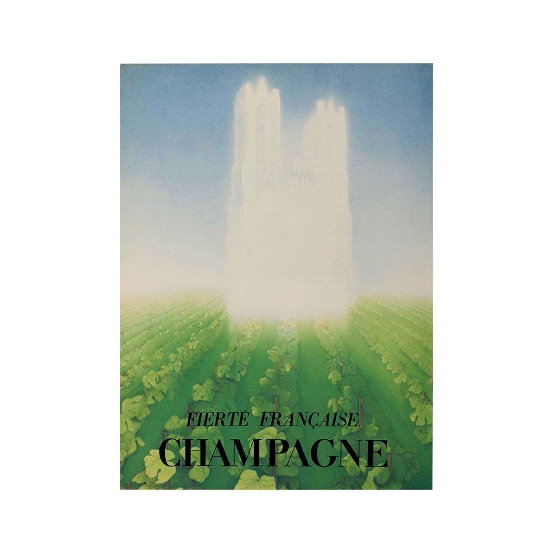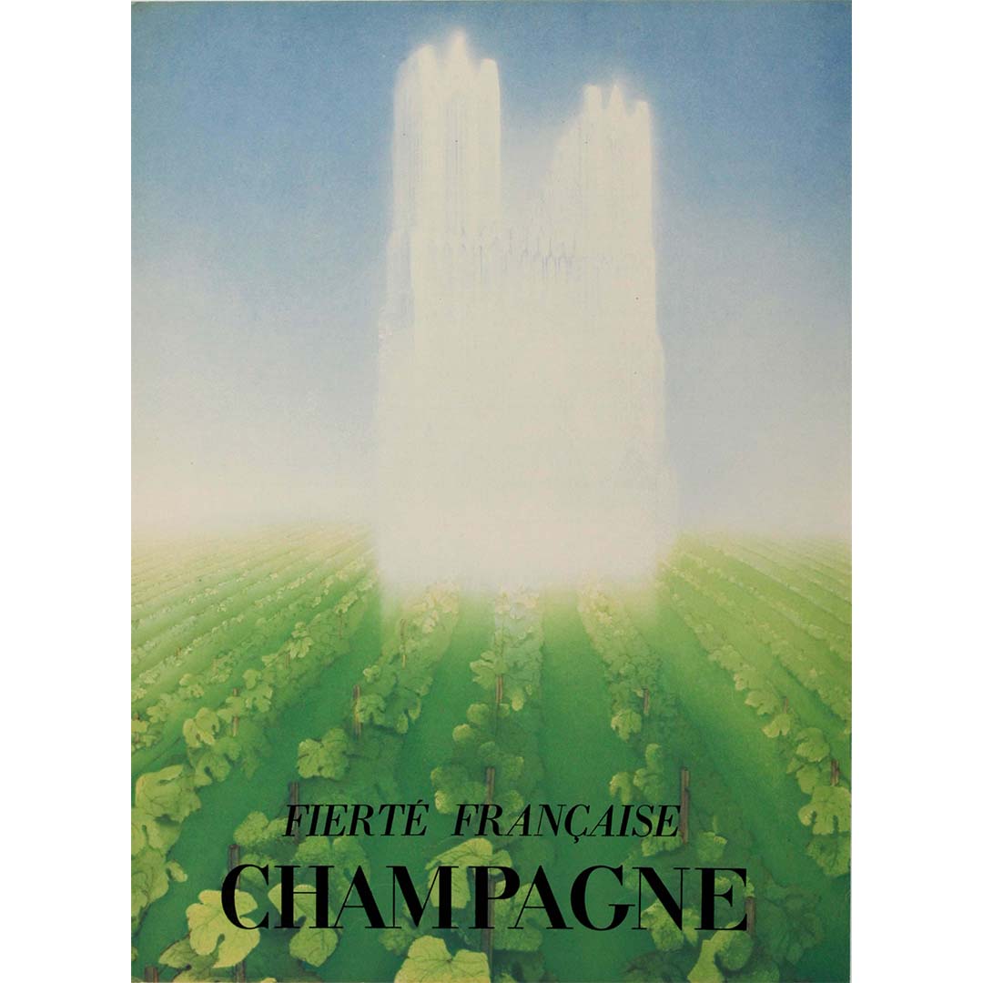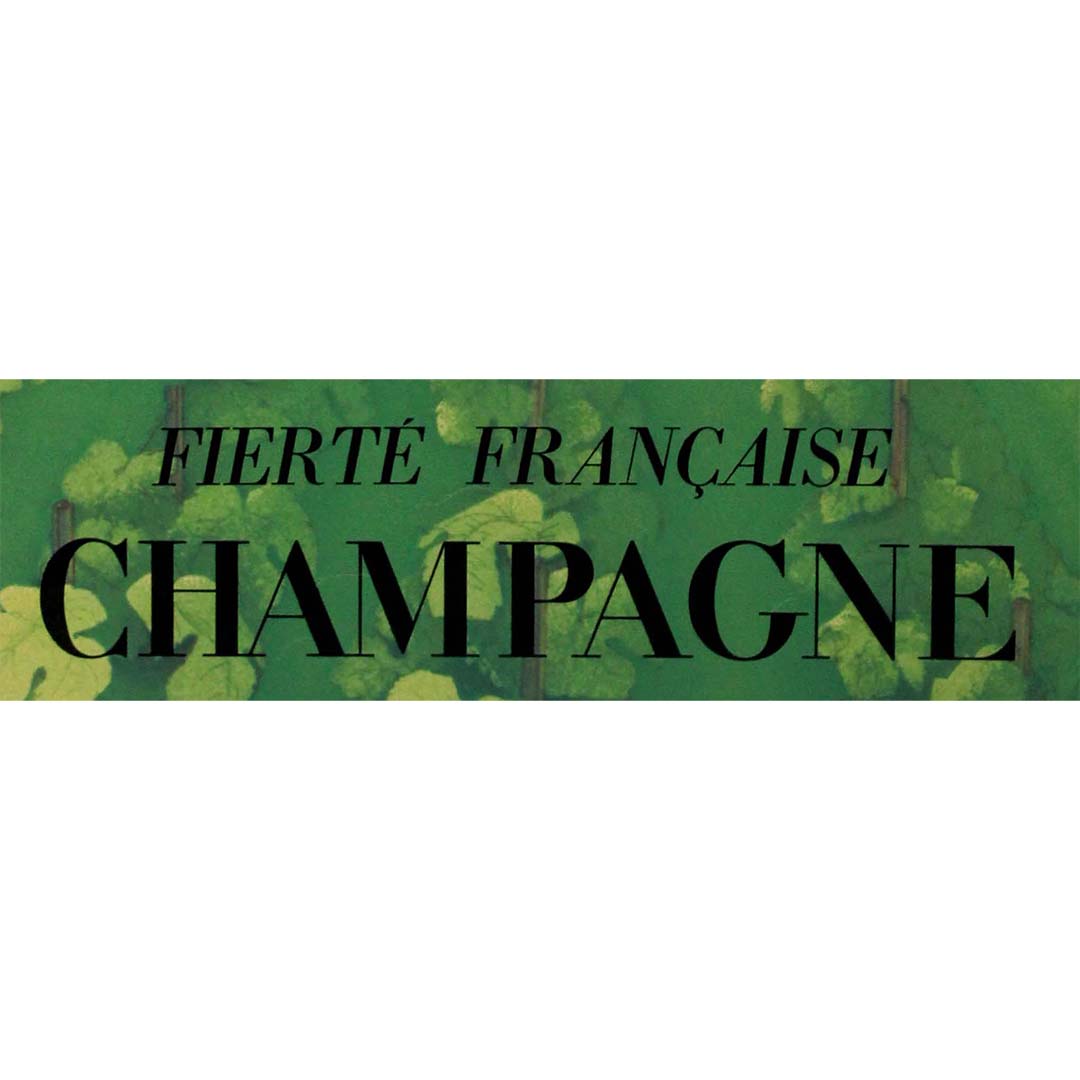« Fierté Française Champagne » transporte le spectateur dans un univers de luxe et de fête, où le champagne règne en maître, boisson de prédilection des connaisseurs les plus exigeants. La typographie audacieuse et la composition dynamique, savamment maîtrisées par Iribe, captivent le regard, tandis que les couleurs riches et les détails raffinés évoquent une impression d'opulence et de grandeur.