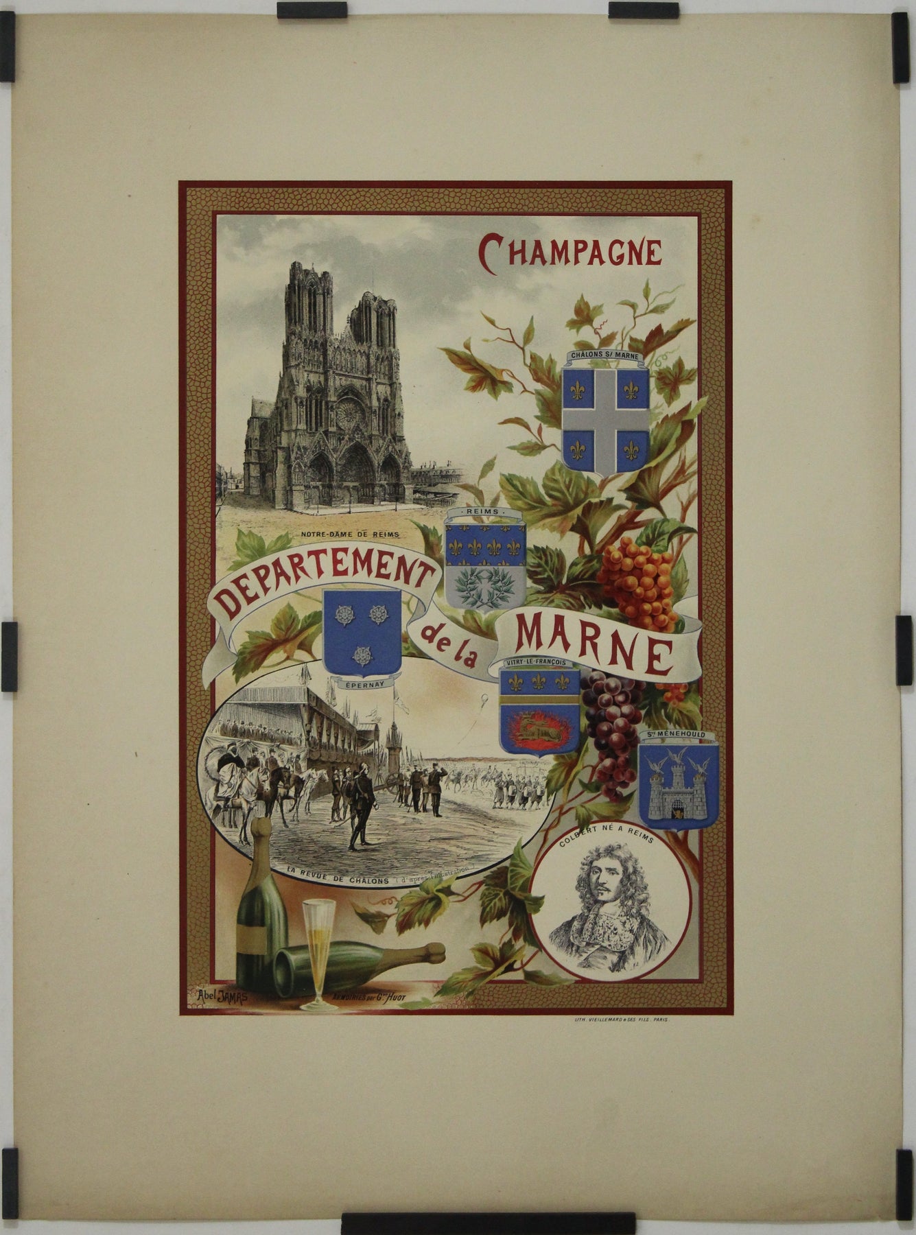 La partie inférieure de l'affiche présente une scène du défilé militaire de Châlons-sur-Marne, illustrant la fierté régionale et l'importance historique de cet événement. L'illustration inclut également un portrait de Jean-Baptiste Colbert, homme d'État français influent, né à Reims. Colbert fut ministre des Finances sous le roi Louis XIV et joua un rôle déterminant dans le développement de l'économie française au XVIIe siècle.