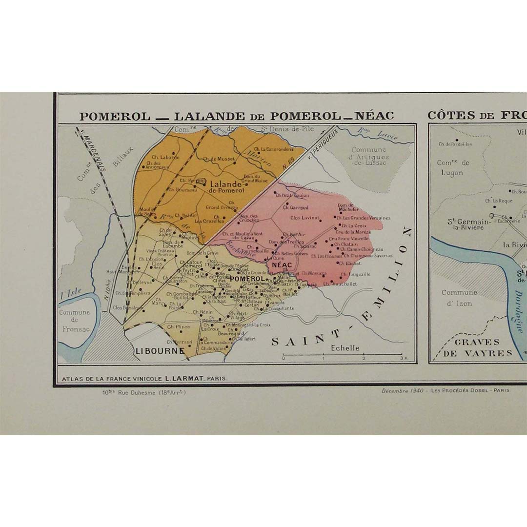 Cette carte de 1941 est non seulement un outil précieux pour les professionnels du vin, mais aussi un magnifique témoignage historique. Son alliance de talent et de précision en fait un objet intemporel, immortalisant une époque où la viticulture française, et plus particulièrement bordelaise, était confrontée à la fois à la continuité et aux défis. Pour tout amateur de vins de Bordeaux, la représentation de Saint-Émilion, Pomerol, Néac et Fronsac par Larmat offre une compréhension visuelle riche de ce qui rend ces régions si exceptionnelles.