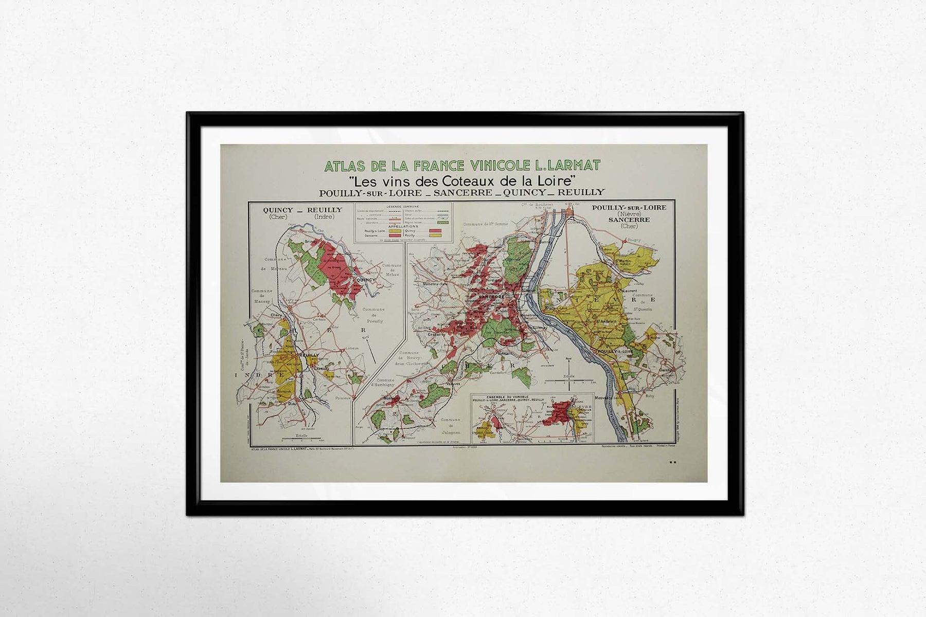 En conclusion, l’Atlas de la France Vinicole – Les Vins des Côteaux de la Loire : Pouilly-sur-Loire, Sancerre, Quincy, Reuilly de Louis Larmat est bien plus qu’une simple carte ; il est le reflet du riche patrimoine viticole français et de l’héritage durable de ses régions viticoles. Par son art alliant beauté et précision géographique, Larmat a créé une carte qui non seulement informe, mais aussi inspire, offrant un aperçu du charme intemporel de la Vallée de la Loire et de ses vins. Qu’on l’apprécie pour sa valeur historique, son attrait esthétique ou son utilité pratique pour comprendre la géographie viticole de la Vallée de la Loire, cette carte demeure un trésor de l’histoire viticole française.