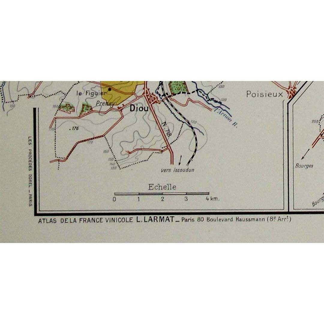 Prix régulier €600,00L' Atlas de la France Vinicole - Les Vins des Côteaux de la Loire : Pouilly-sur-Loire, Sancerre, Quincy, Reuilly, carte originale de 1946, créée par Louis Larmat et imprimée par Dorel à Paris, est une représentation saisissante et détaillée des célèbres régions viticoles du Val de Loire. Cette carte, qui fait partie du prestigieux Atlas de la France Vinicole de Larmat, est un hommage artistique et cartographique à quelques-unes des régions viticoles les plus renommées de France, et plus particulièrement aux vignobles de l'est de la Loire, qui comprennent les appellations prestigieuses de Pouilly-sur-Loire, Sancerre, Quincy et Reuilly.