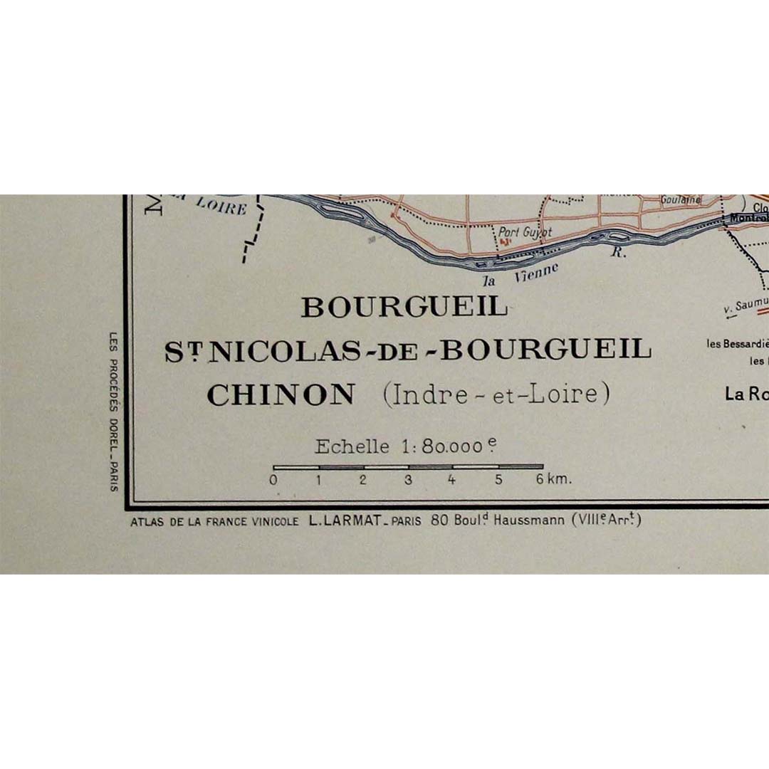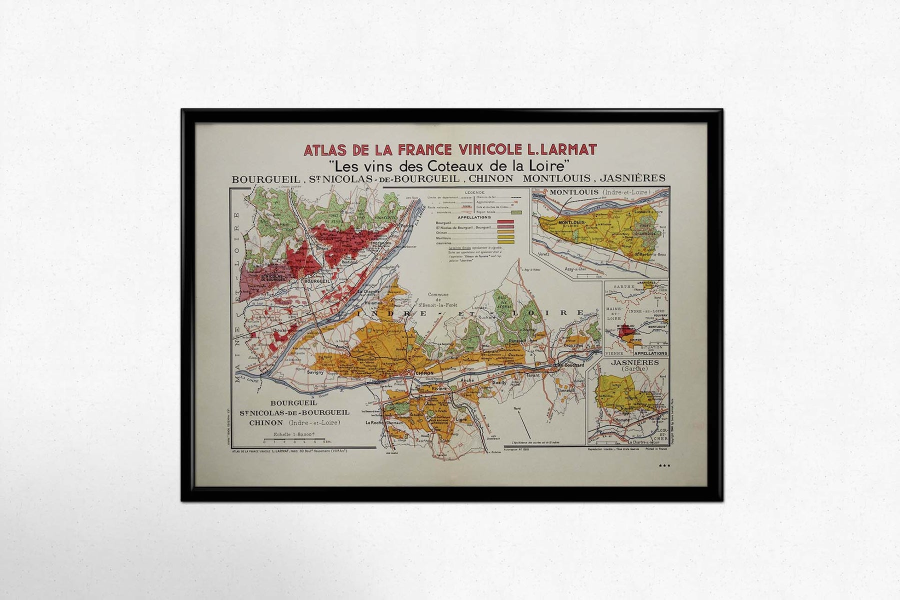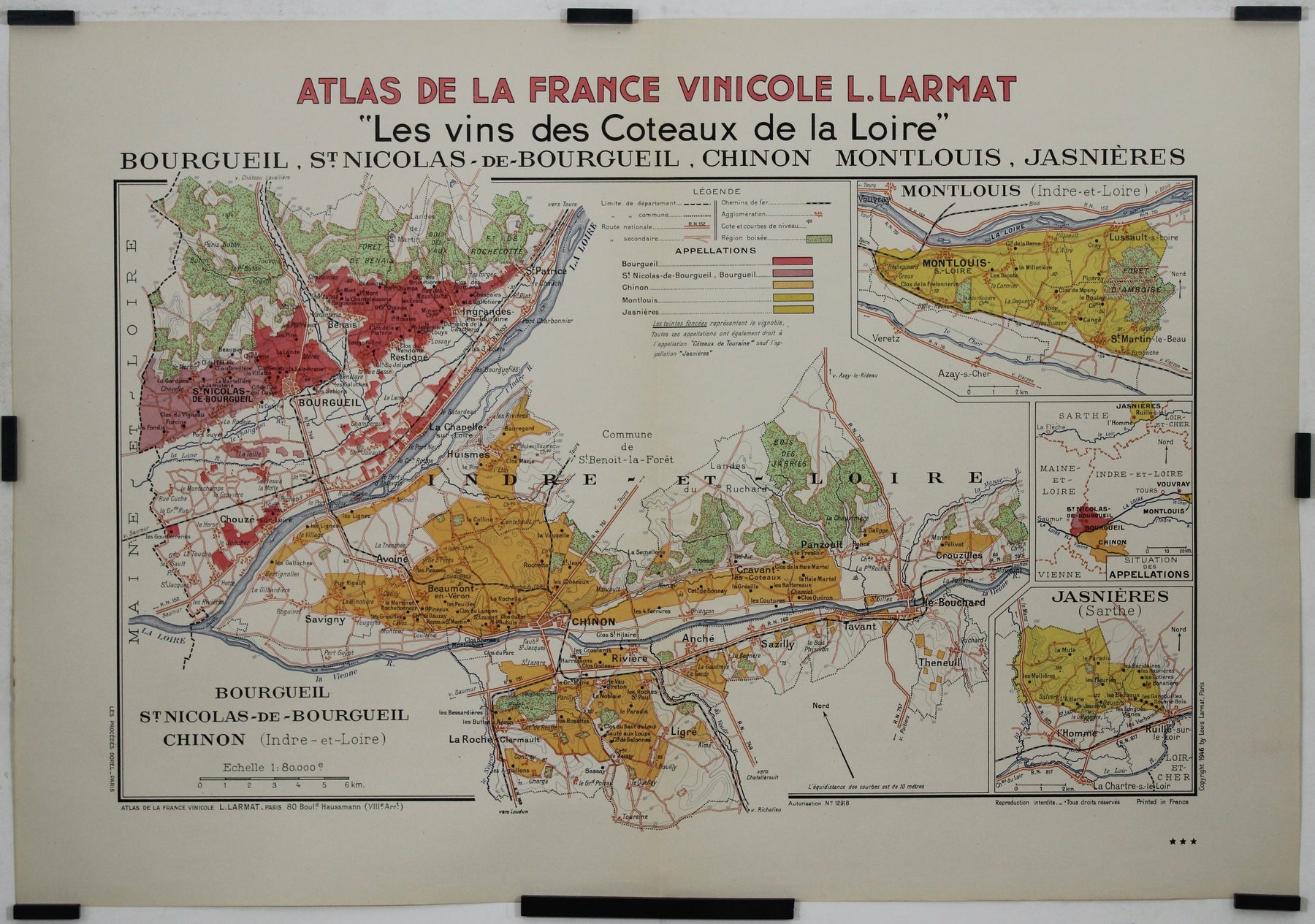 En conclusion, la carte des Vins des Côteaux de la Loire de Louis Larmat (1946) témoigne du riche patrimoine viticole de la vallée de la Loire. Elle capture l'essence de quelques-unes des appellations les plus importantes de la région – Bourgueil, Saint-Nicolas-de-Bourgueil, Chinon, Montlouis et Jasnières – grâce à une combinaison d'expression artistique et de précision géographique. Qu'on l'apprécie pour son importance historique, sa contribution à la culture du vin français ou sa simple beauté, cette carte demeure un trésor du patrimoine viticole français.