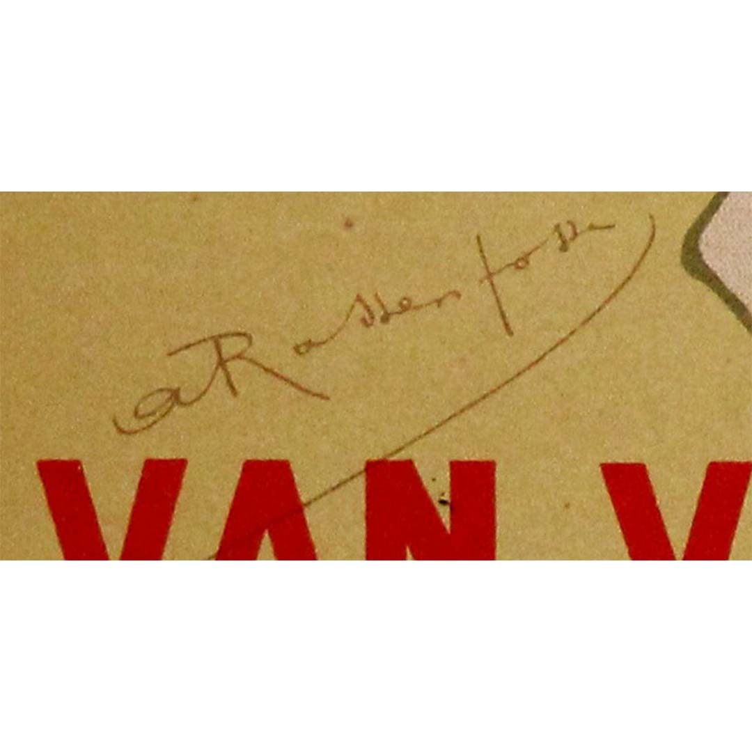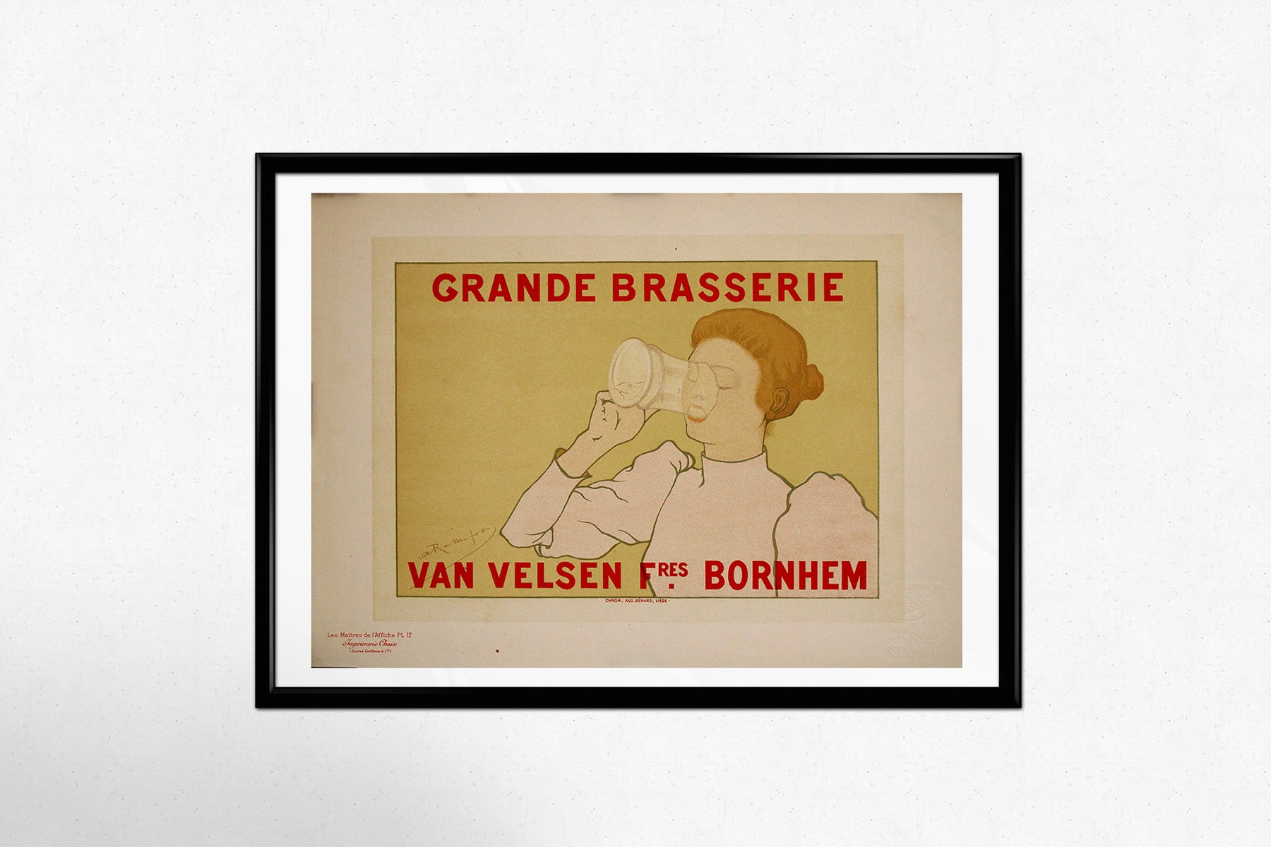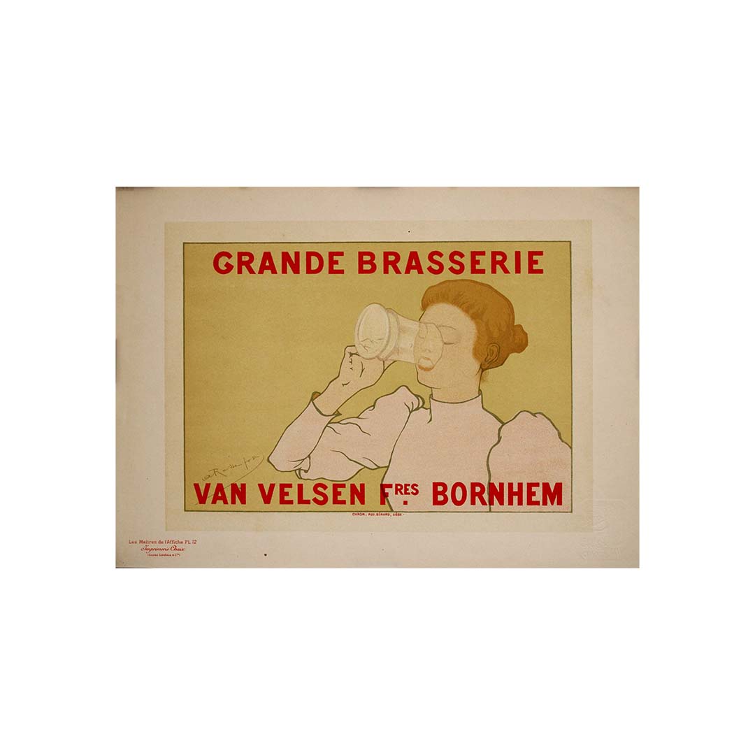 Cette création, commandée initialement pour promouvoir la brasserie Van Velsen Brothers à Bornhem, en Belgique, reflète le style visuel raffiné de Rassenfosse : délicat, élégant et d'une force discrète. Une femme rousse, aux contours subtils et aux ombres minimalistes, boit dans une grande chope de verre avec un geste élégant, presque cérémonial. Les tons pâles de sa silhouette et de sa robe contrastent délicatement avec un fond ocre feutré, tandis que la typographie rouge vif – GRANDE BRASSERIE VAN VELSEN Frères BORNHEM – apporte une touche graphique audacieuse à la composition.