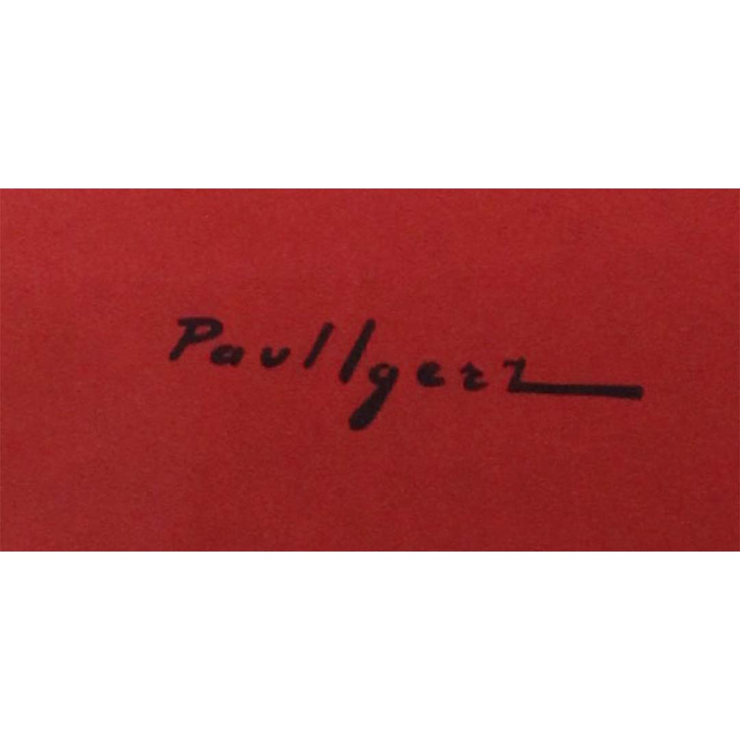 Débordante de charme et d'une sophistication espiègle, cette affiche originale et vibrante des années 1950, signée Paul Igert, capture l'essence même de la publicité française pour les liqueurs dans ce qu'elle a de plus fantaisiste. Créée pour l'emblématique Prunelle du Velay , un digestif à base de prunes produit depuis 1860, elle met en scène une jeune femme stylisée, aux yeux écarquillés, vêtue d'un costume traditionnel, offrant avec joie une bouteille nichée dans un panier de prunelles.