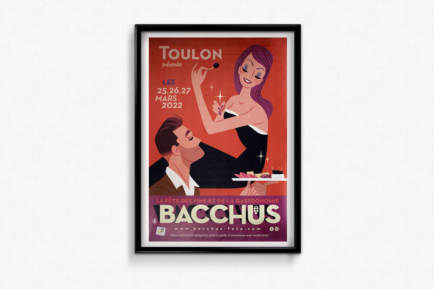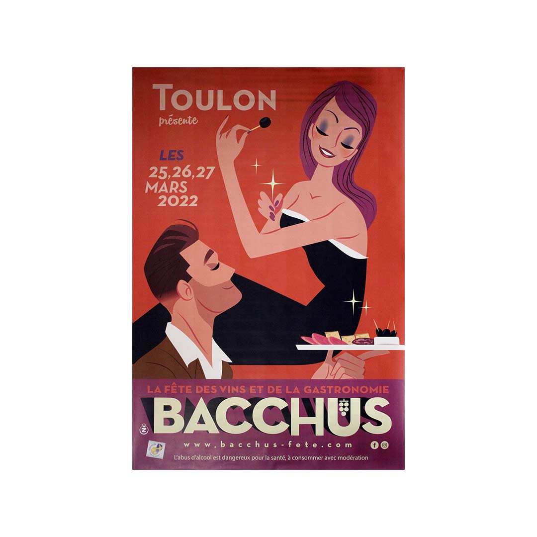 Cette affiche originale et dynamique de 2022 annonce le festival Bacchus , qui se tiendra à Toulon du 25 au 27 mars, et est illustrée dans le style inimitable du graphiste français Monsieur Z. Reconnu pour son esthétique rétro-futuriste et son design élégant inspiré du milieu du siècle, Monsieur Z capture l'esprit de la joie de vivre à la française avec des couleurs vives, des figures stylisées et une élégance impeccable.
