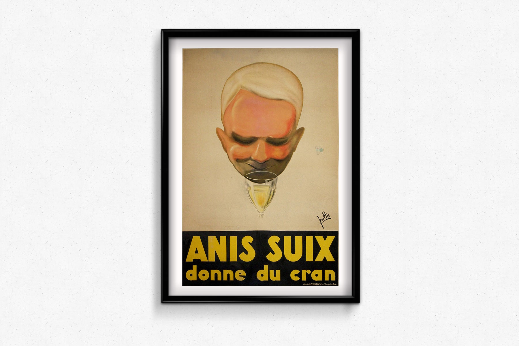 Cette affiche publicitaire originale de 1929 pour Anis Suix , illustrée par l'artiste français Jean Hée, est saisissante et incarne l'esprit audacieux et ludique de l'art publicitaire du début du XXe siècle. Le slogan « donne du cran » est associé à une caricature expressive d'un homme souriant et sûr de lui, contemplant un verre de liqueur anisée.