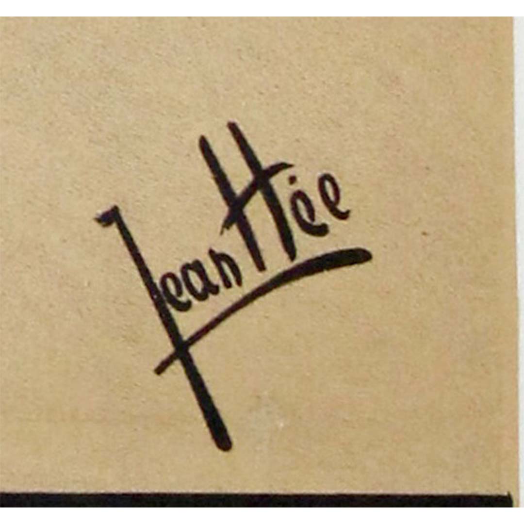 Jean Hée, célèbre pour ses caricatures et ses satires visuelles, signe ici une affiche à la fois humoristique et raffinée, qui saisit avec justesse la fantaisie du produit et l'élégance stylistique de son époque. Rare et charmante illustration de la publicité française pour les boissons, elle date de l'âge d'or de l'affiche lithographique.