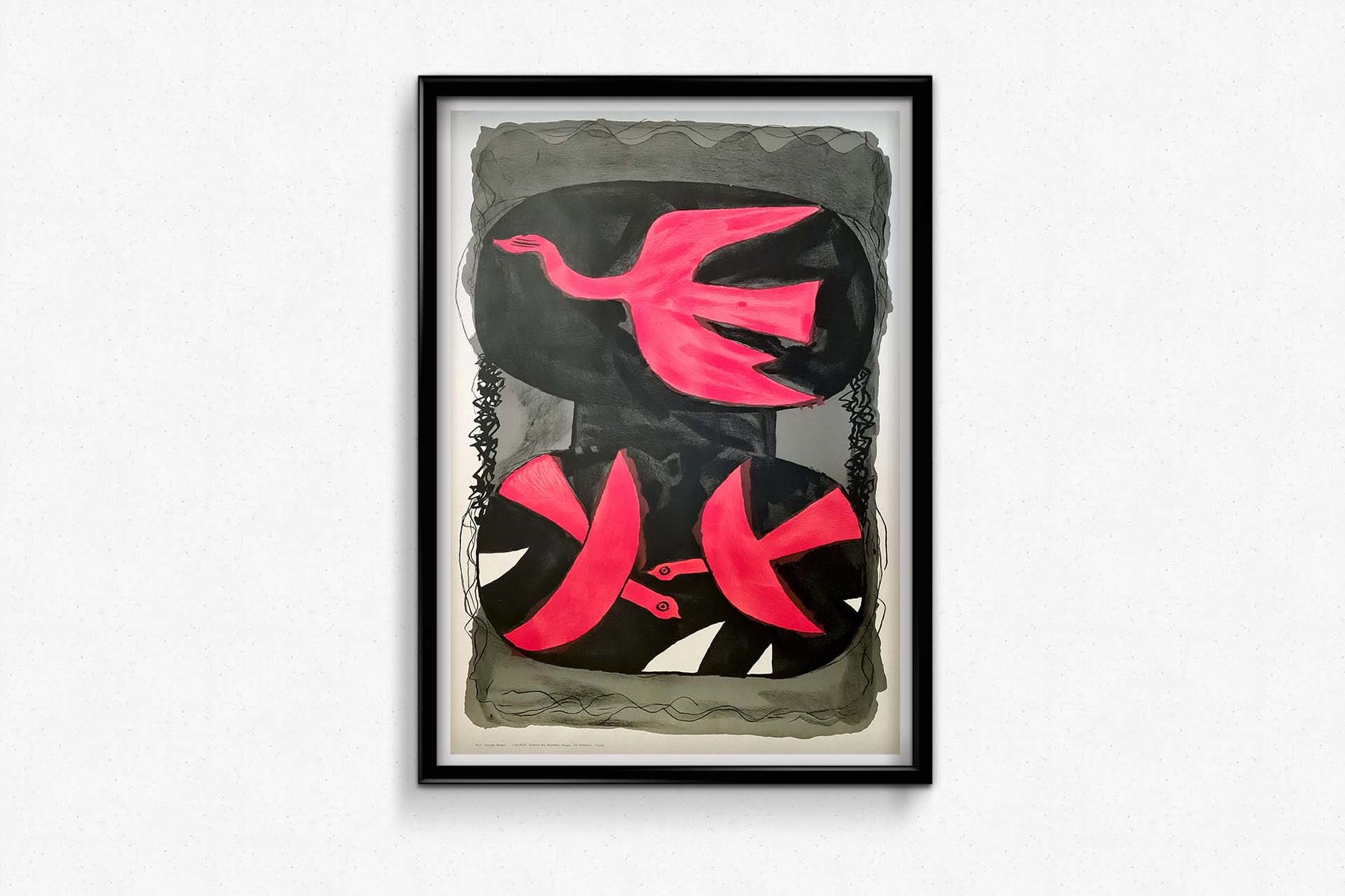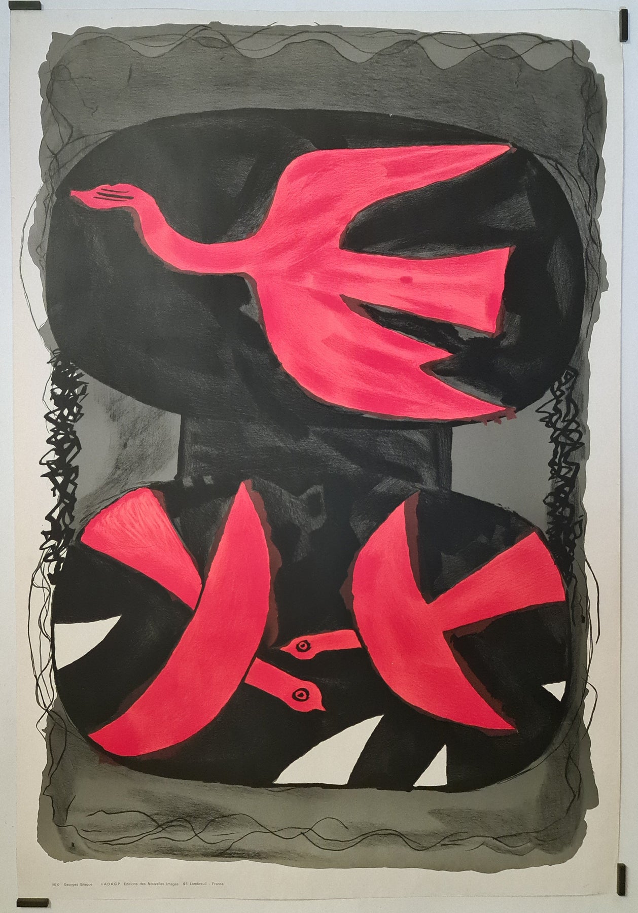 L'affiche originale de Georges Braque, intitulée Trois Oiseaux , datant d'environ 1960, est une illustration classique du style si particulier de l'artiste. Braque, l'un des pionniers du cubisme aux côtés de Pablo Picasso, est reconnu pour son approche novatrice de la forme, de la couleur et des relations spatiales. Dès les années 1960, Braque s'est affranchi de ses premières œuvres cubistes pour développer un langage visuel plus lyrique et symbolique, souvent centré sur les oiseaux et autres motifs naturels.