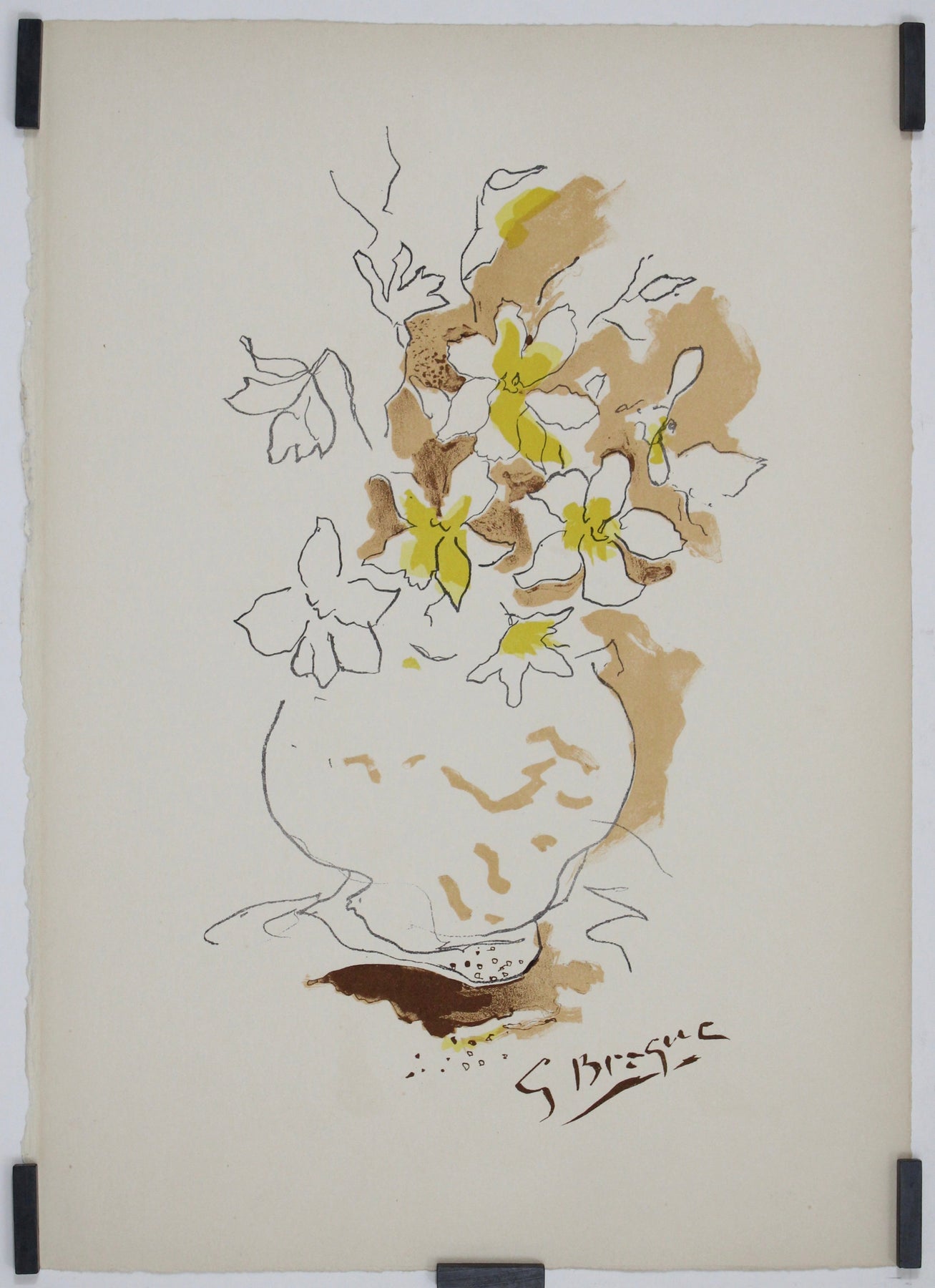 La lithographie présente un bouquet de fleurs éclatant, rendu dans une riche palette de couleurs qui semblent danser sur le papier. La maîtrise de la lithographie par Braque est manifeste dans la finesse et la précision des lignes et des textures qui définissent chaque pétale et chaque feuille. La composition, à la fois harmonieuse et dynamique, invite le spectateur à explorer les subtilités de chaque élément floral.