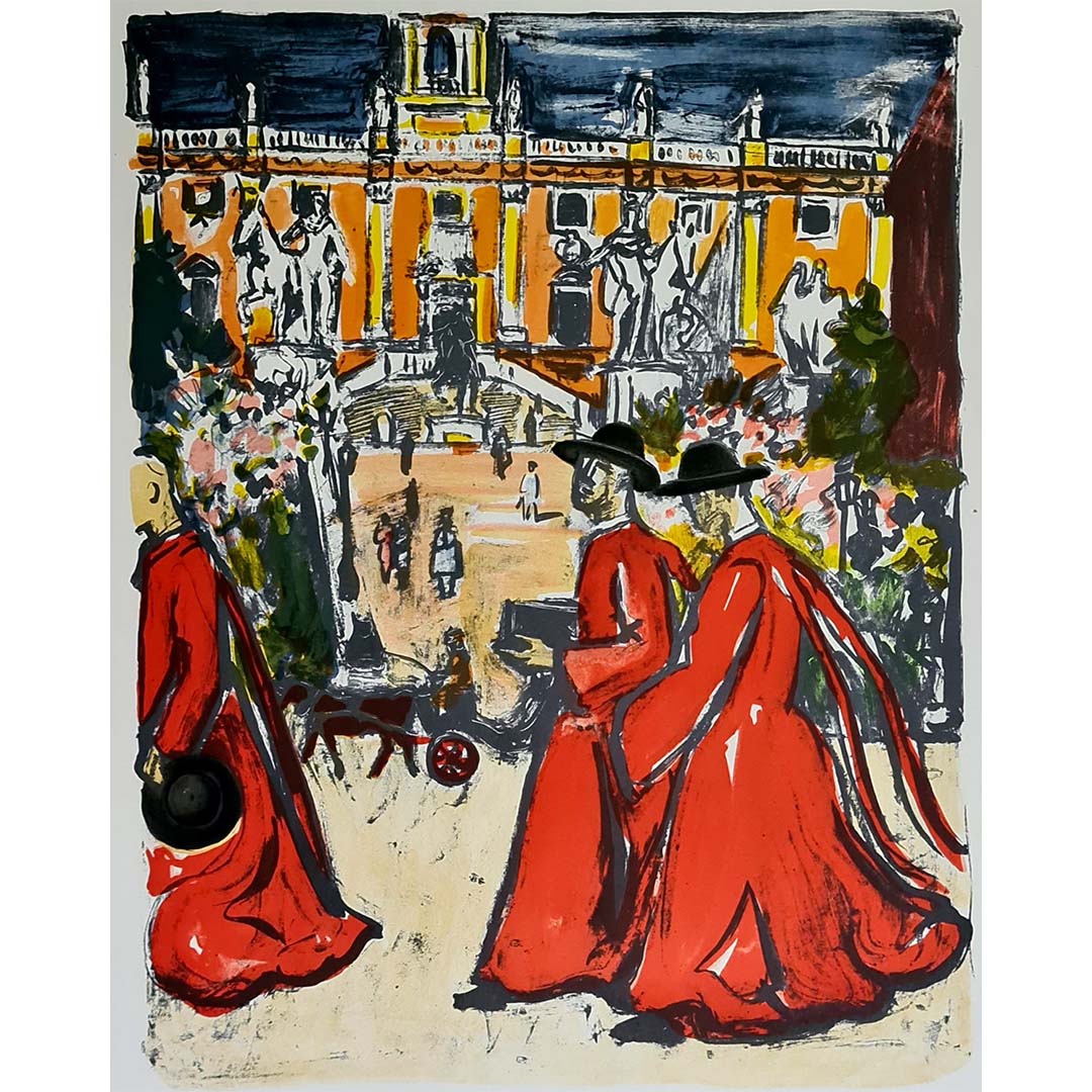 L'œuvre reproduite sur cette affiche, « Les Cardinaux en Italie », présente une scène saisissante de cardinaux italiens en robes rouges, traversant une place historique, peut-être inspirée de Rome ou de Naples. Les chaudes teintes ocre du grand palais en arrière-plan contrastent magnifiquement avec les rouges profonds et les noirs des tenues des cardinaux. Le trait fluide et presque spontané de Brayer donne vie à la scène, évoquant un sentiment de mouvement et une élégance intemporelle.