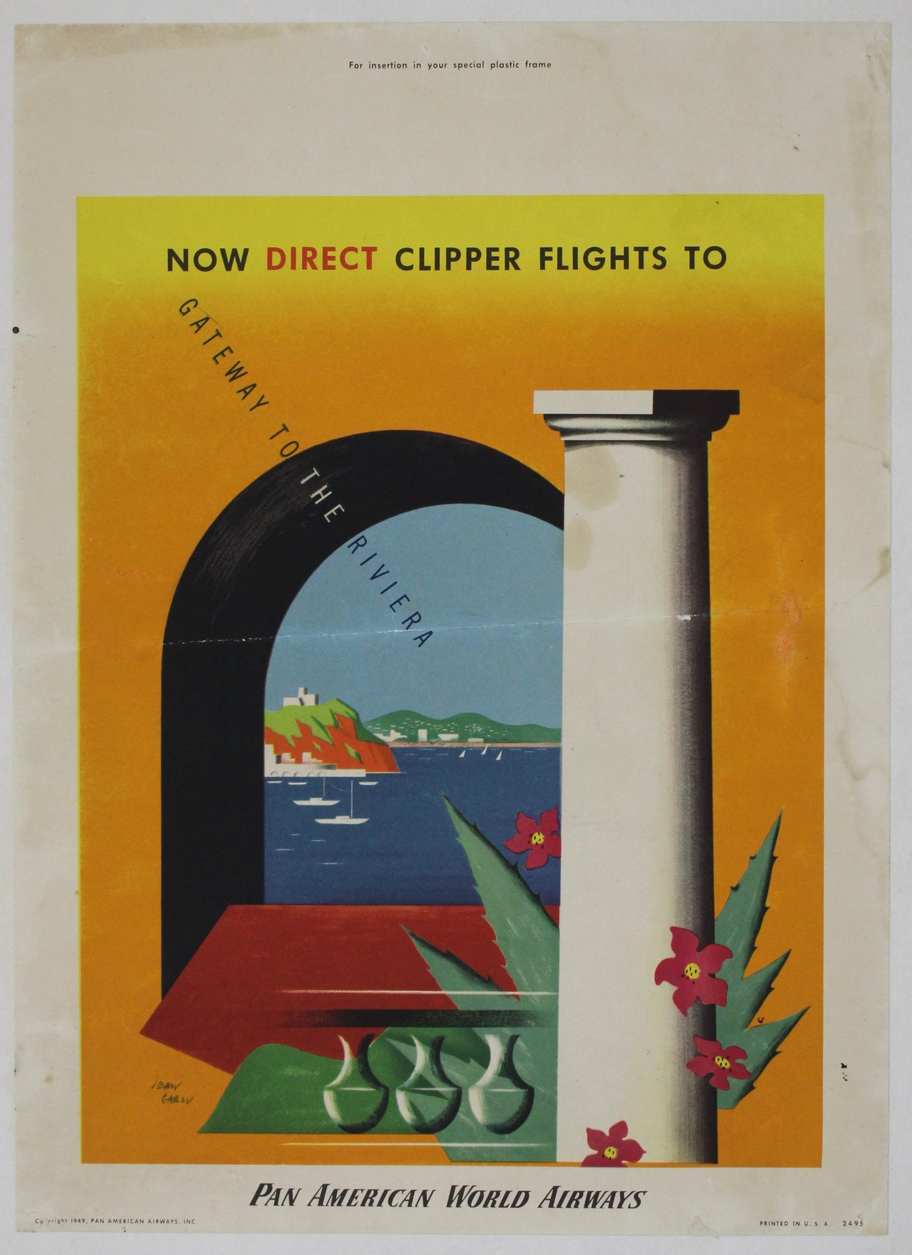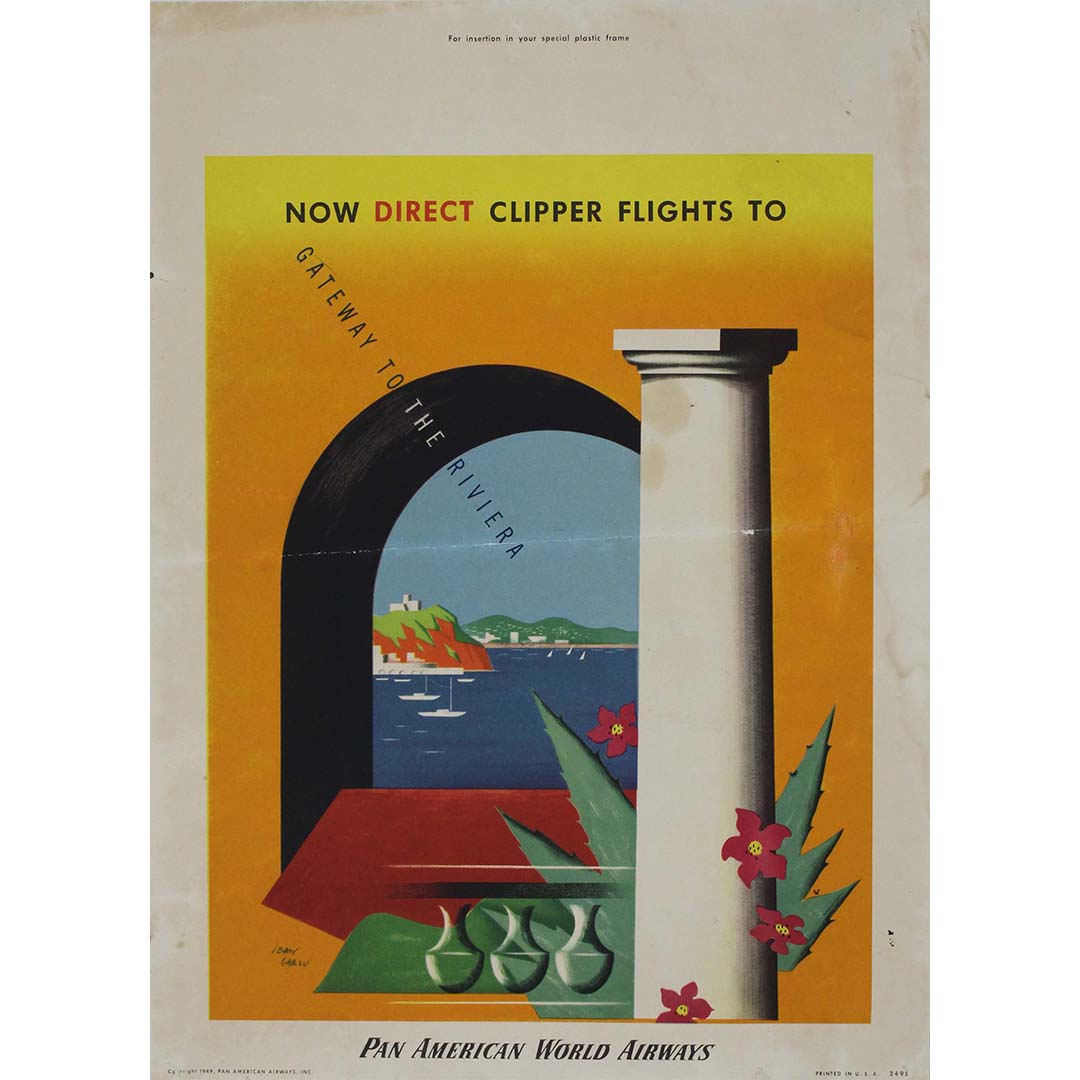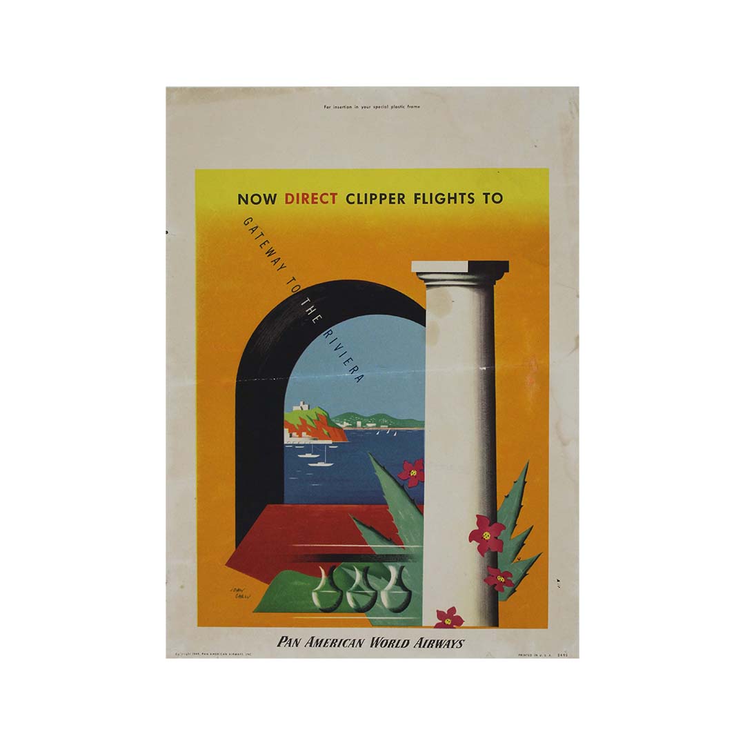 Sur cette affiche, Carlu capture avec brio le charme de la Côte d'Azur, destination de choix pour les voyages de loisirs et de luxe. On y voit un couple élégant descendre d'un avion Pan American, avec la côte méditerranéenne en arrière-plan. L'azur des eaux, les palmiers et l'architecture emblématique évoquent l'ambiance ensoleillée et le charme cosmopolite qui font la renommée de la Riviera.