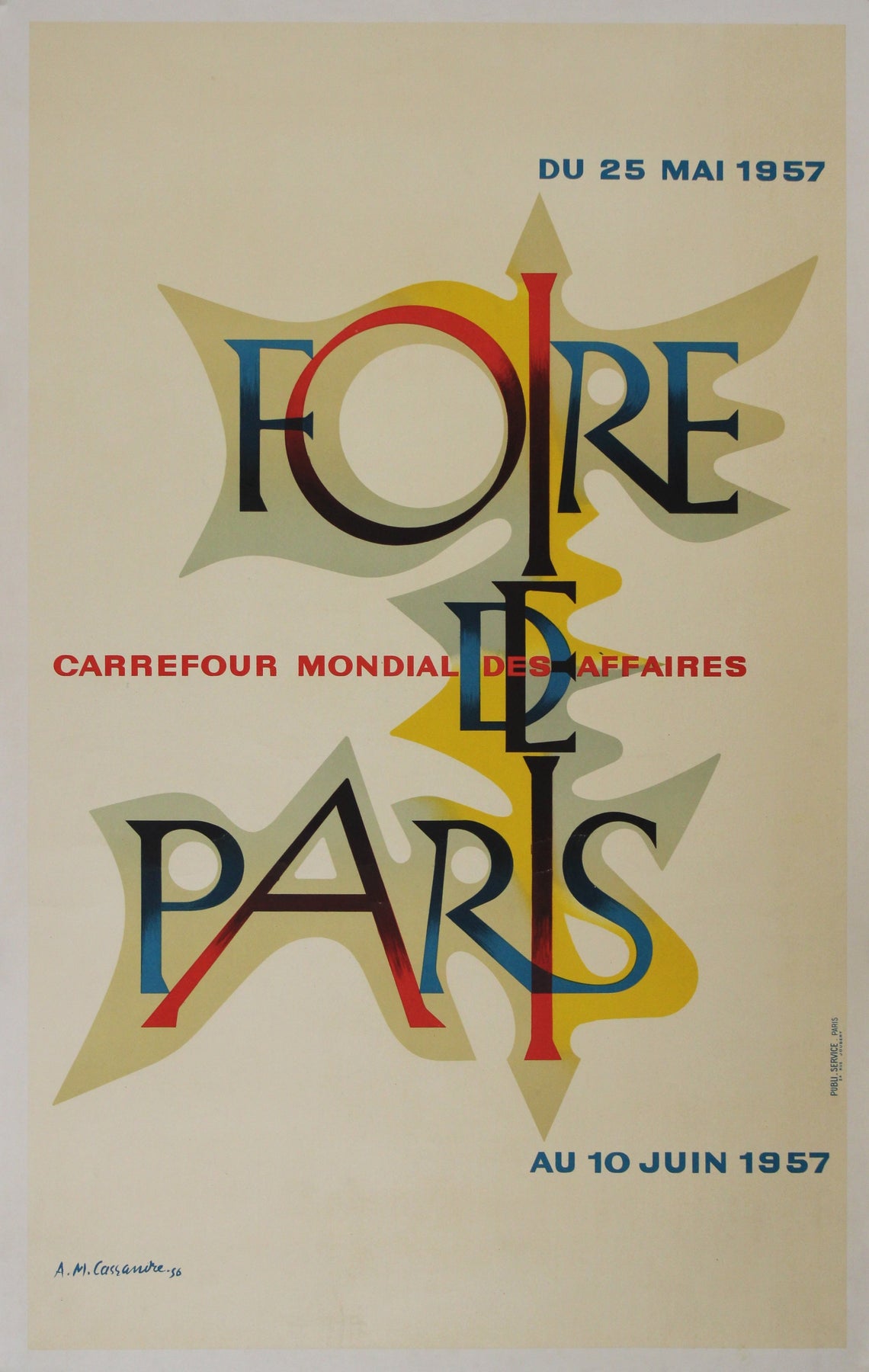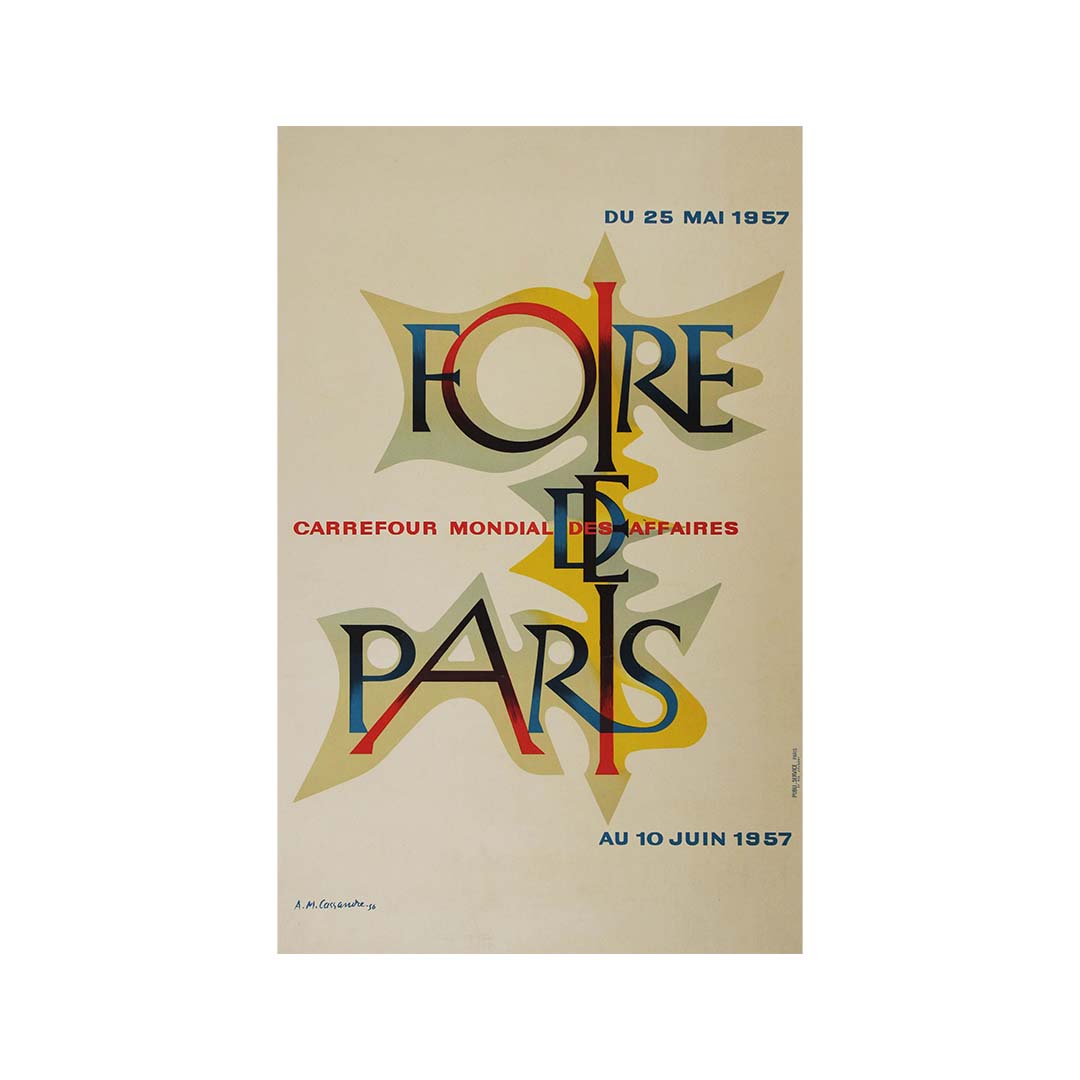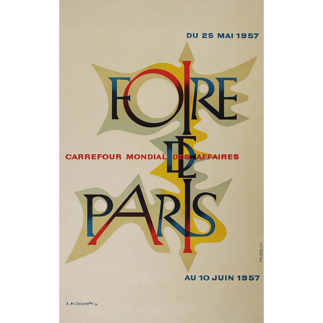 Prix régulier €1.500,00L'affiche originale de 1957, conçue par A.M. Cassandre pour la « Foire de Paris Carrefour mondial des affaires », constitue un exemple remarquable de l'art publicitaire du milieu du XXe siècle et témoigne du dynamisme de la France d'après-guerre. A.M. Cassandre, graphiste français de renom, est reconnu pour son talent à allier innovation artistique et impact commercial, et cette affiche illustre parfaitement sa maîtrise du design.